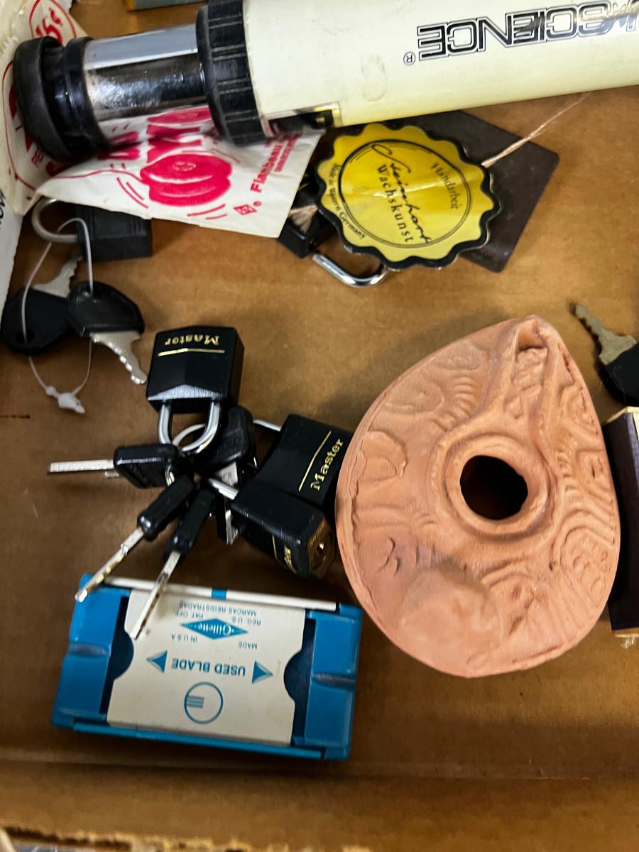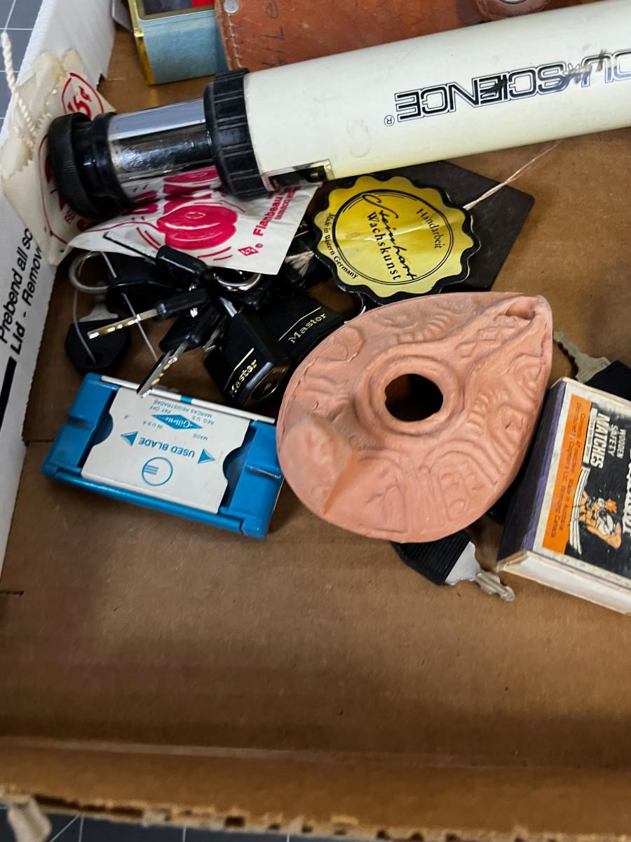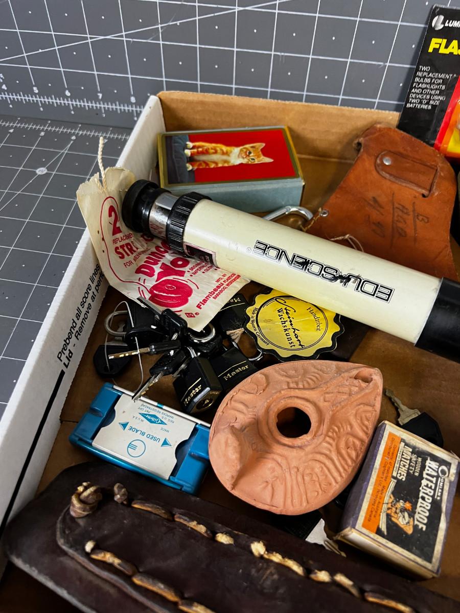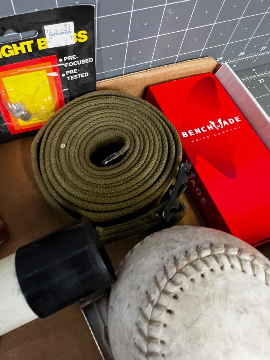 Tray of Interesting Masculine Items: Sheath, Baseball, Knife Boxes (Empty)