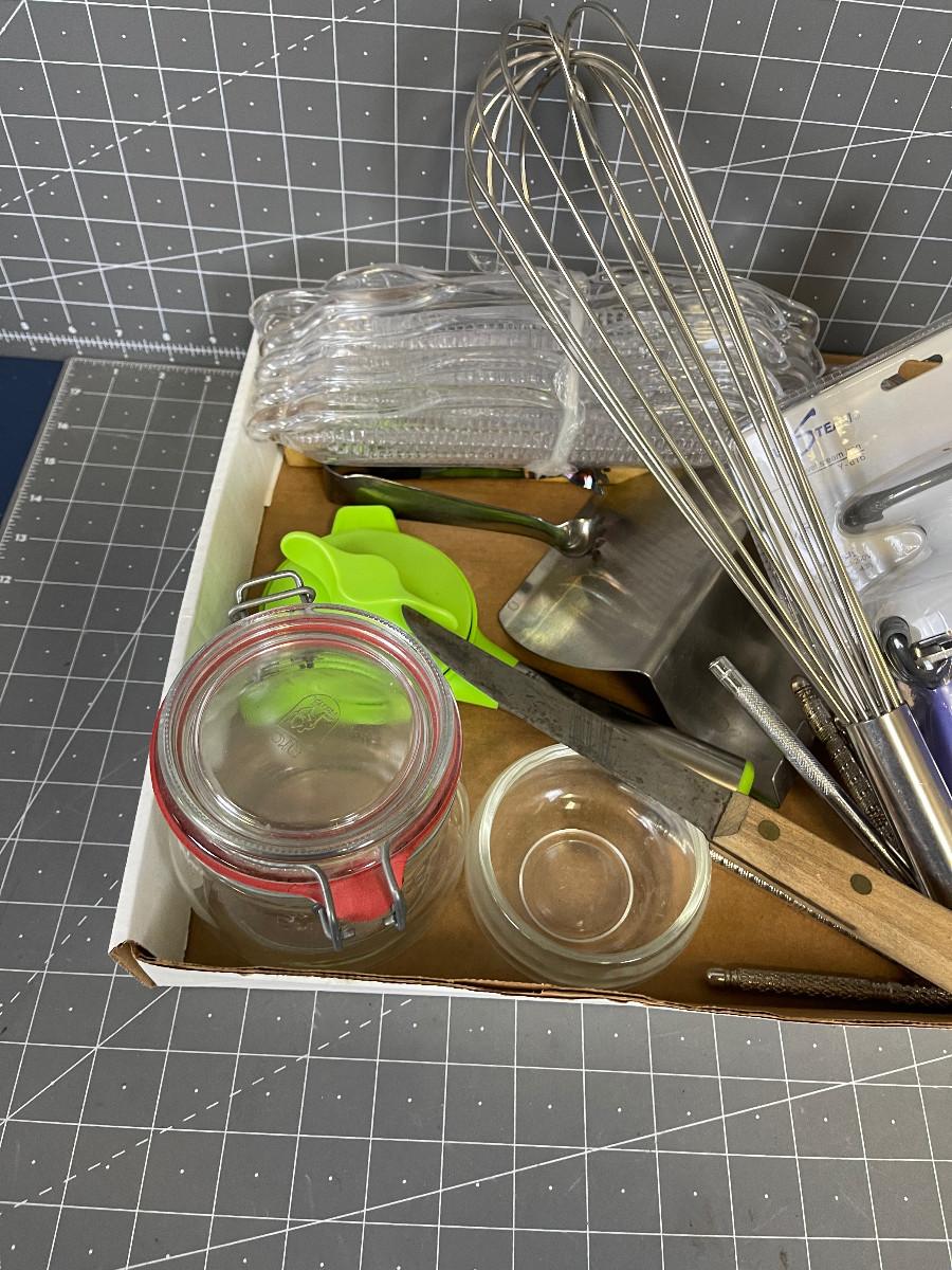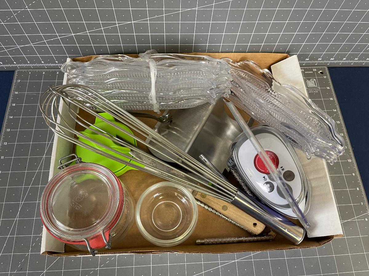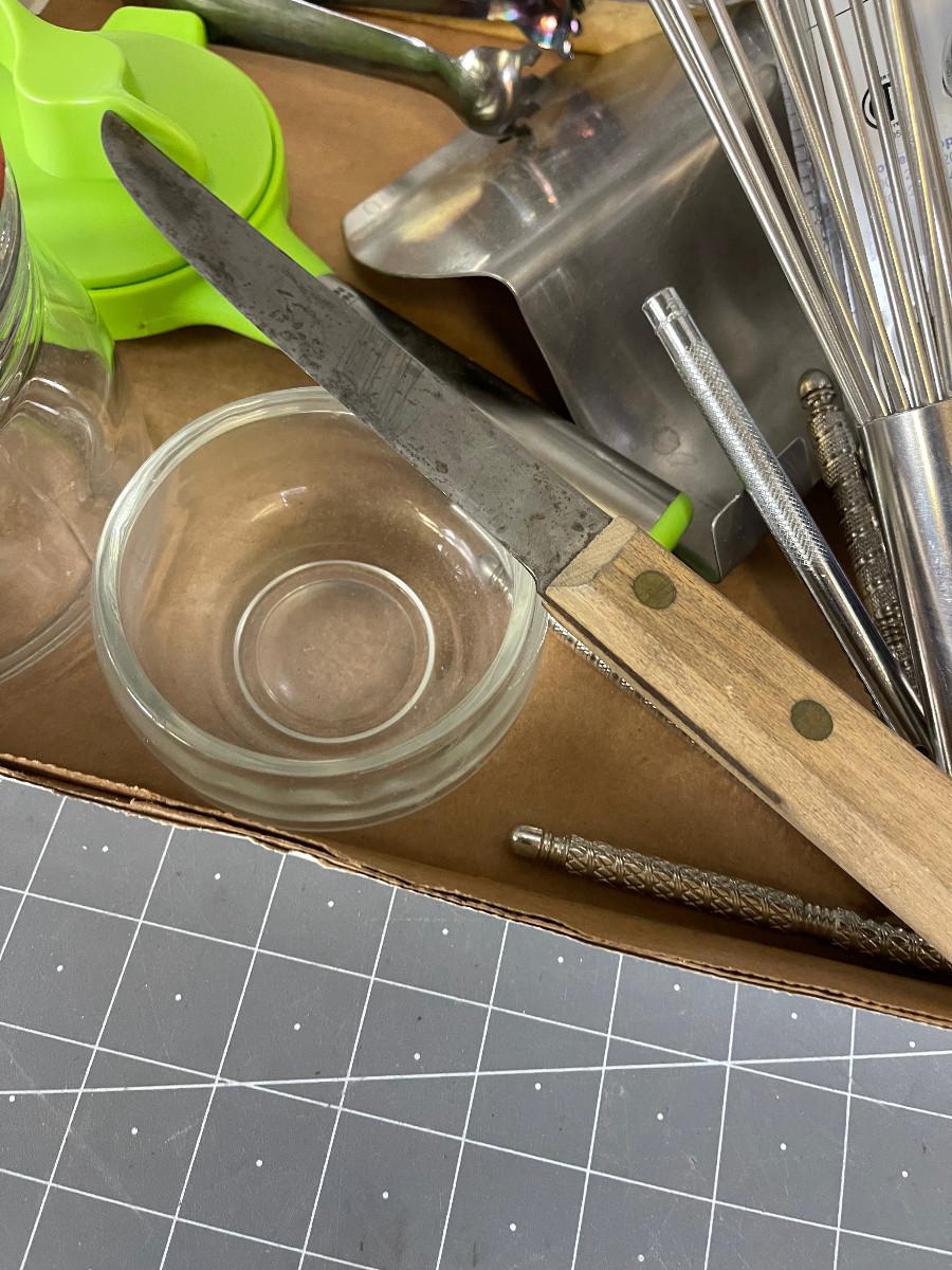 Tray of Kitchen Items: Can Opener, Knife, Corn Holders