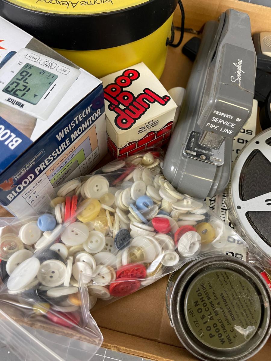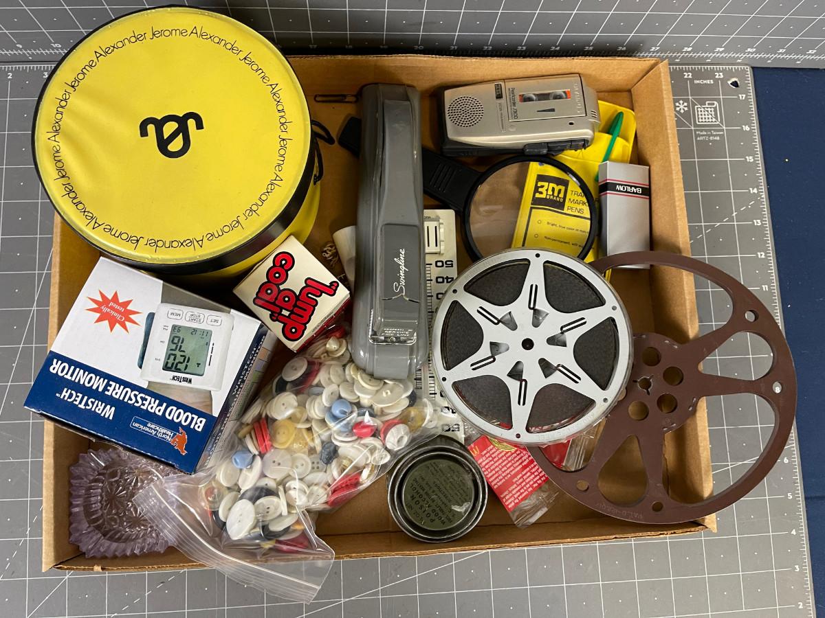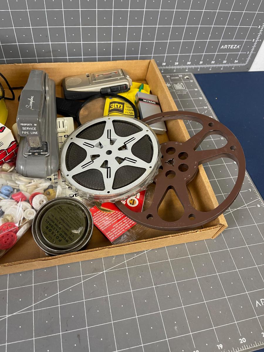 Tray of Misc.: Stapler, Tape Recorder, Buttons