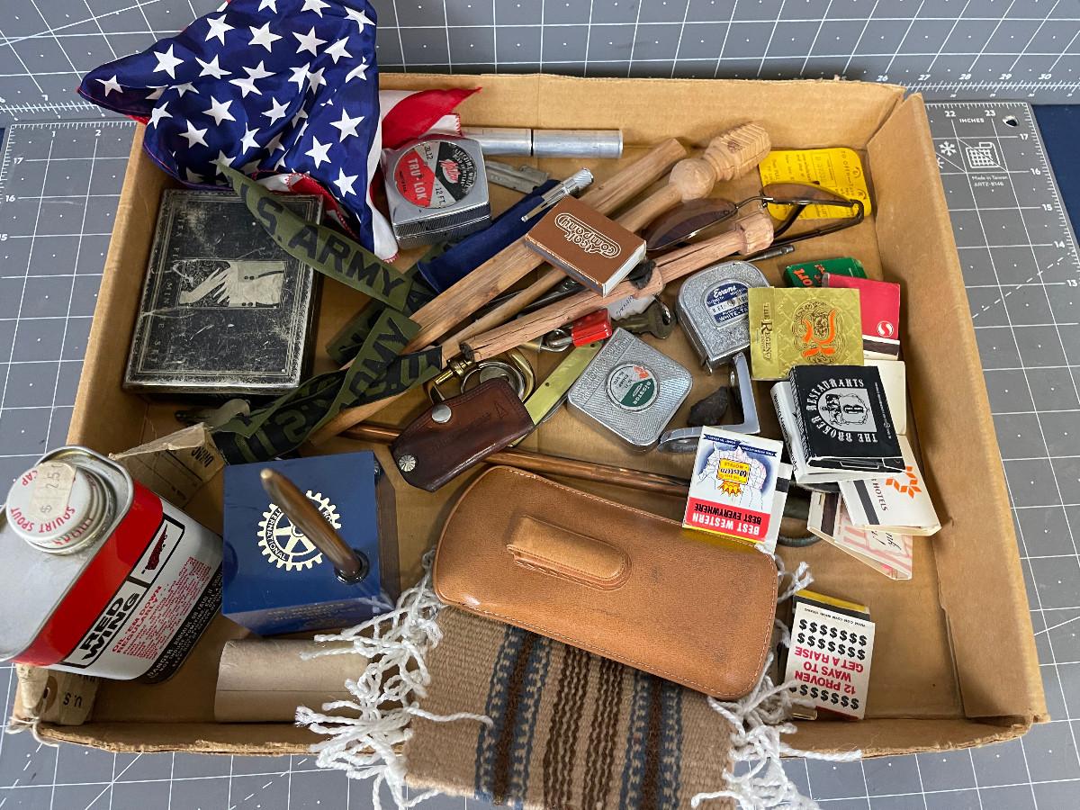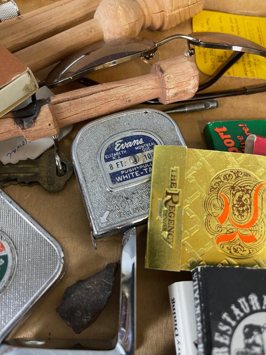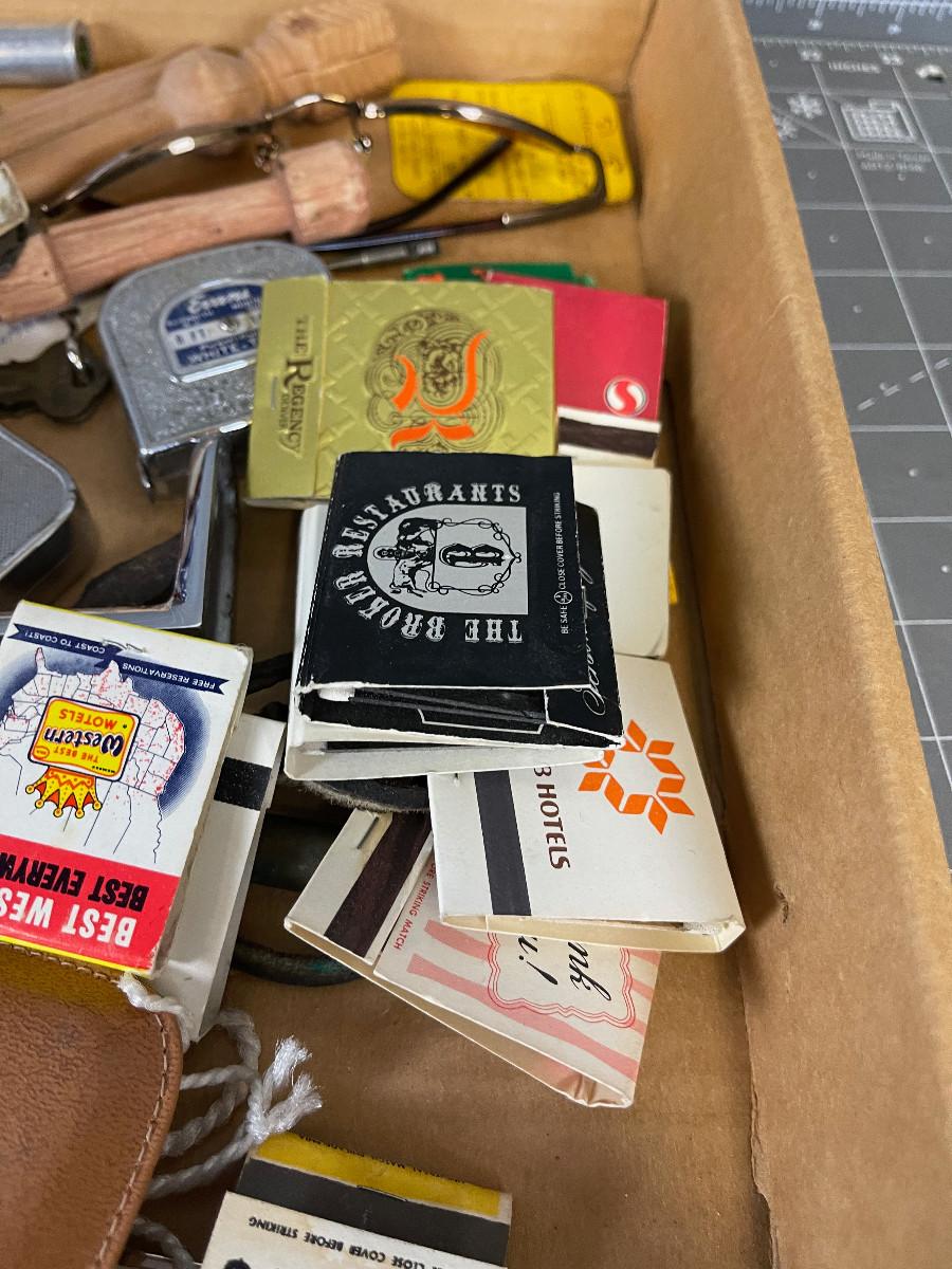 Tray of Music. Items: Matches, Sun Glasses, Tin Box