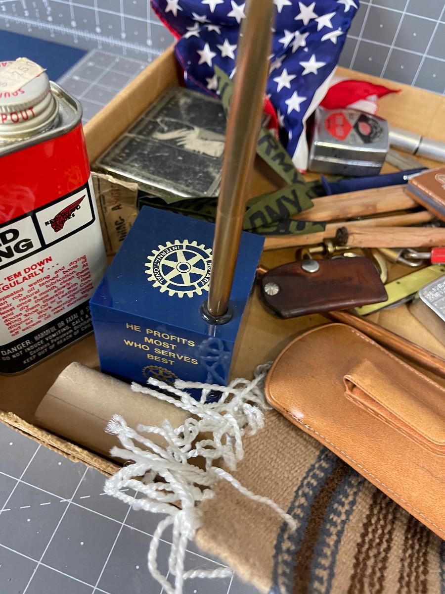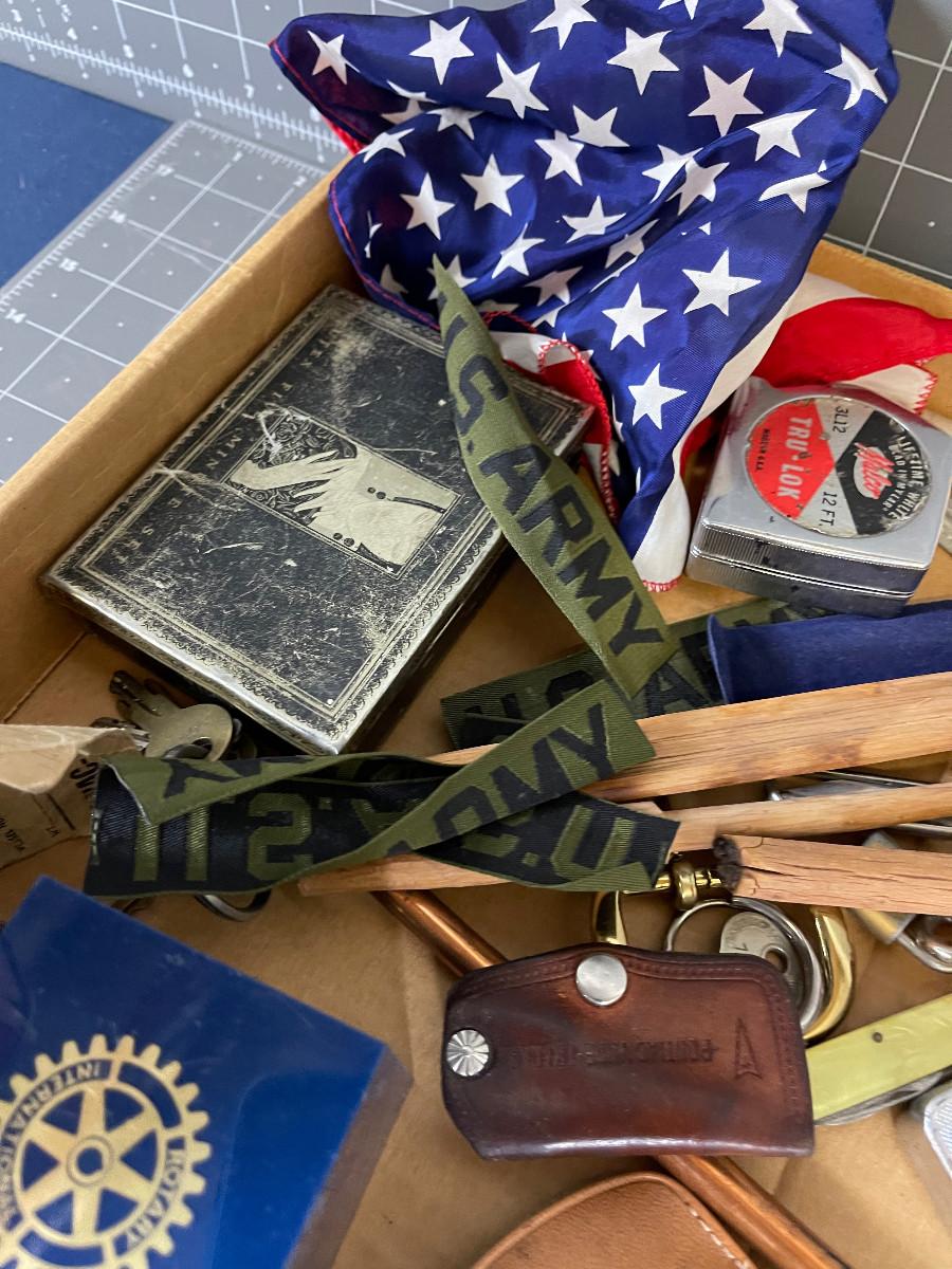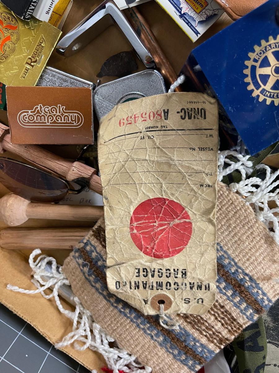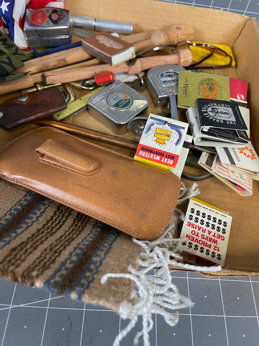 Tray of Music. Items: Matches, Sun Glasses, Tin Box