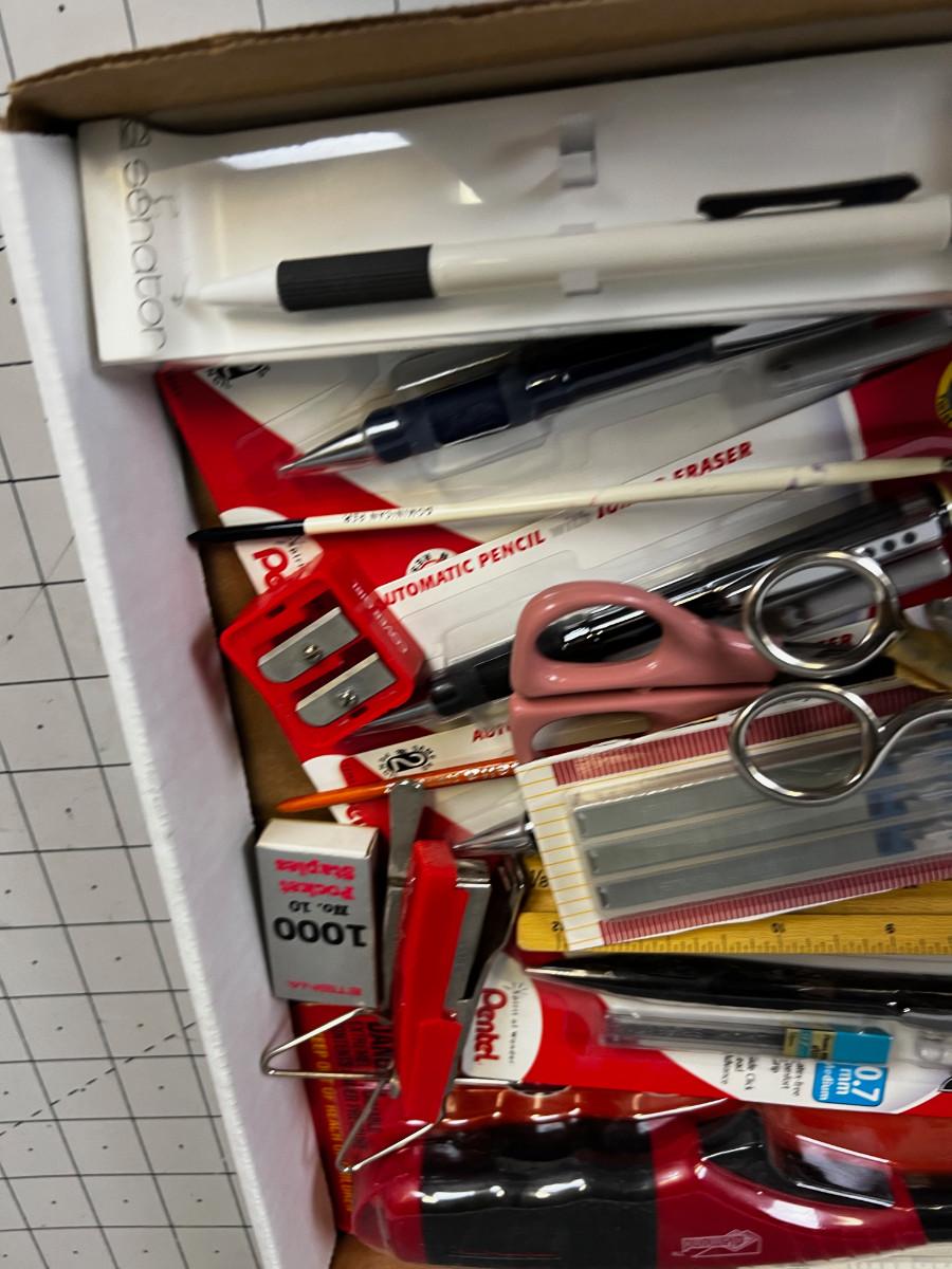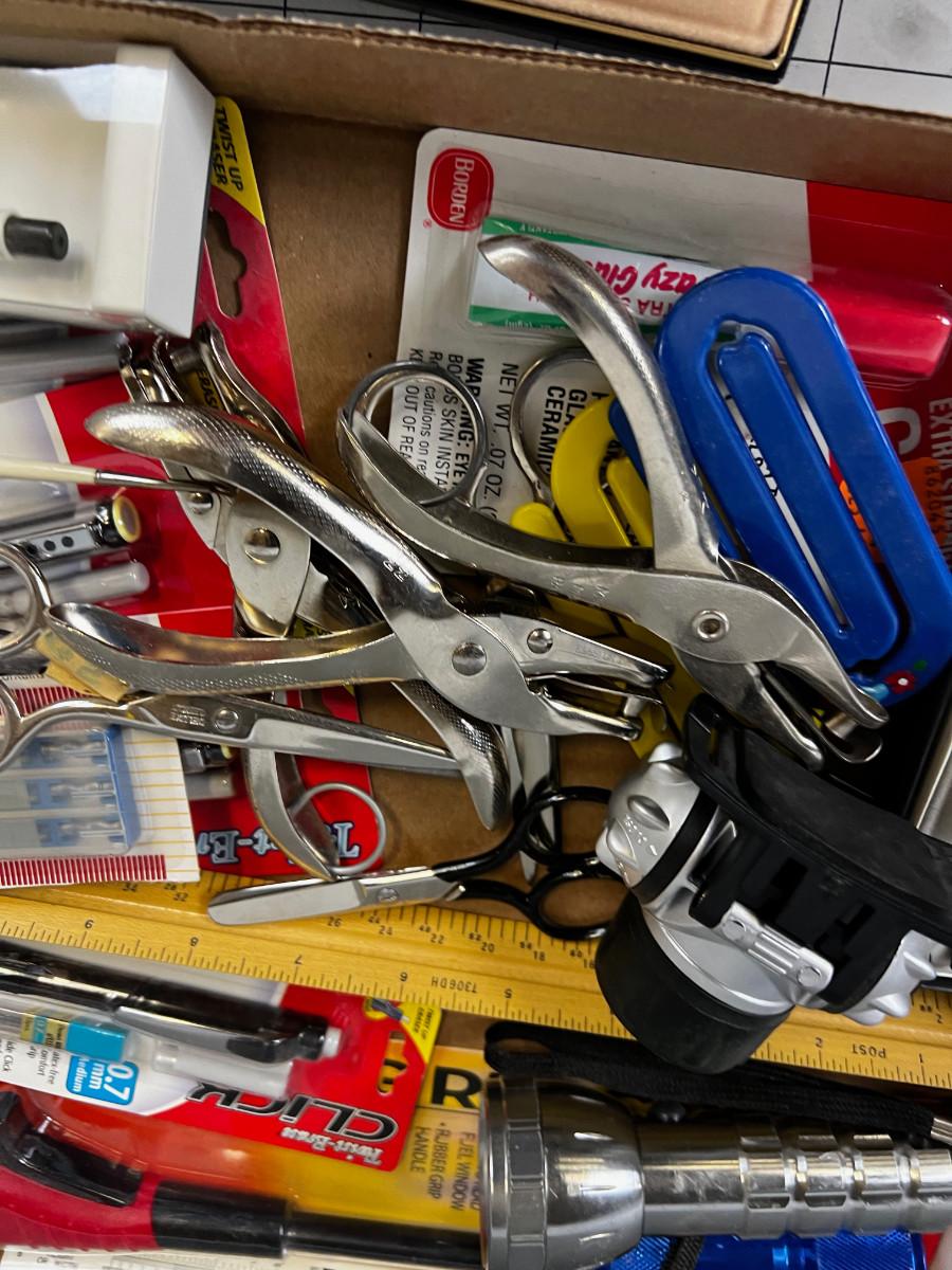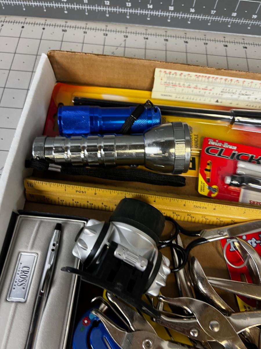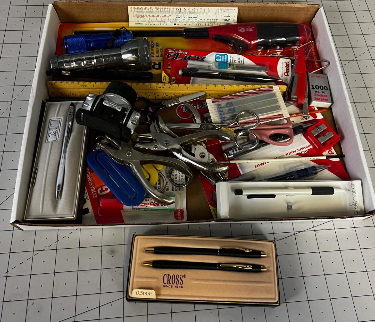 Tray of Office Things: Paper Punch, Scissors, Pens, Flash Lights