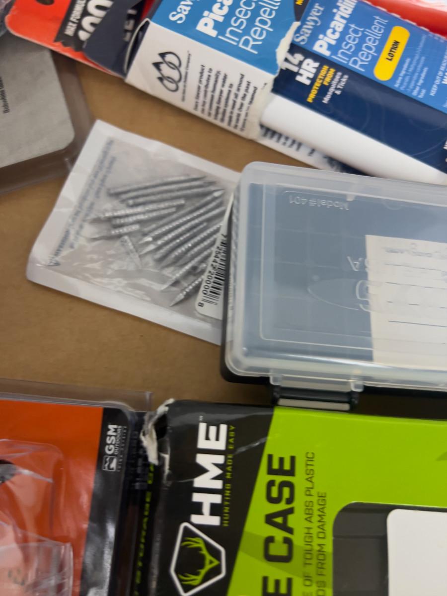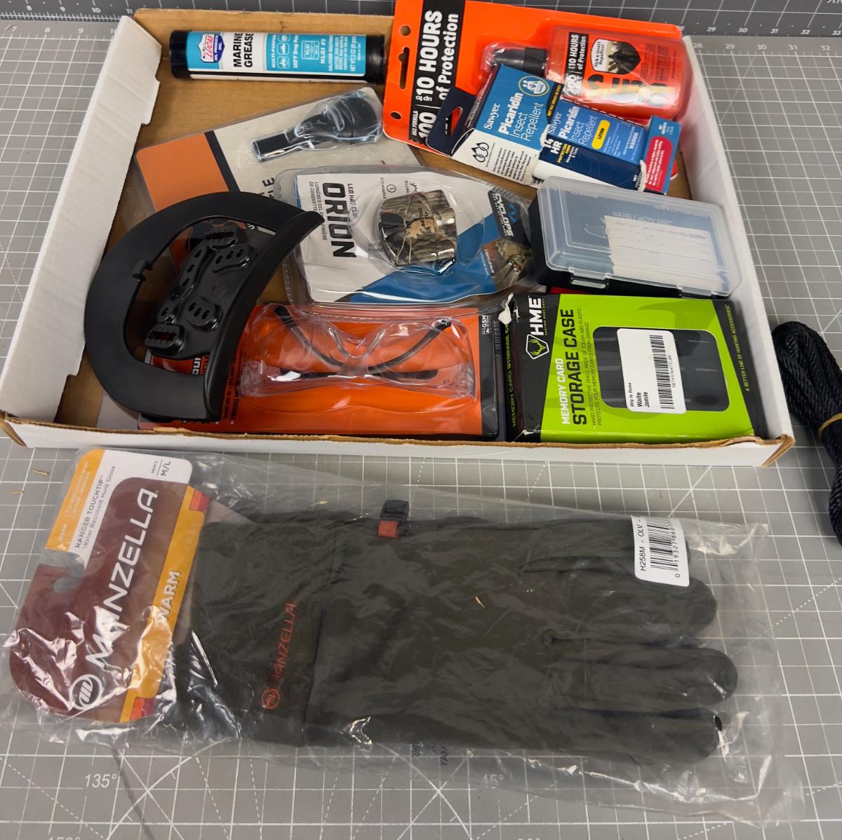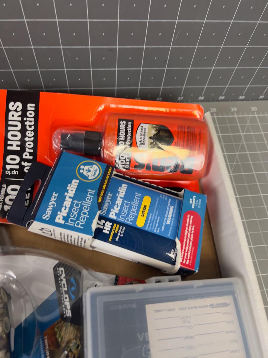 Tray of Outdoor Items: Bug Spray, Safety Glass, etc.