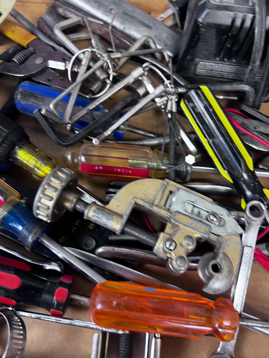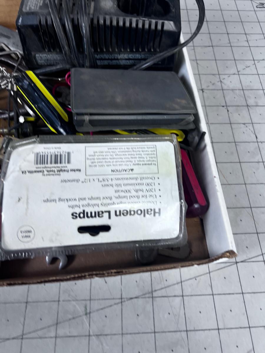 Tray of Stuff; Hand Tools, Battery Charger, Light Bulb