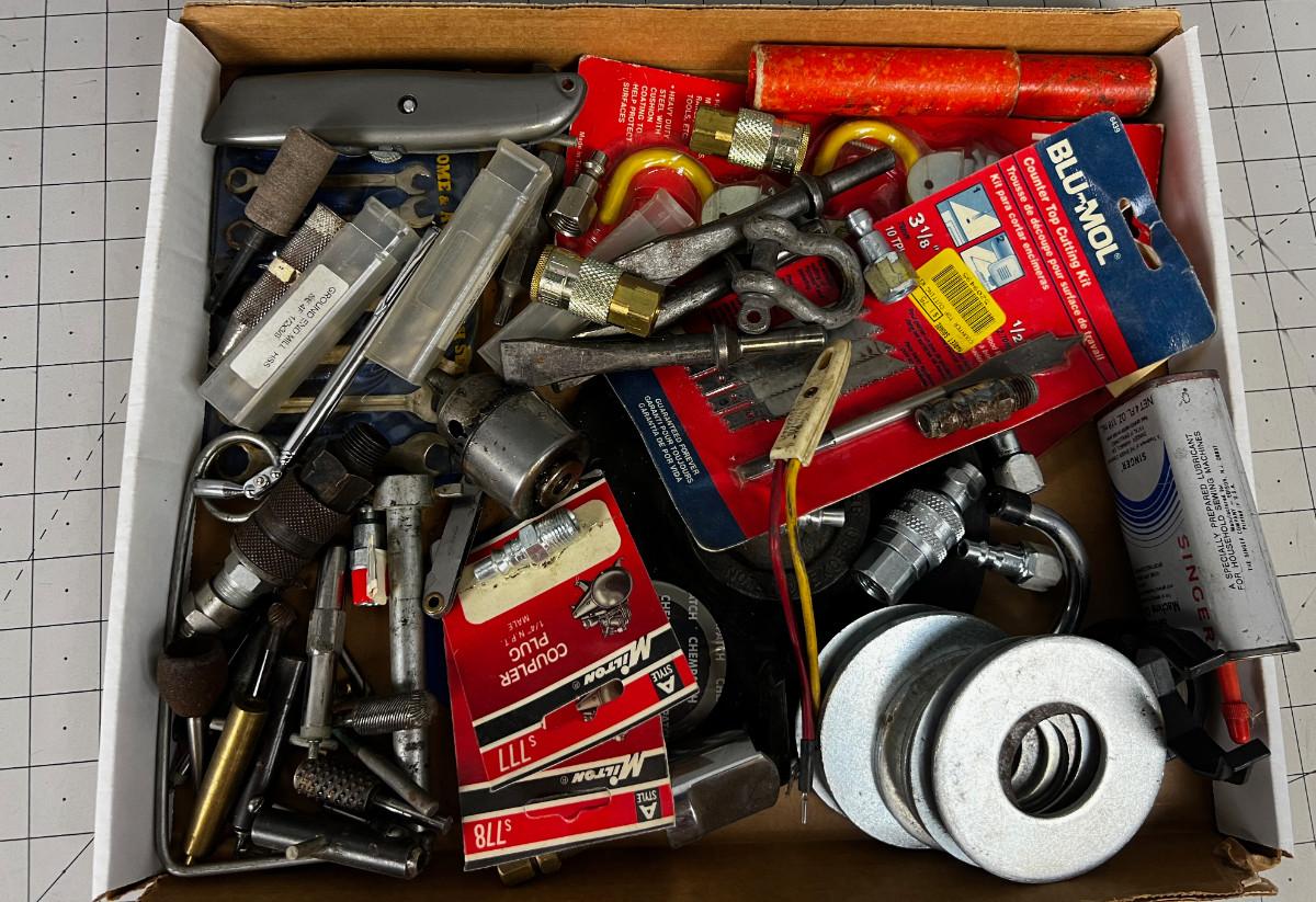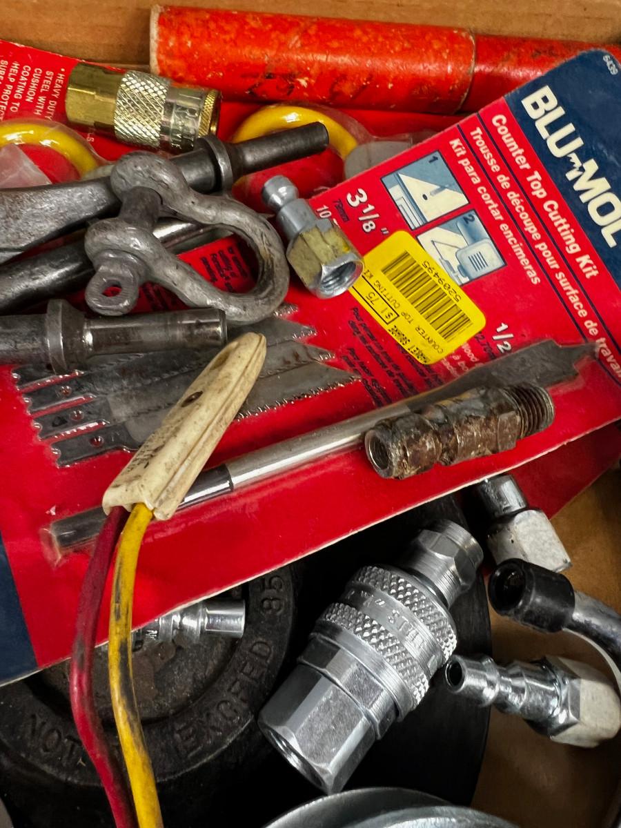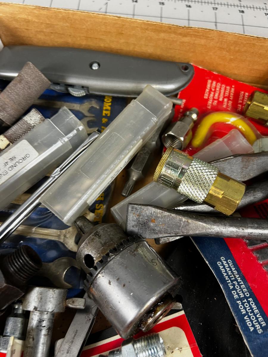 Tray of Tools and Bits: Saw Blade, Punches, Air Chuck