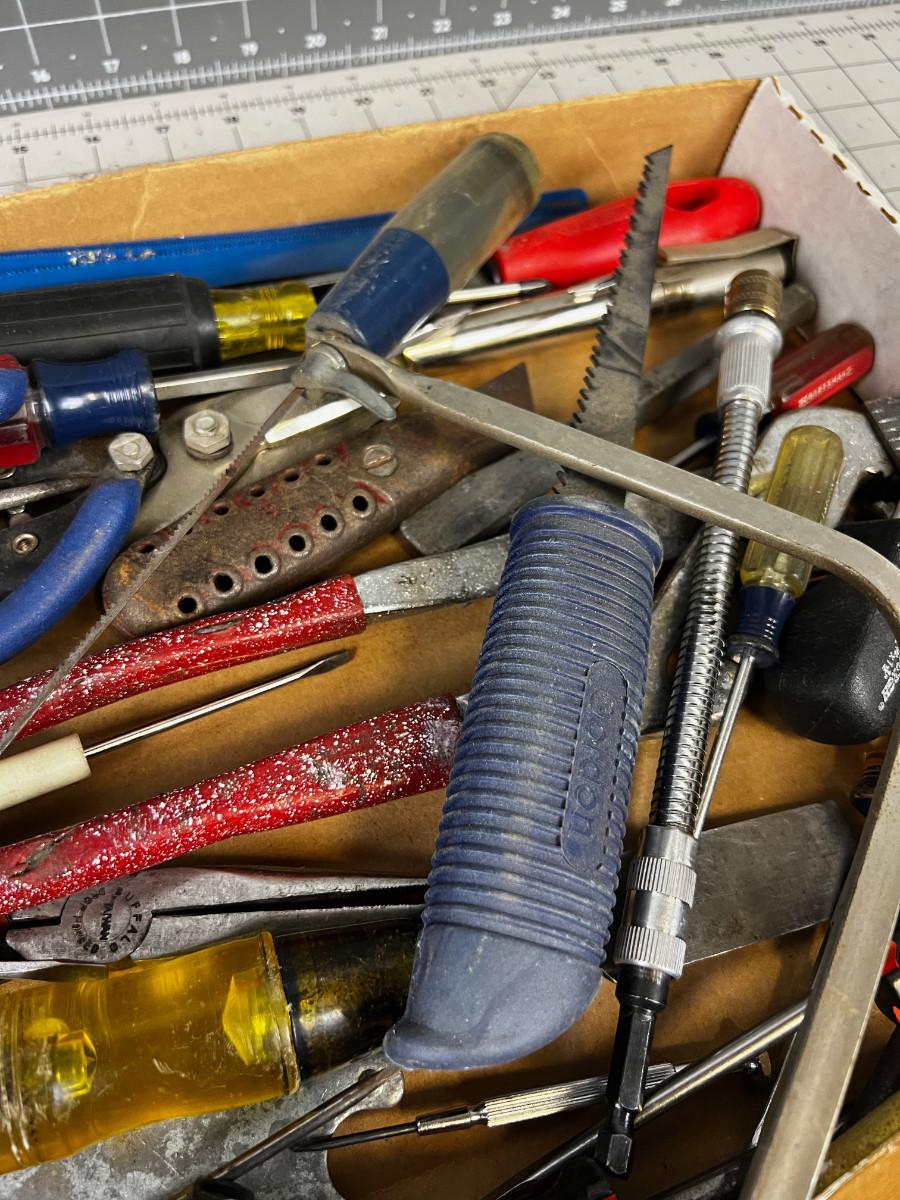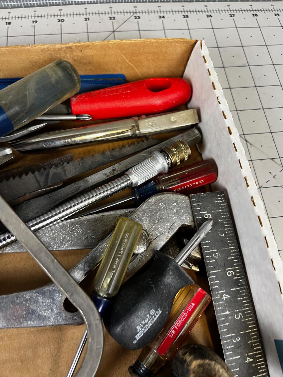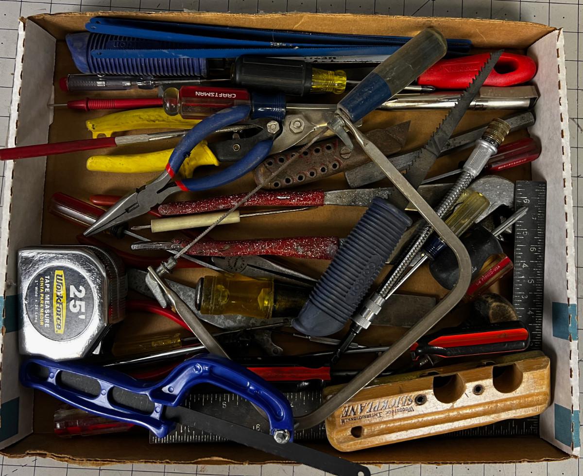 Tray of Tools: Coping Saw, Chisel, Square, Needle Nose etc.