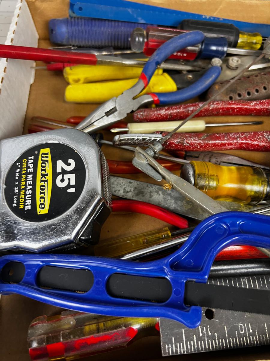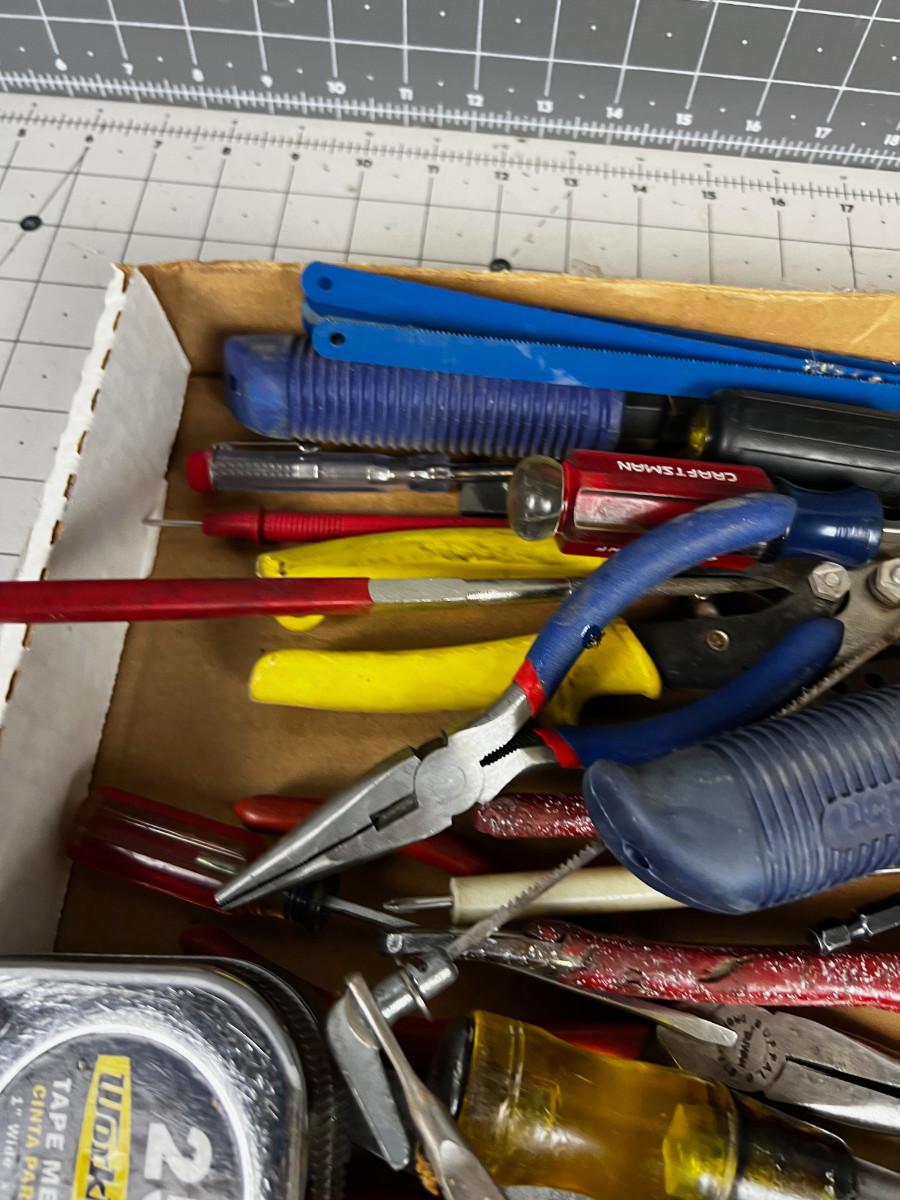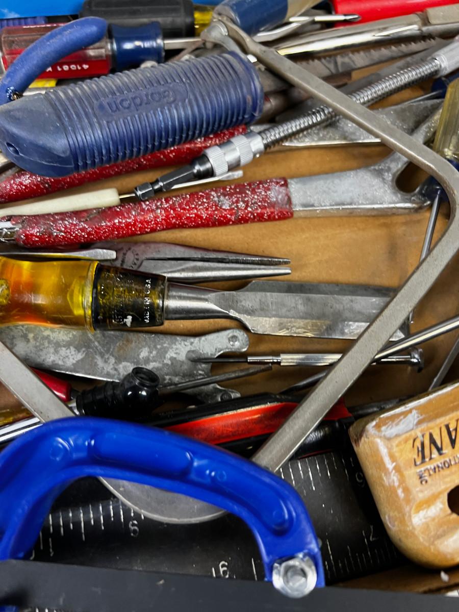 Tray of Tools: Coping Saw, Chisel, Square, Needle Nose etc.