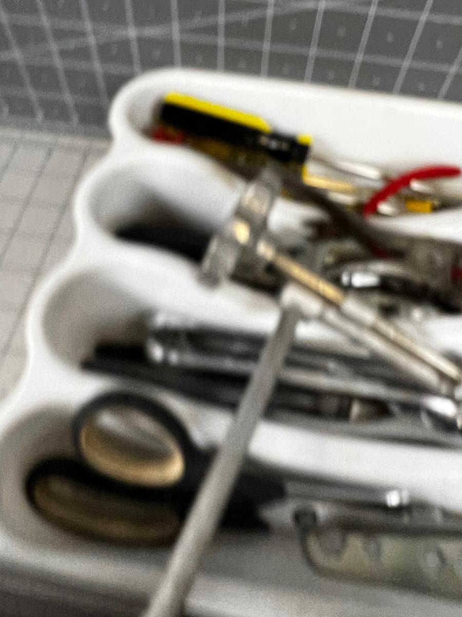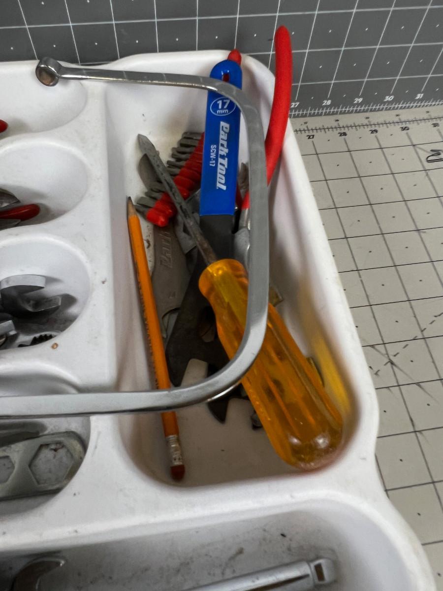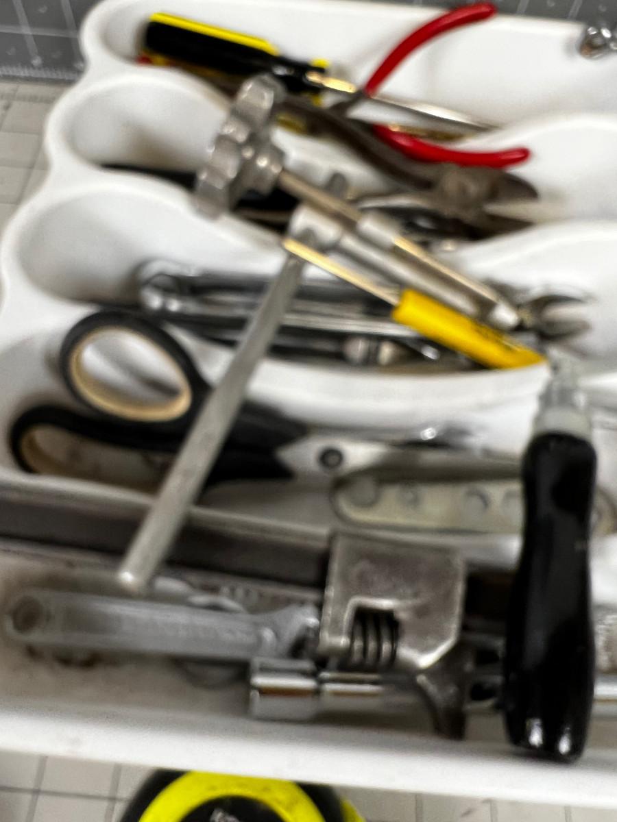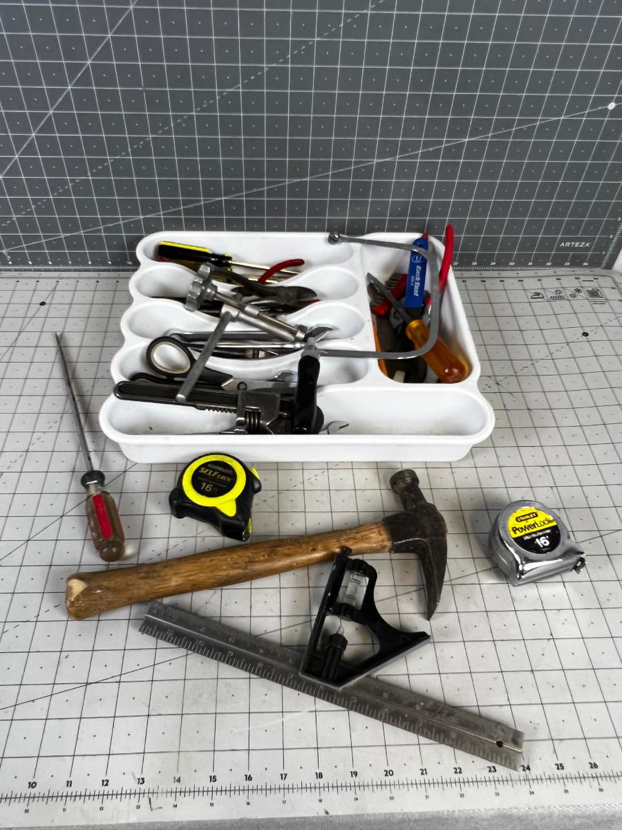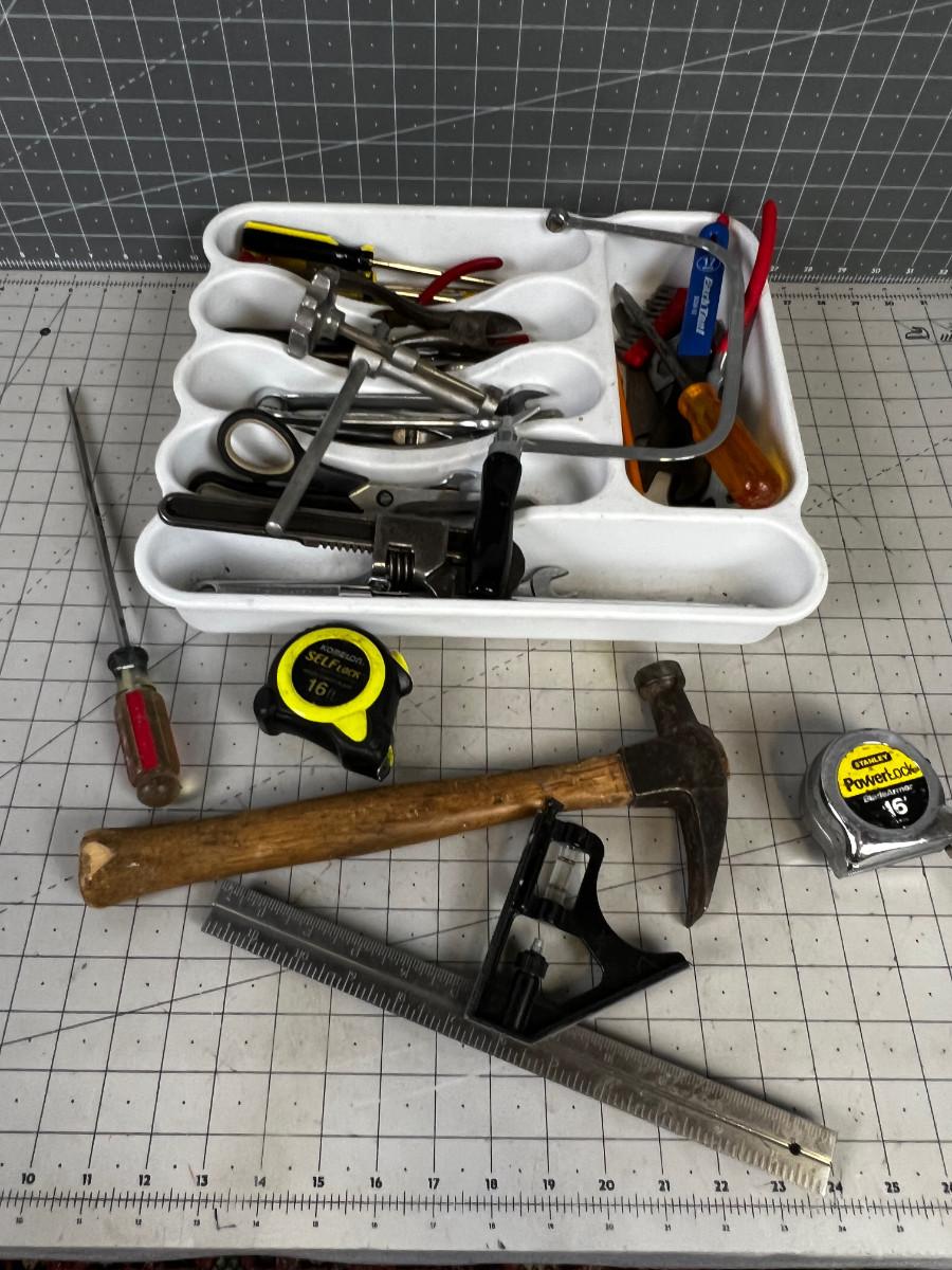 Tray of Tools: Socket Wrench, Saw, Hammer, Screw Driver