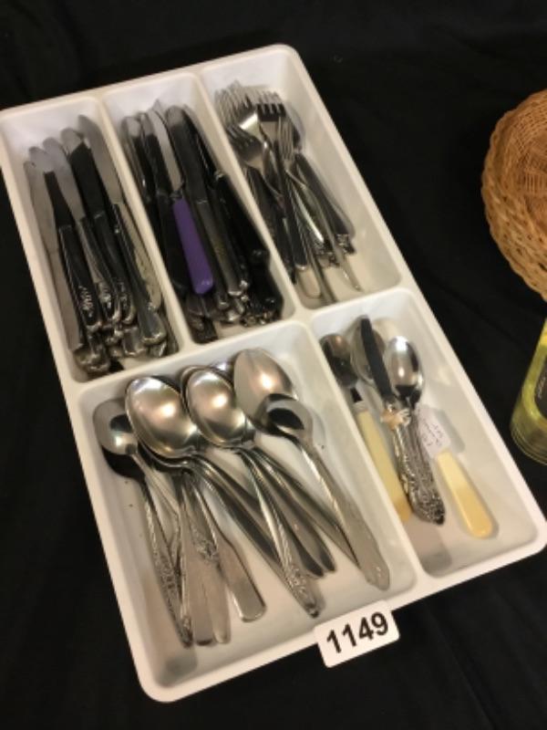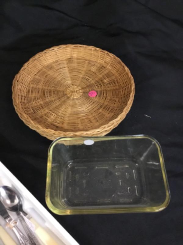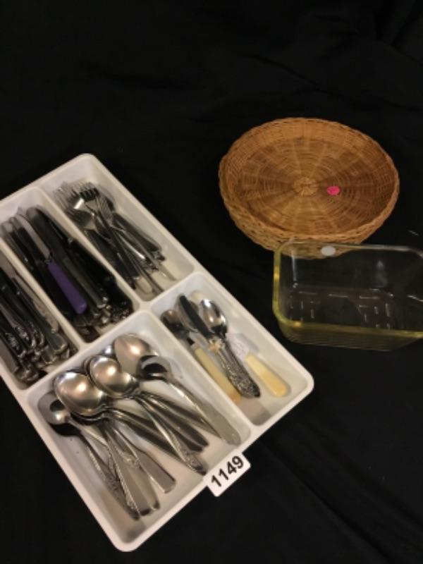 Tray of utensils, paper plate holders, loaf baking dish lot 1149
