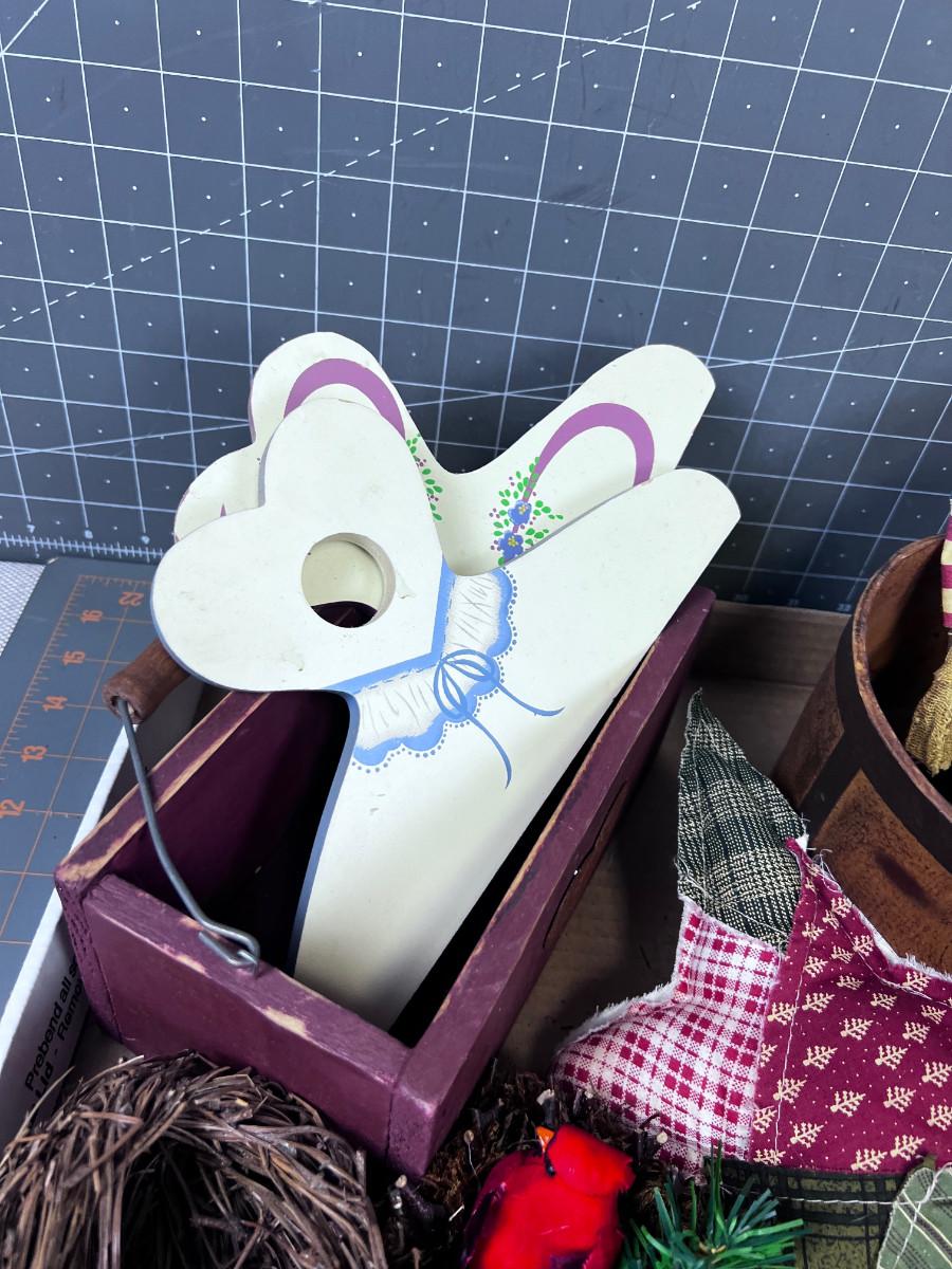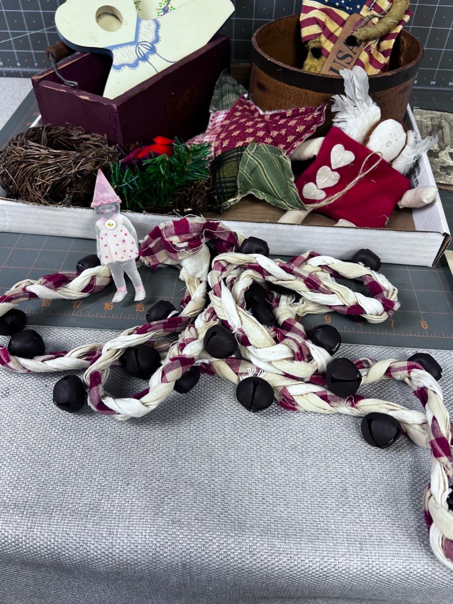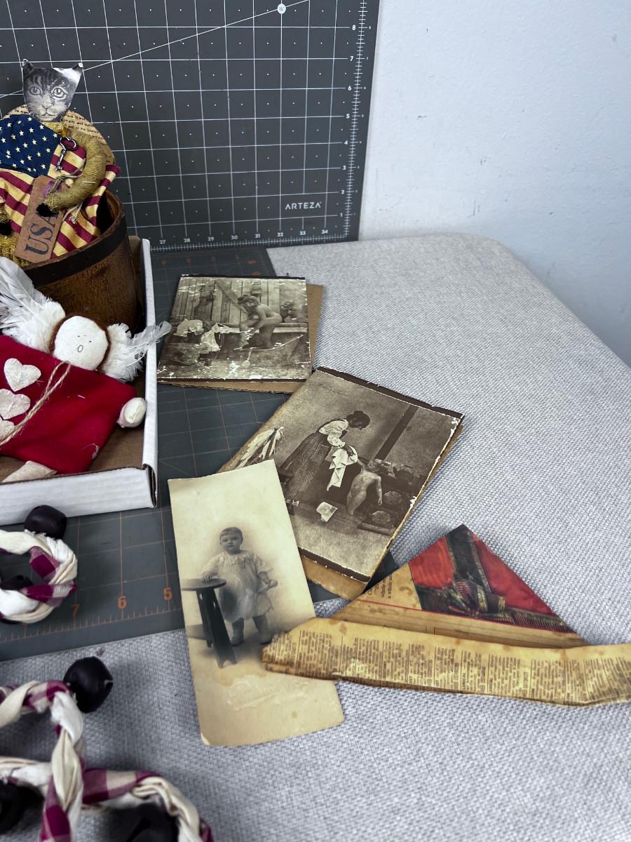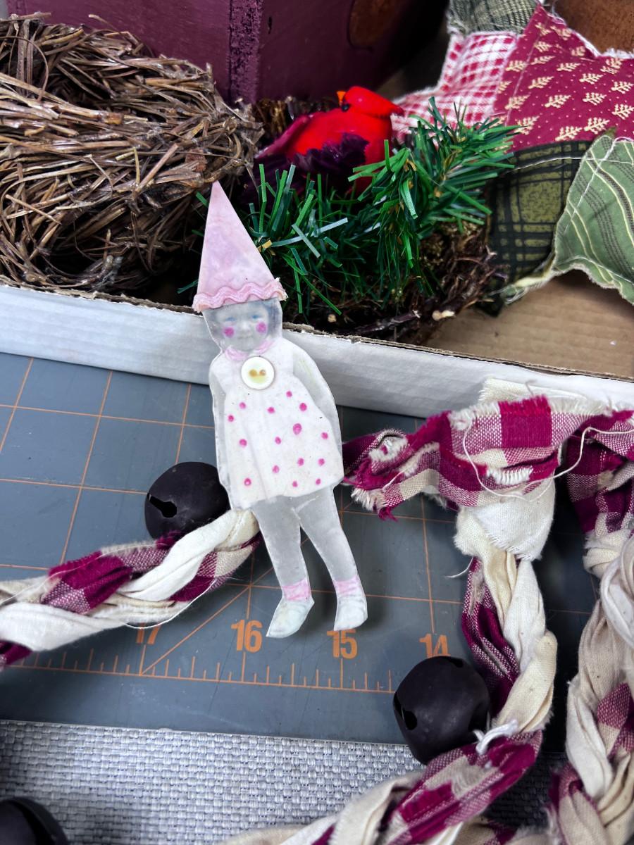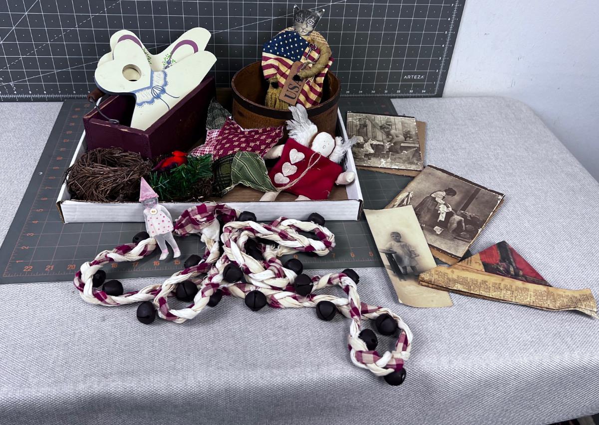 Tray of Vintage Items, Bells, Photo, Paper Hat and Cat