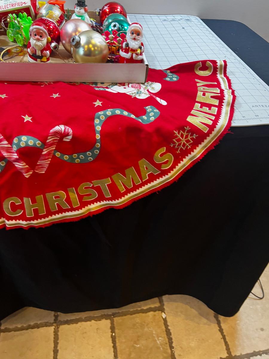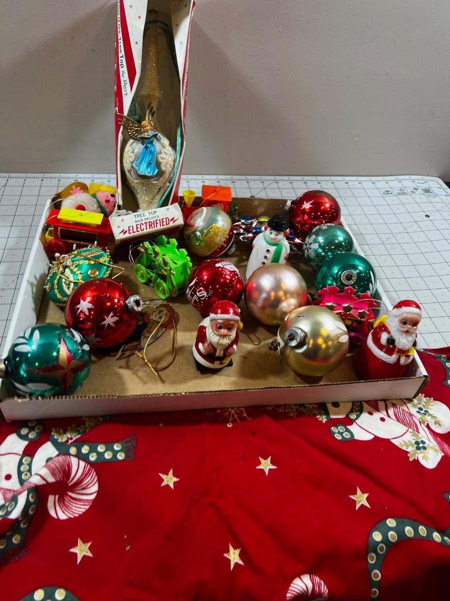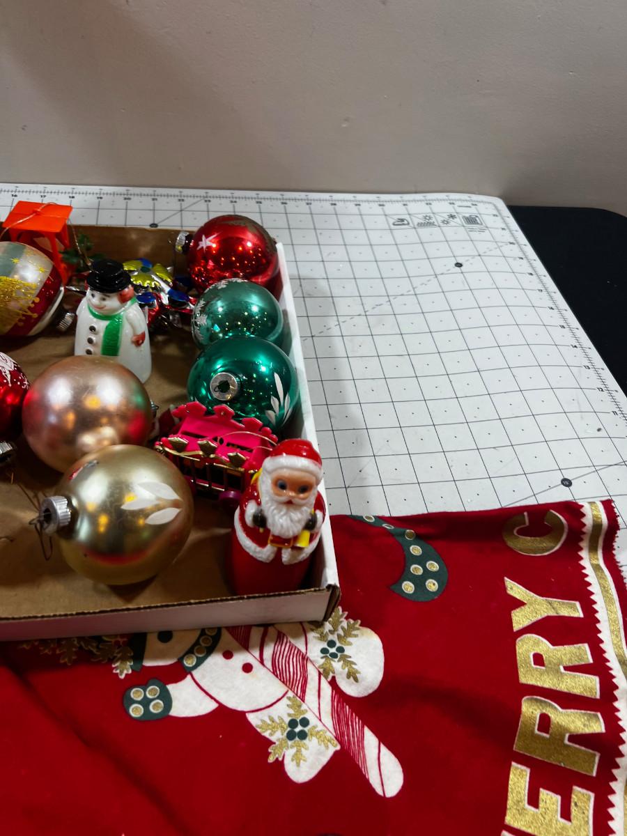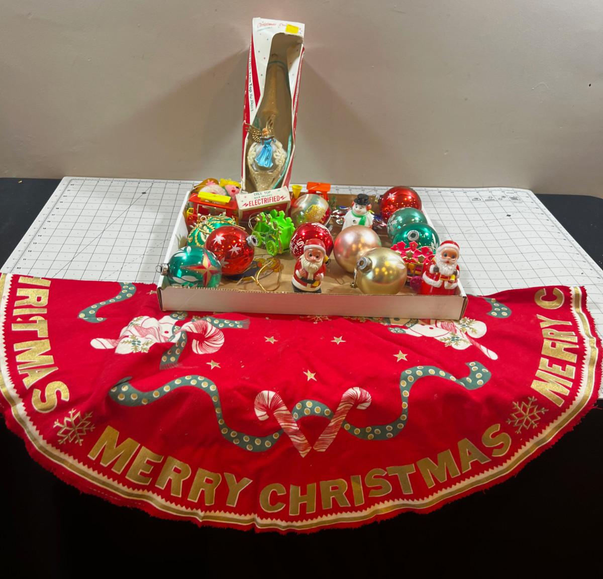Tray of Vintage X-mas Ornaments Plus TREE Shirt from 60's & 70's