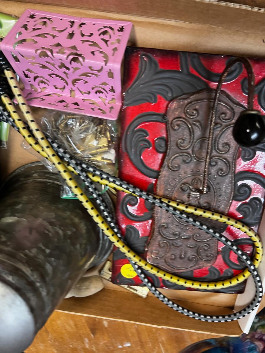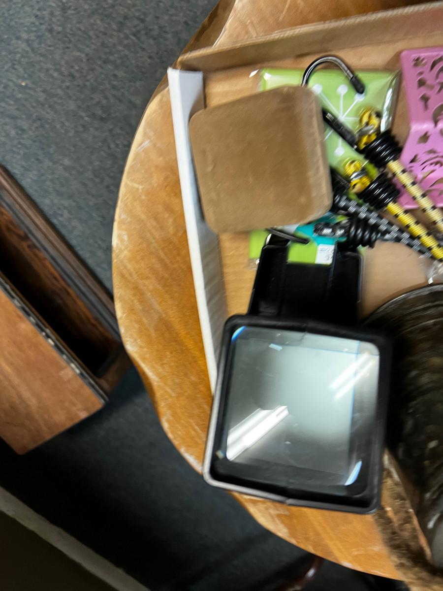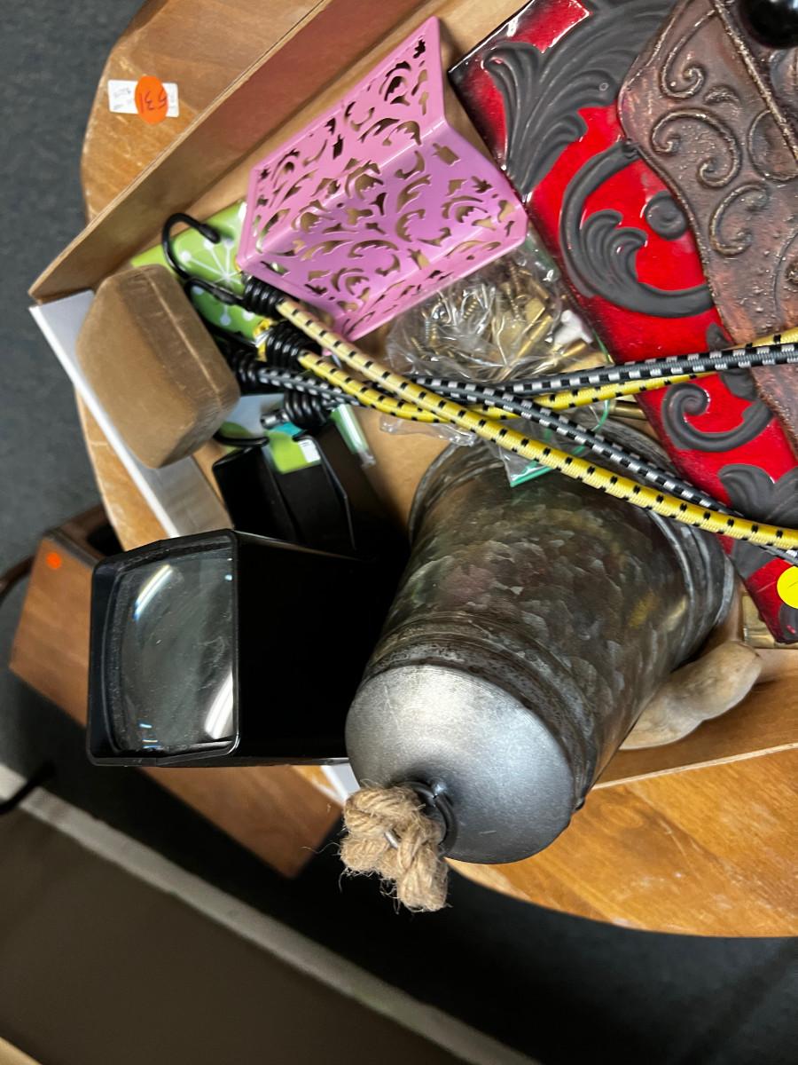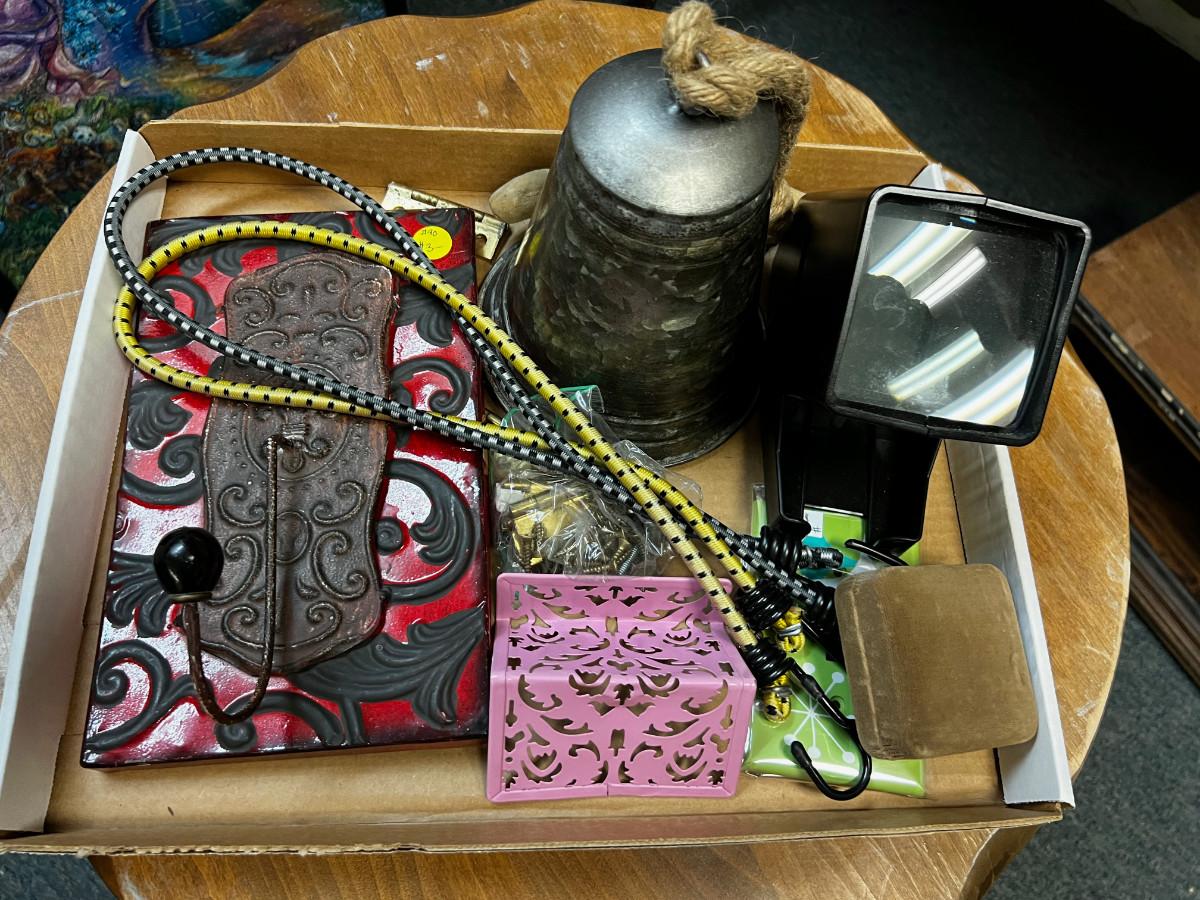 Tray of Weird Items: Bell, Bungy Straps, Slide Viewer.