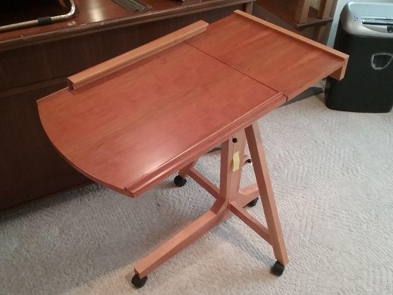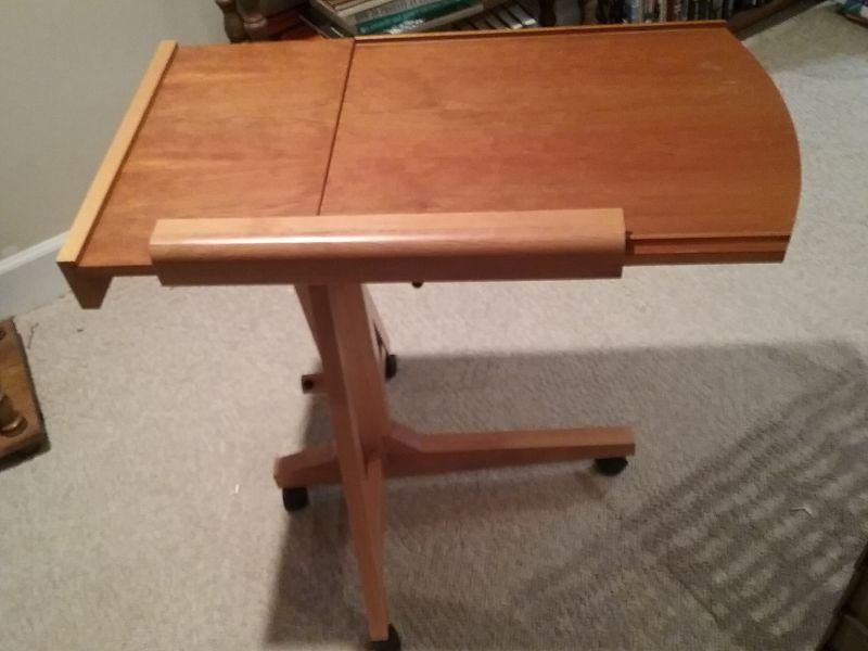 Wooden bedside tray or other use adjustable table on wheels.