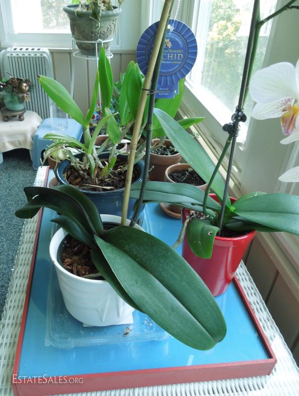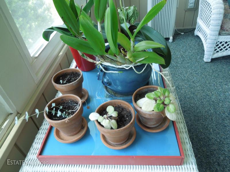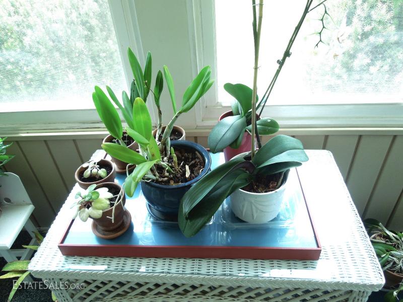 Custom wood framed formica top tray with 6 planters and plants. 2 orchid plants, one blooming. 4 small terra cotta planters with saucers and unknown plants.