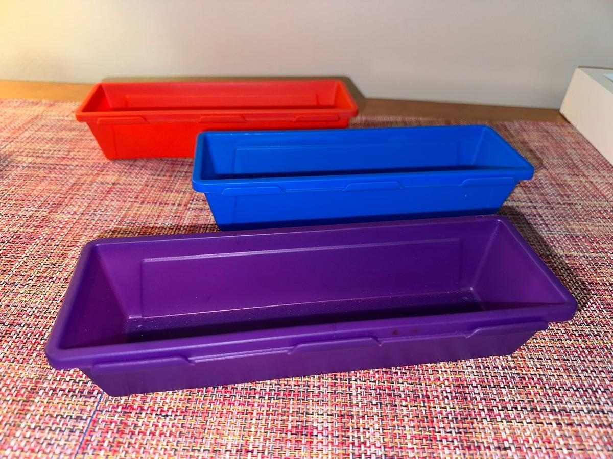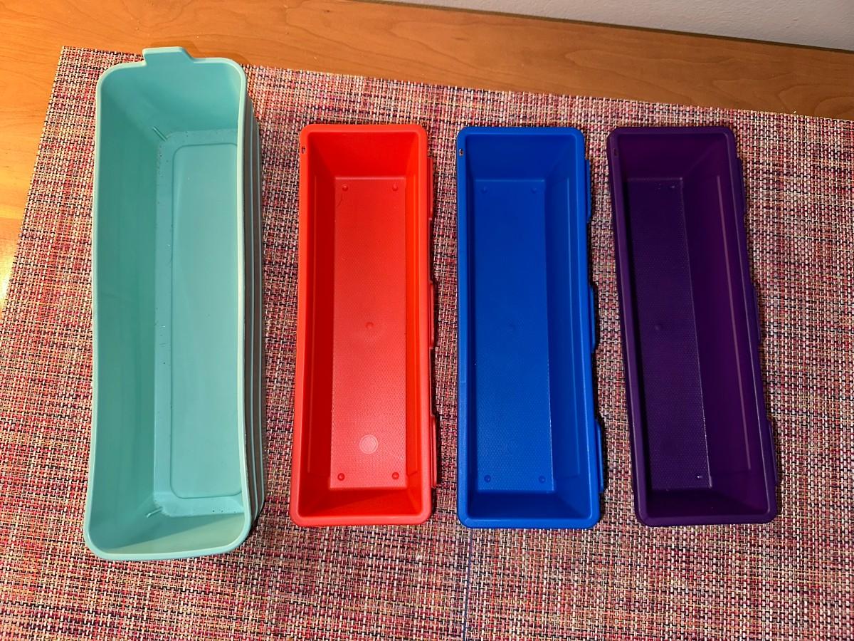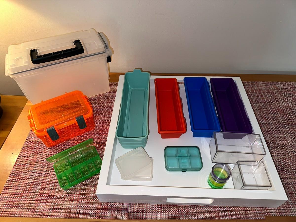 1 White Tray 16 x 16, 1 orange box, 1 clear box with handle, 1 green small box, 4 long organizational trays, 1 pill box, 5 assorted small containers