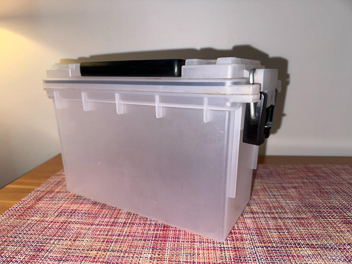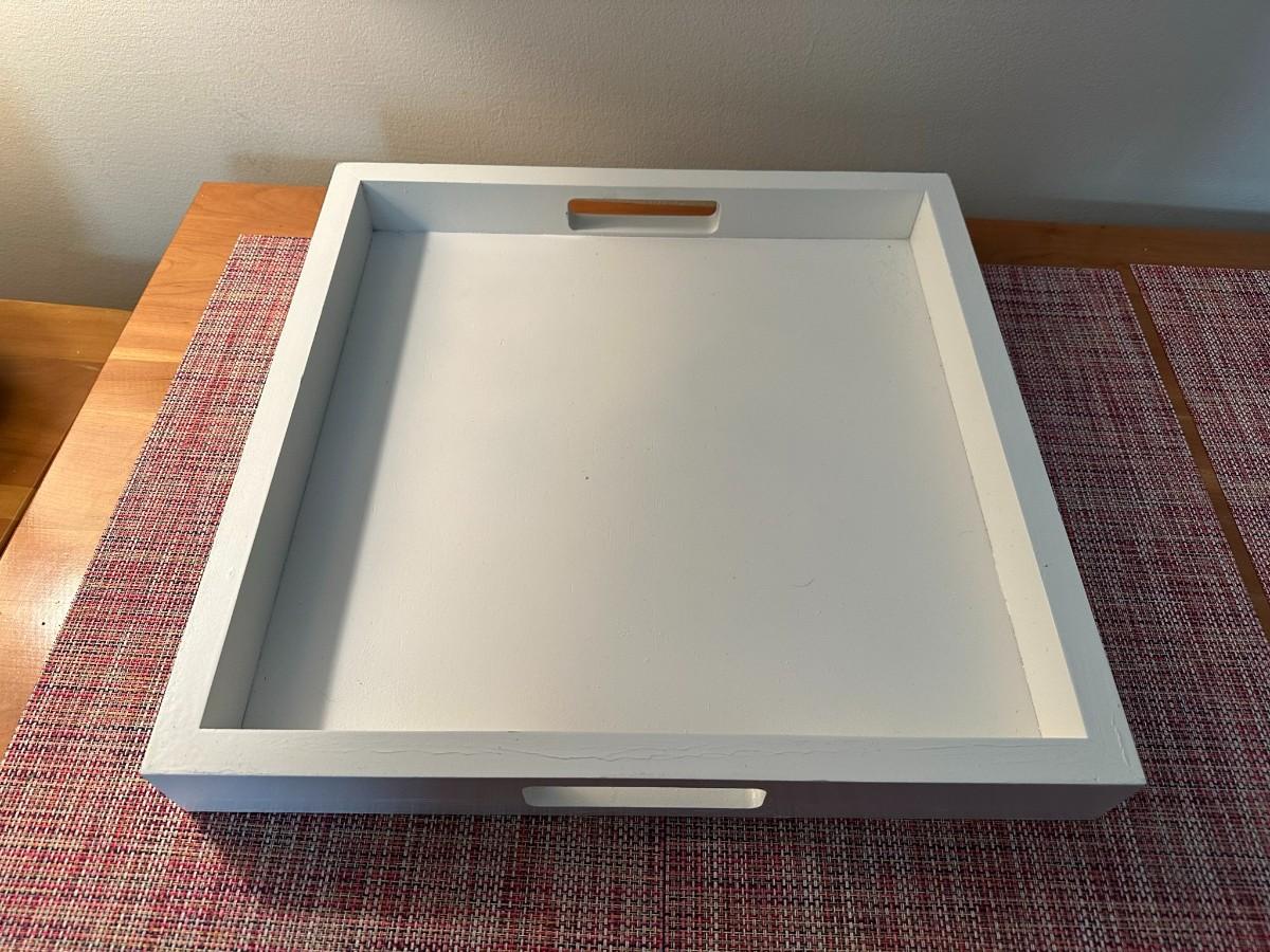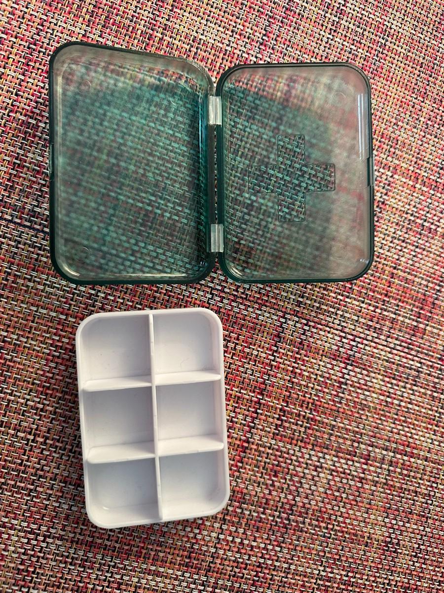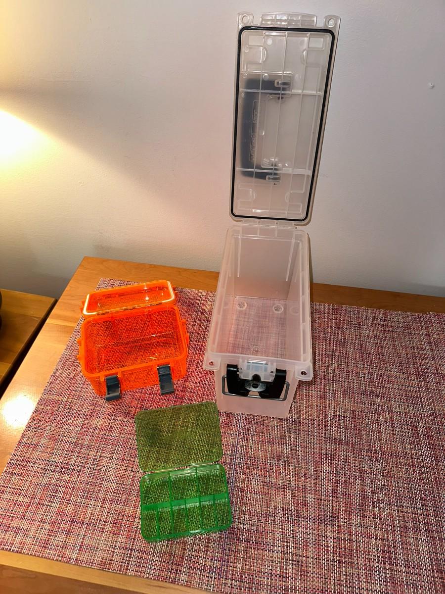 1 White Tray 16 x 16, 1 orange box, 1 clear box with handle, 1 green small box, 4 long organizational trays, 1 pill box, 5 assorted small containers