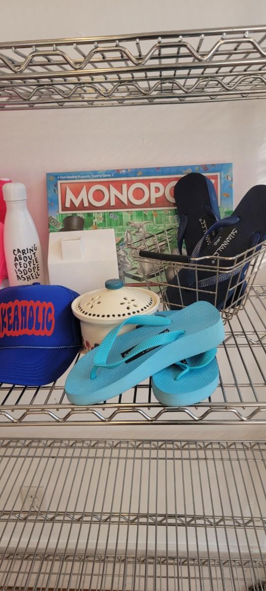 Two great serving, unopened Monopoly game, beach towel, hats and more