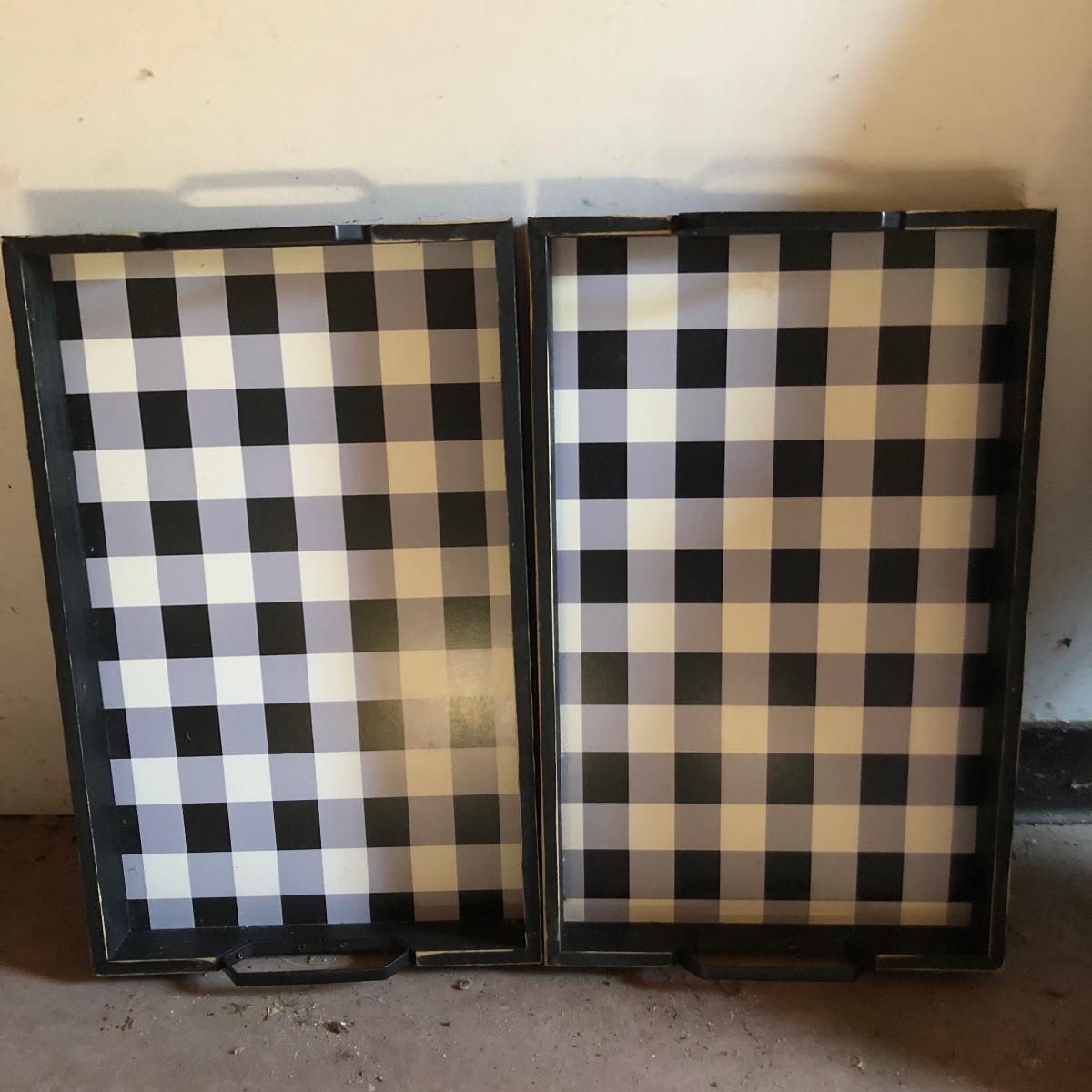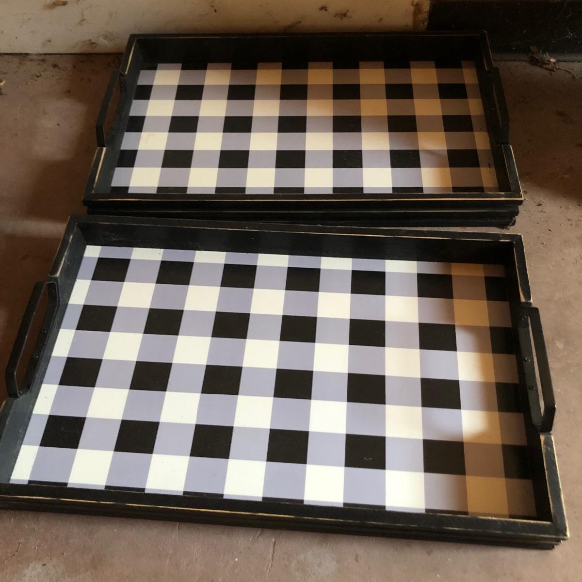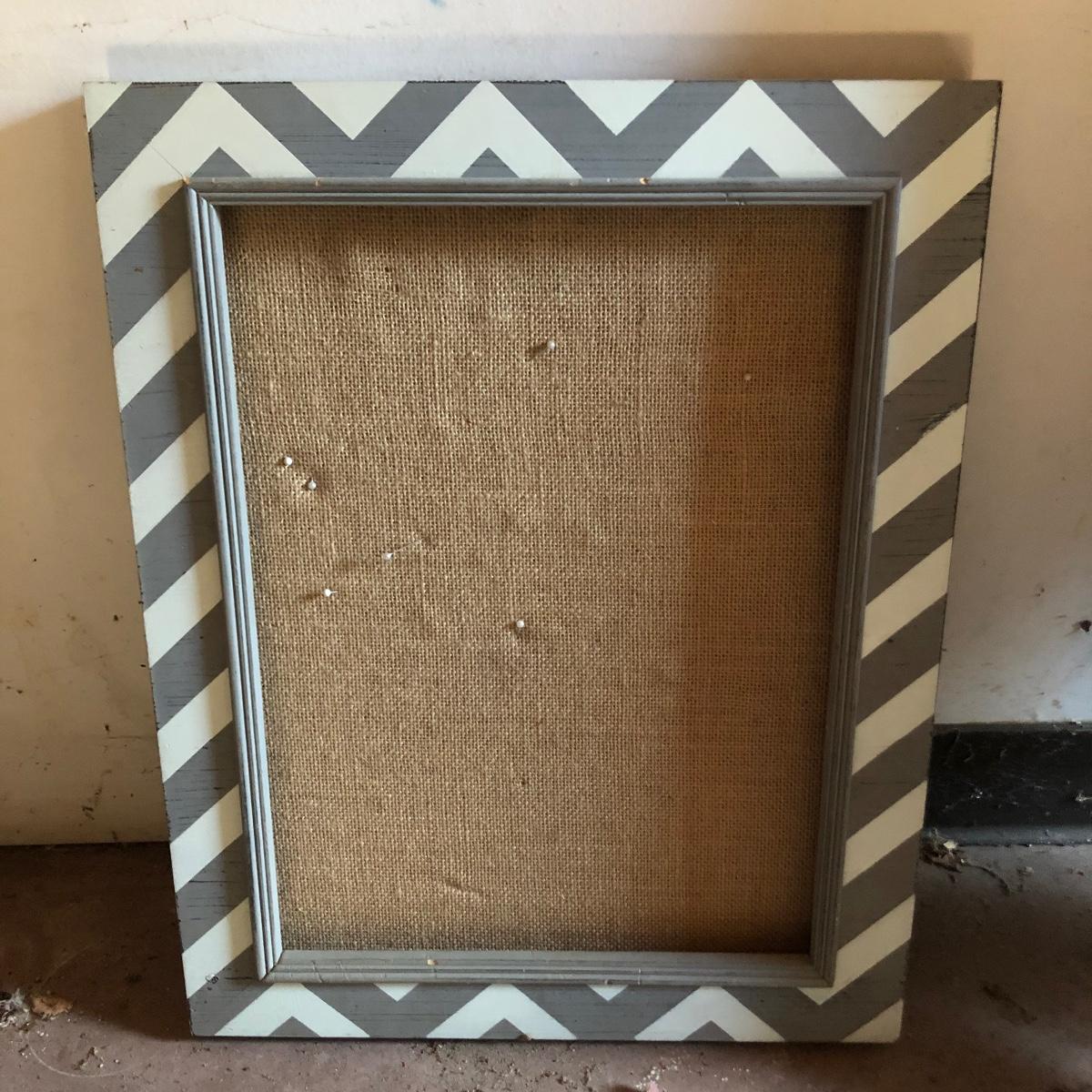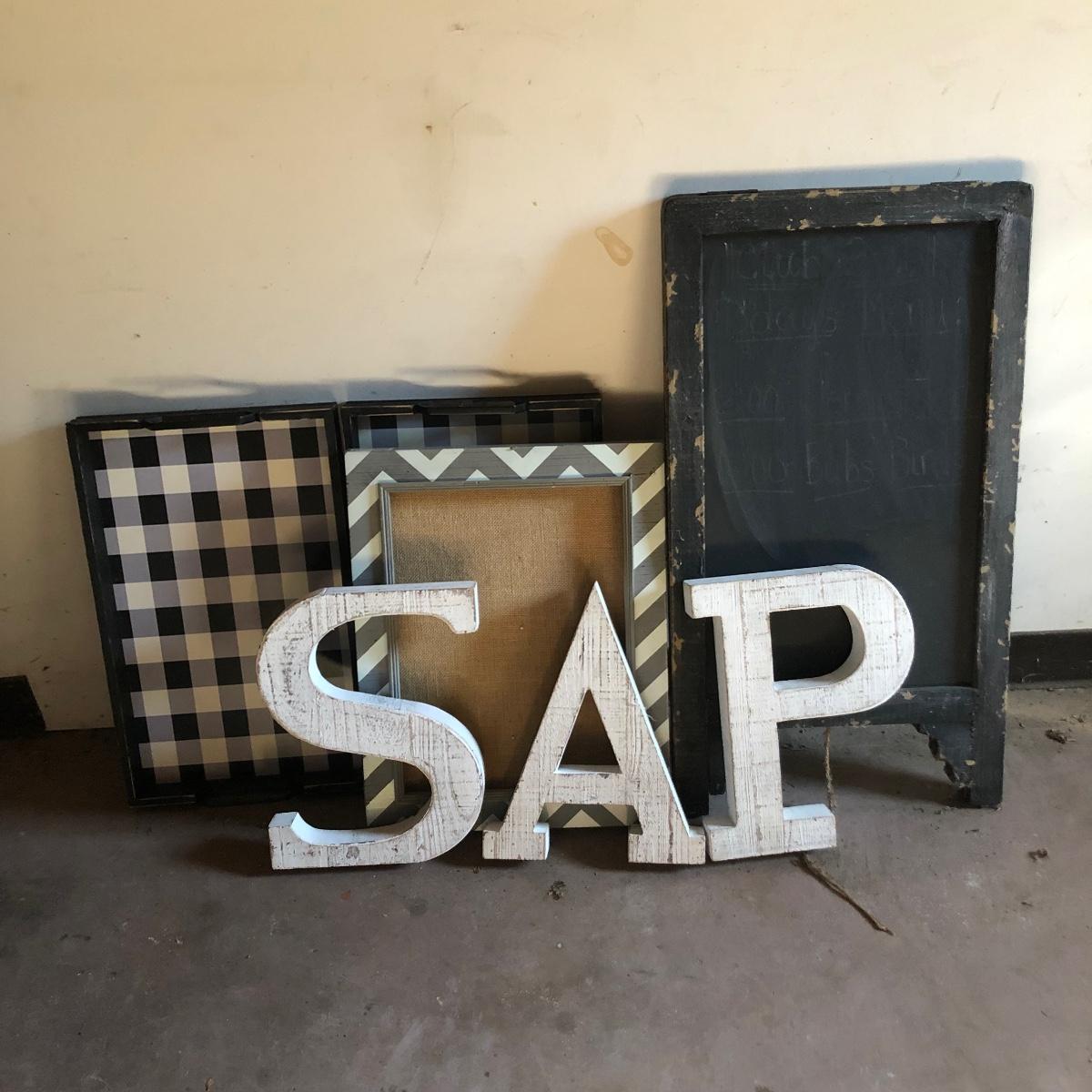 Lot includes two checkerboard design trays, three hollow wooden letters, a framed Nicole Miller bulletin board, and a two-sided chalkboard sign.