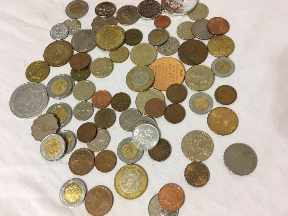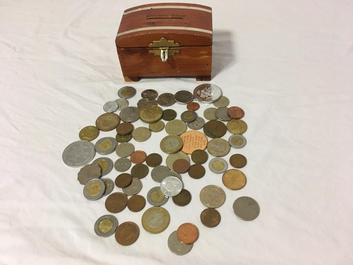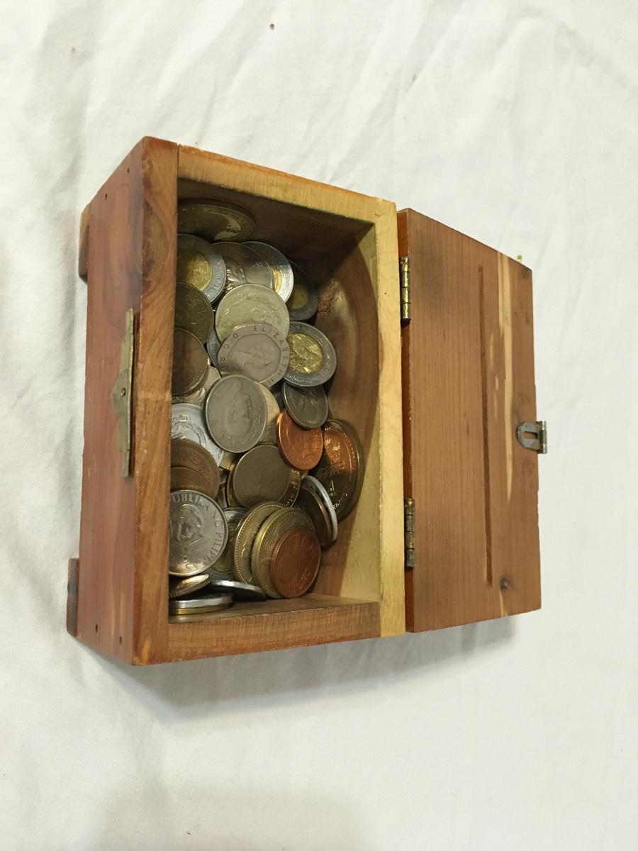 Treasure chest full of miscellaneous around the world coins please see attached photos