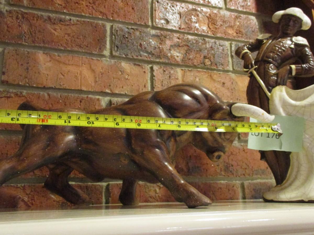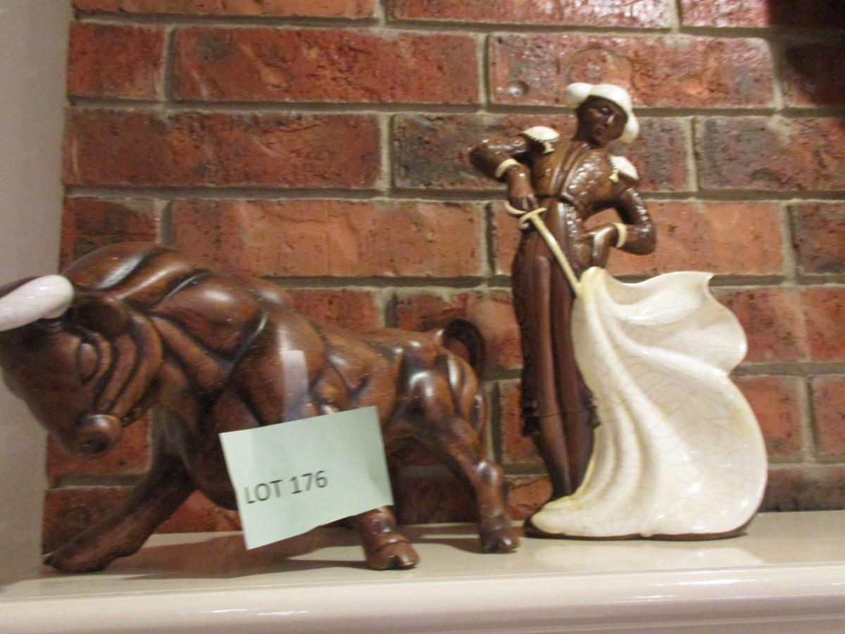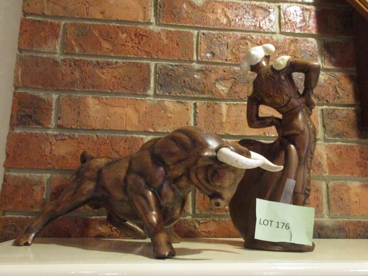 Wood carved bull and matador with ceramic sash. Vintage 1970's.