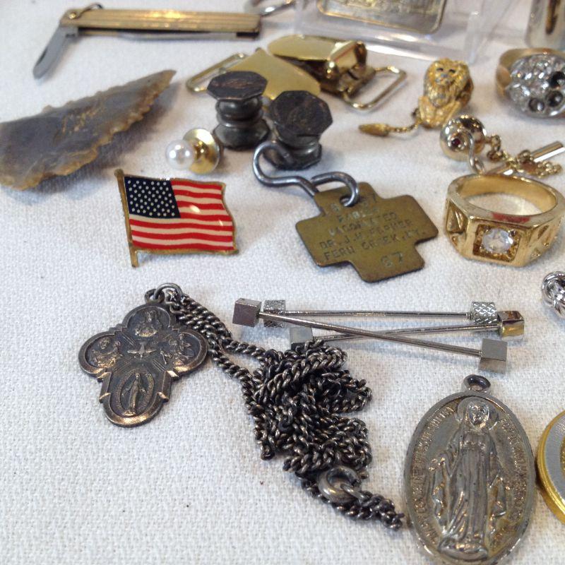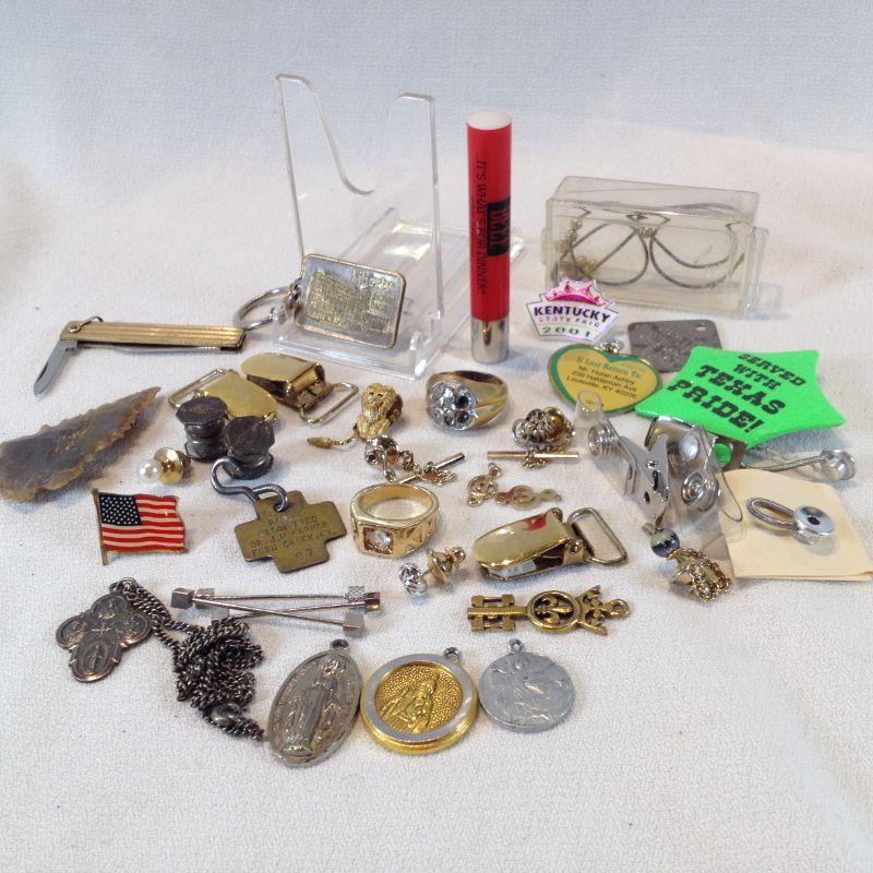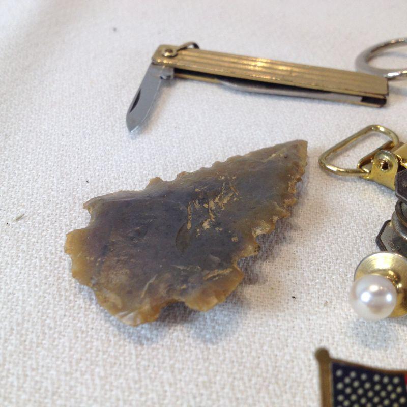 If you are looking for a good Treasure Hunt this may be the lot for you. This lot includes all that was left in the keepsake box from our most recent estate cleanout. We spied an old arrow head and a 14K gold-filled ring. What will you find?