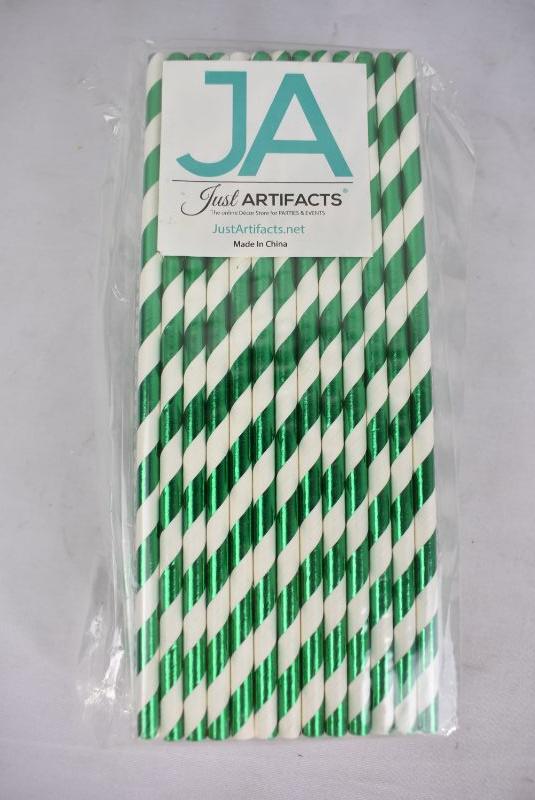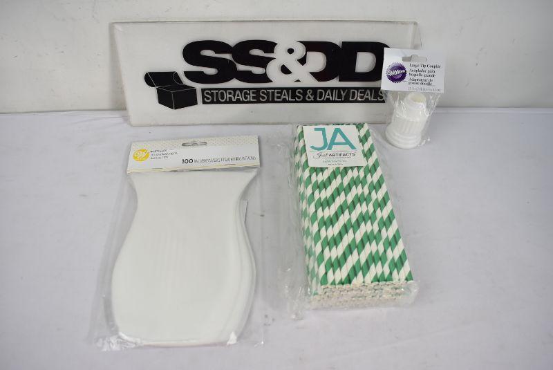 Wilton Clear Shaped Treat Bags, 100-Count, Wilton Large Tip Coupler, & Just Artifacts 100pcs Decorative Striped Paper Straws (Striped, Metallic Kelly Green), $15 Retail - New