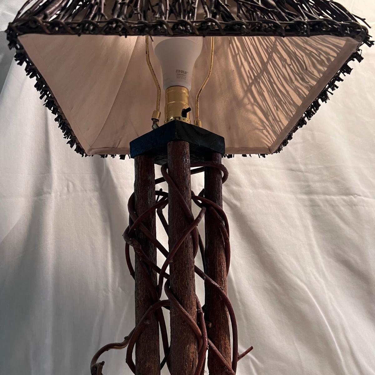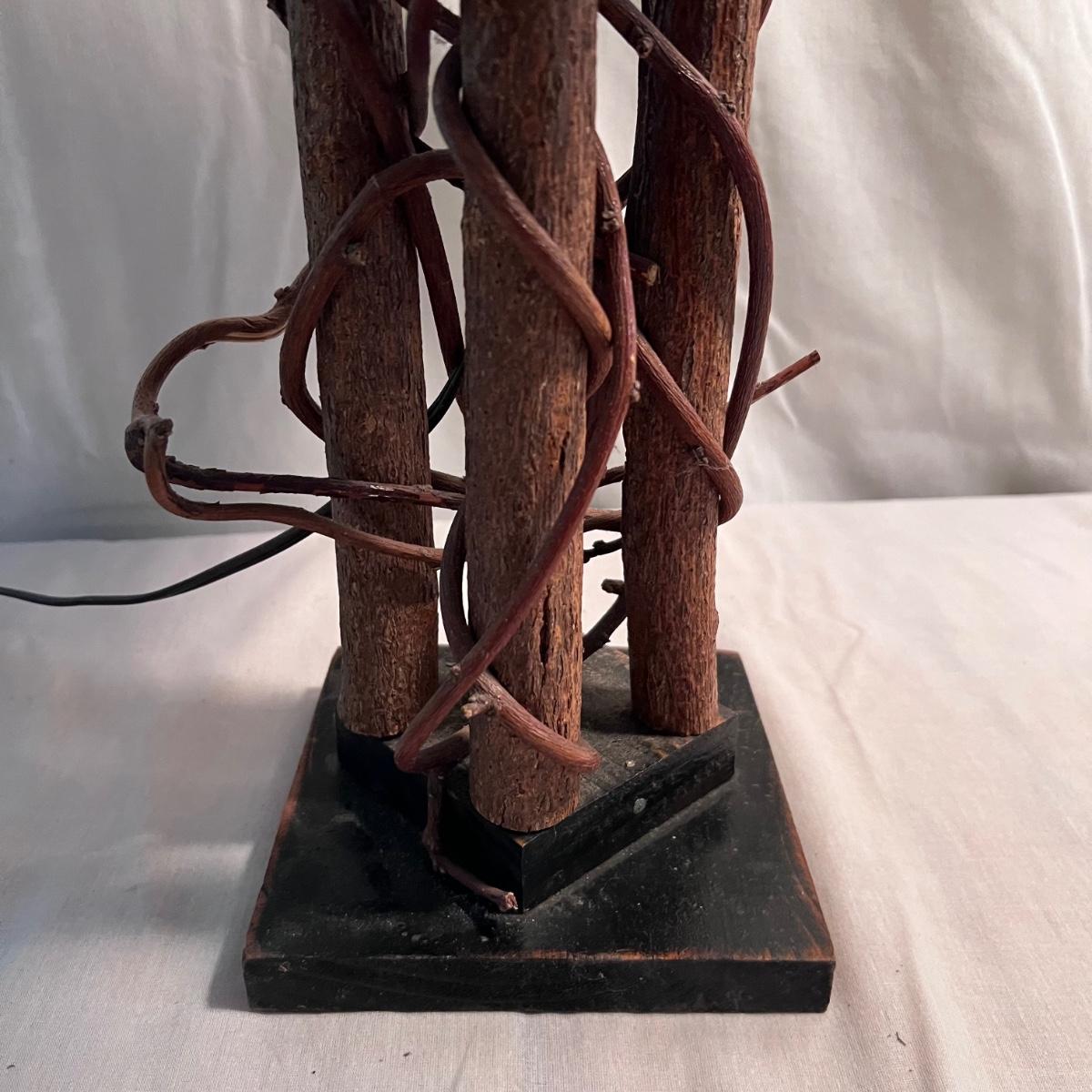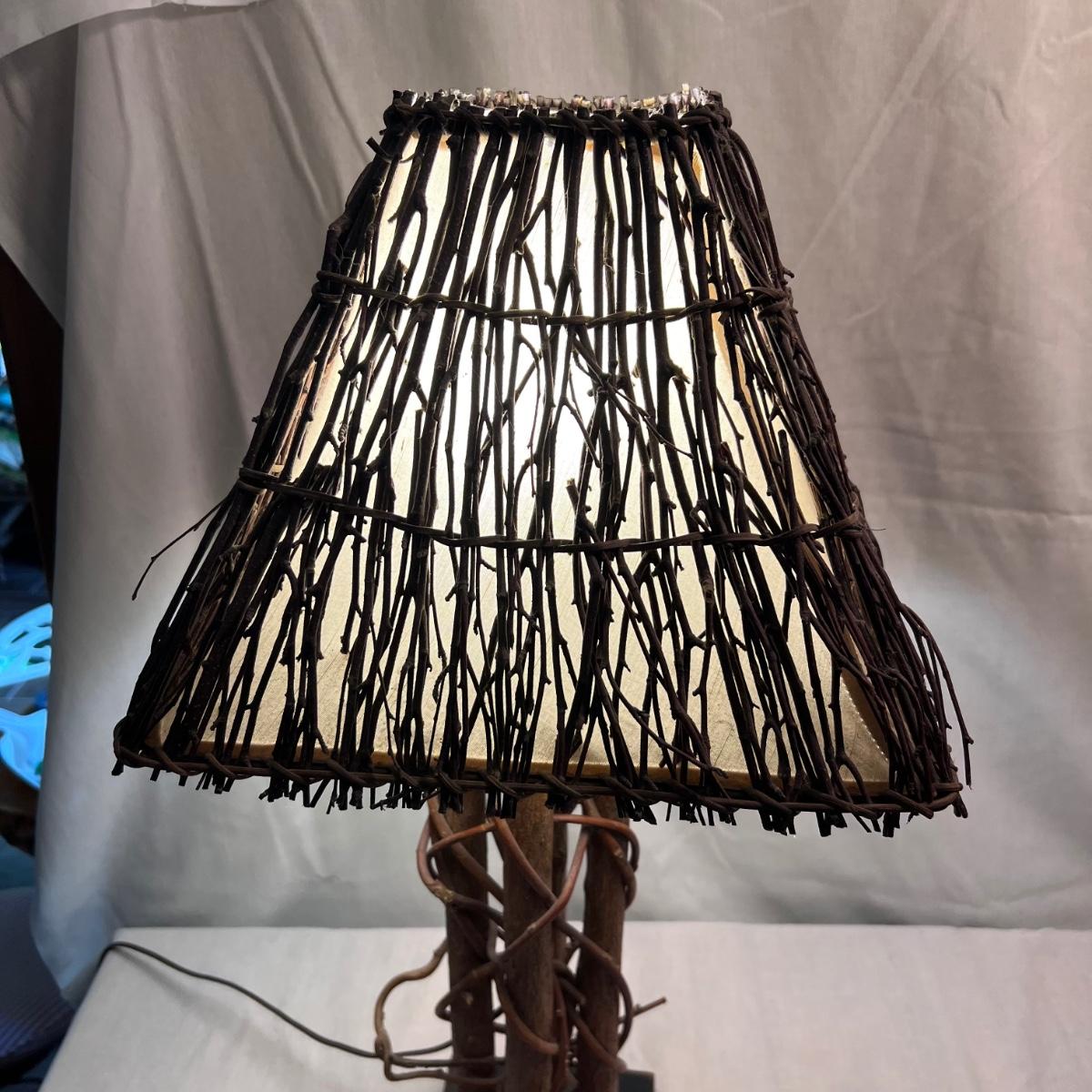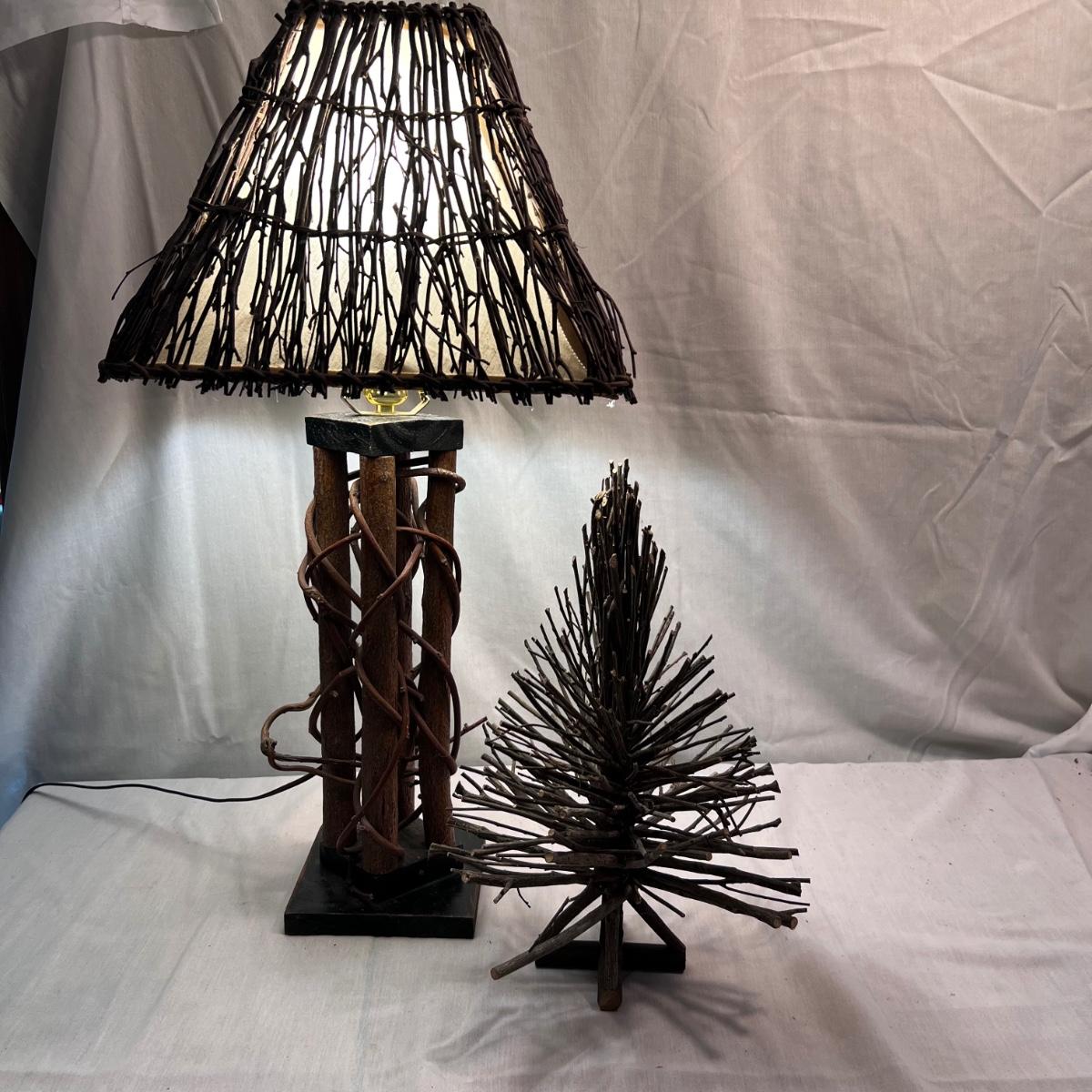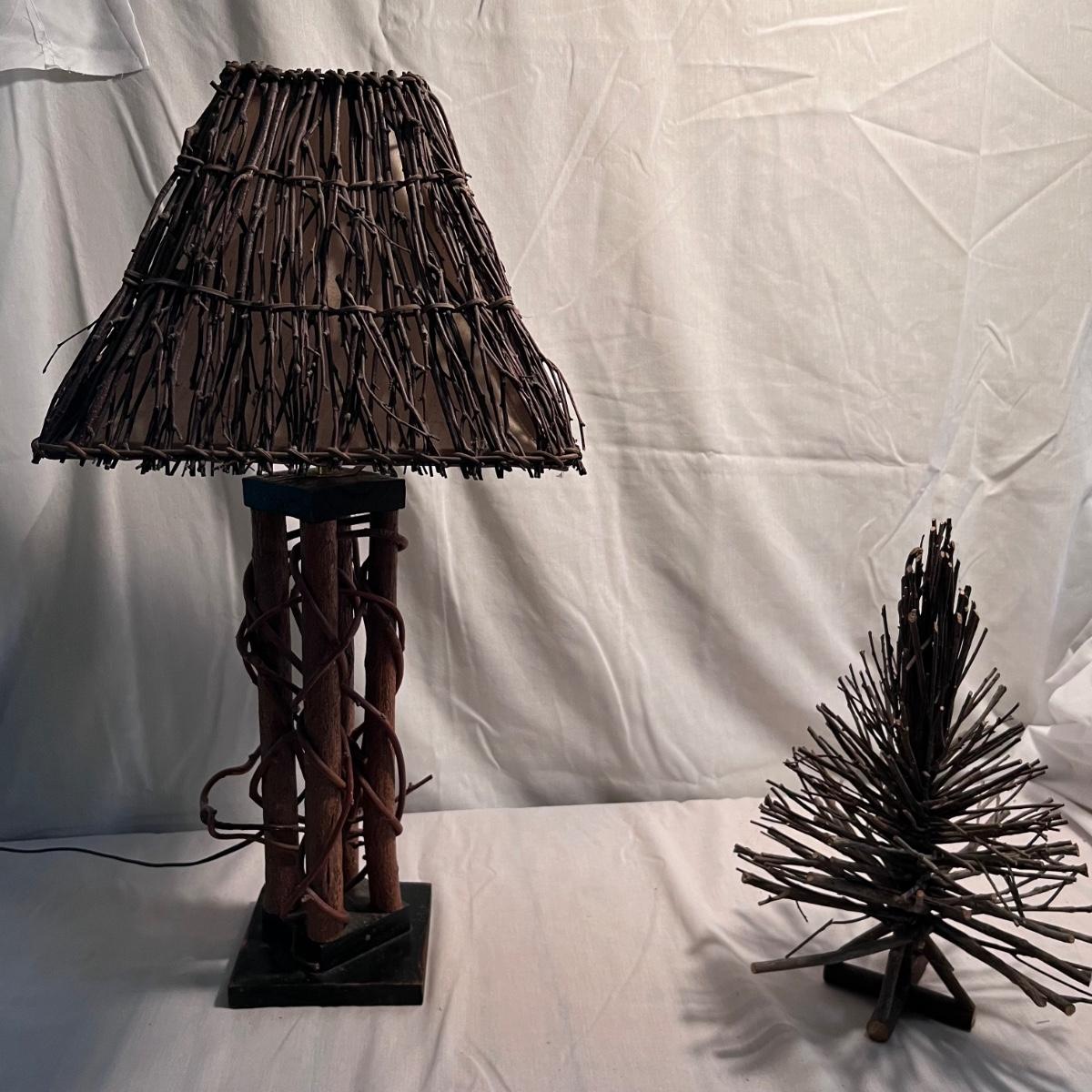 Two rustic themed items includes a lamp and a decorative tree statue made from twigs. The lamp shade has twigs attached to its shade and the body of the lamp has faux branches. It has a single switch and measures 6” square (base) x 28”H.