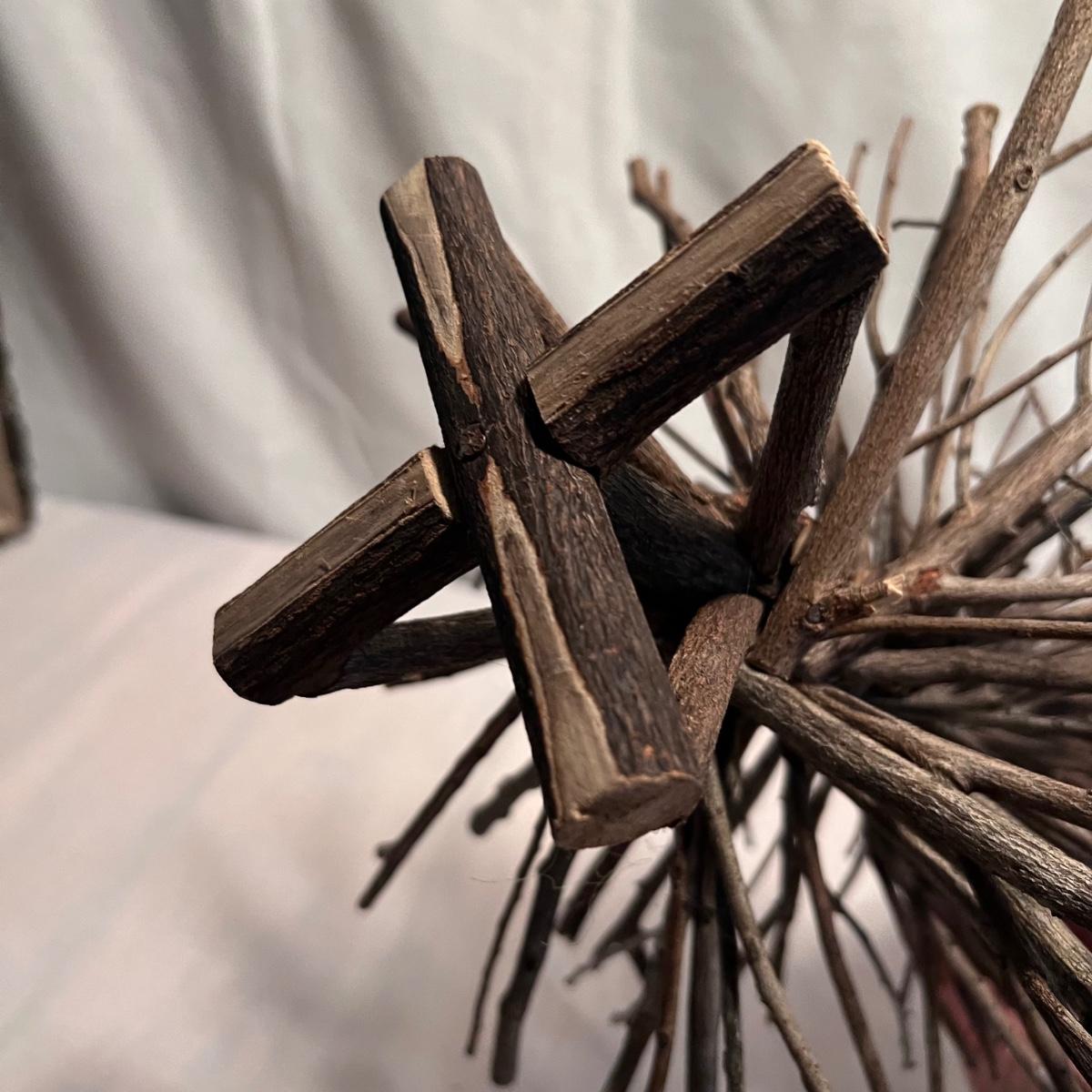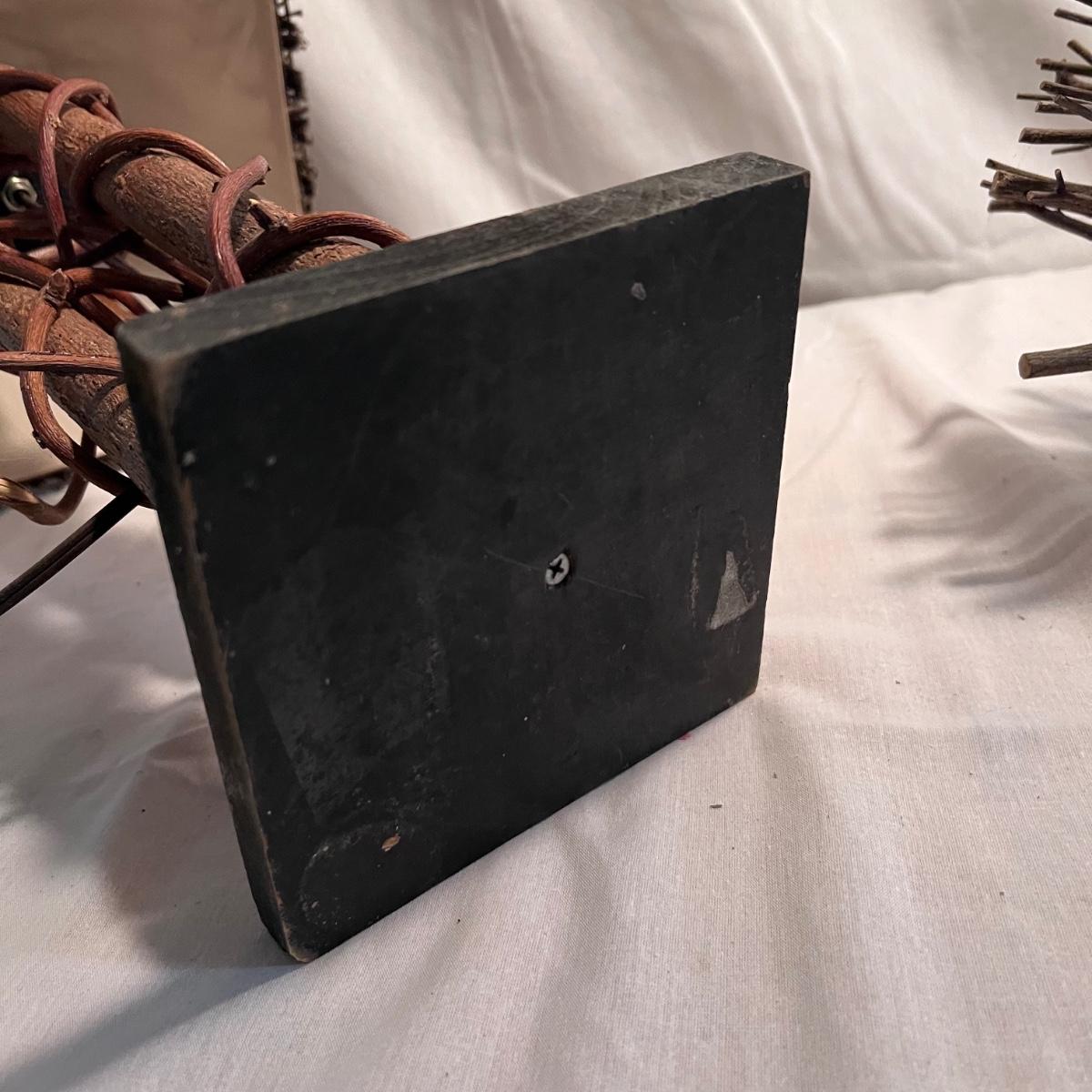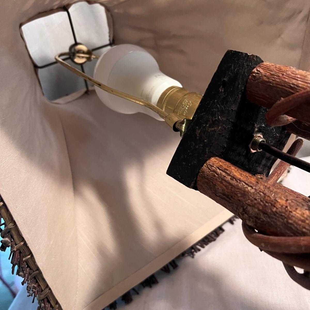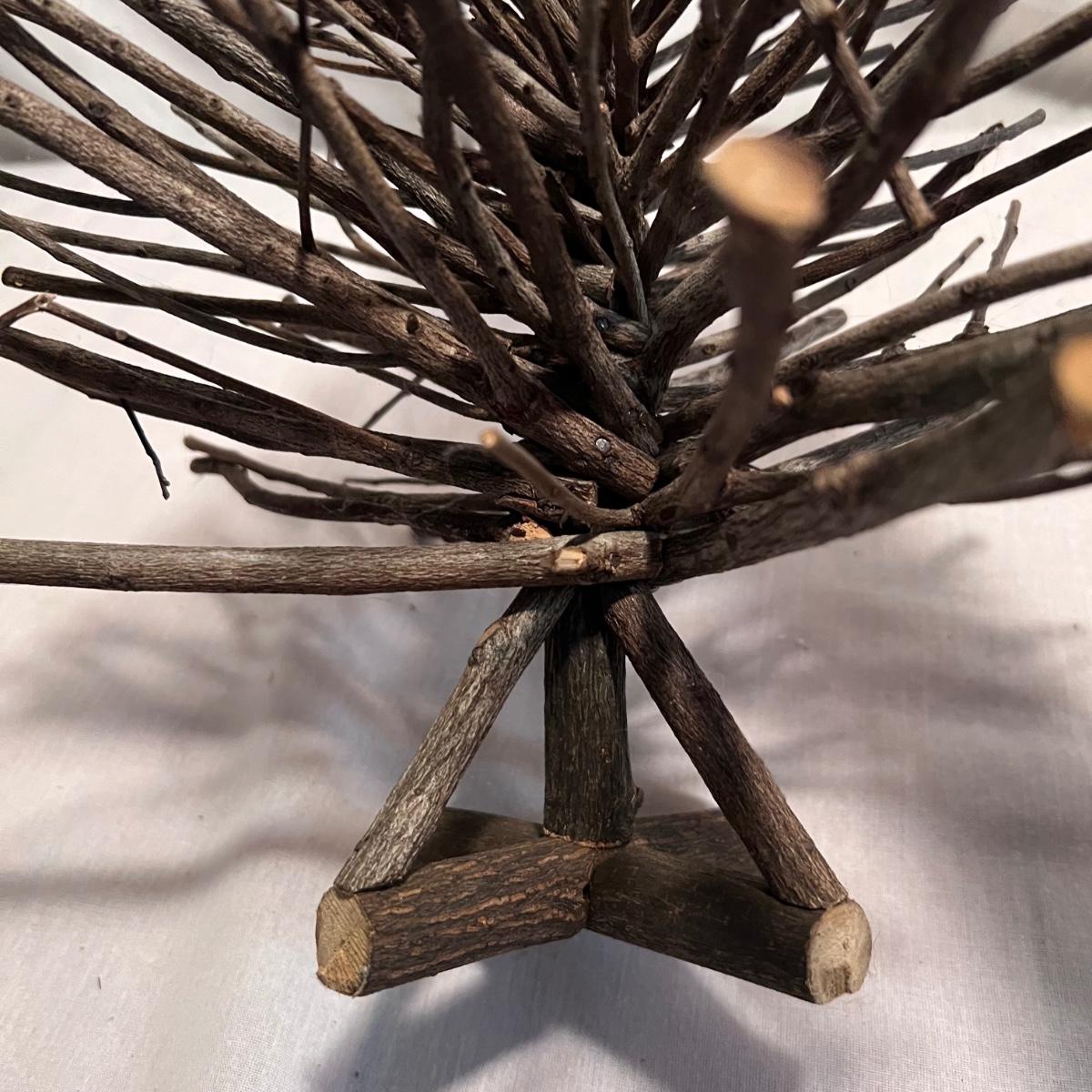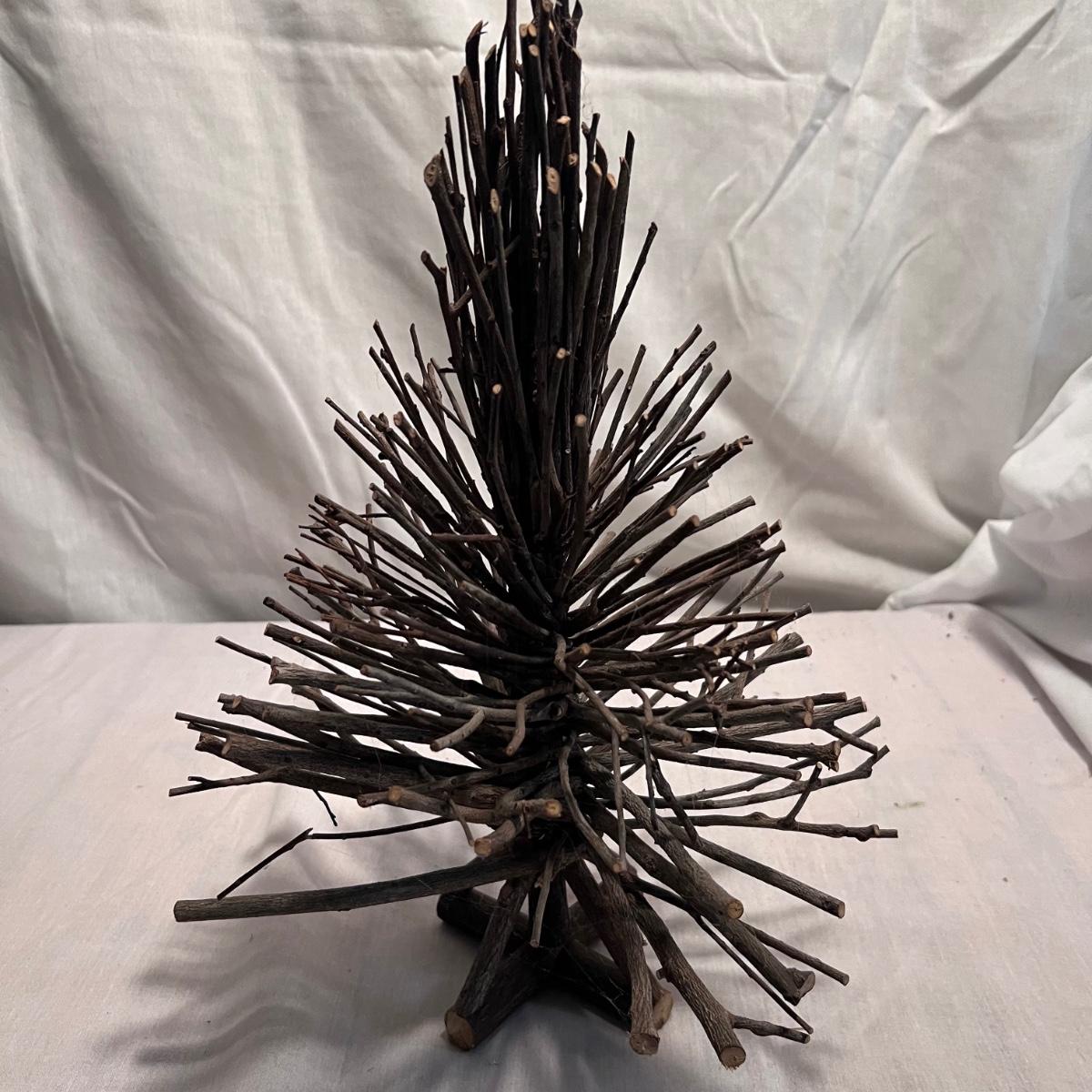 Two rustic themed items includes a lamp and a decorative tree statue made from twigs. The lamp shade has twigs attached to its shade and the body of the lamp has faux branches. It has a single switch and measures 6” square (base) x 28”H.