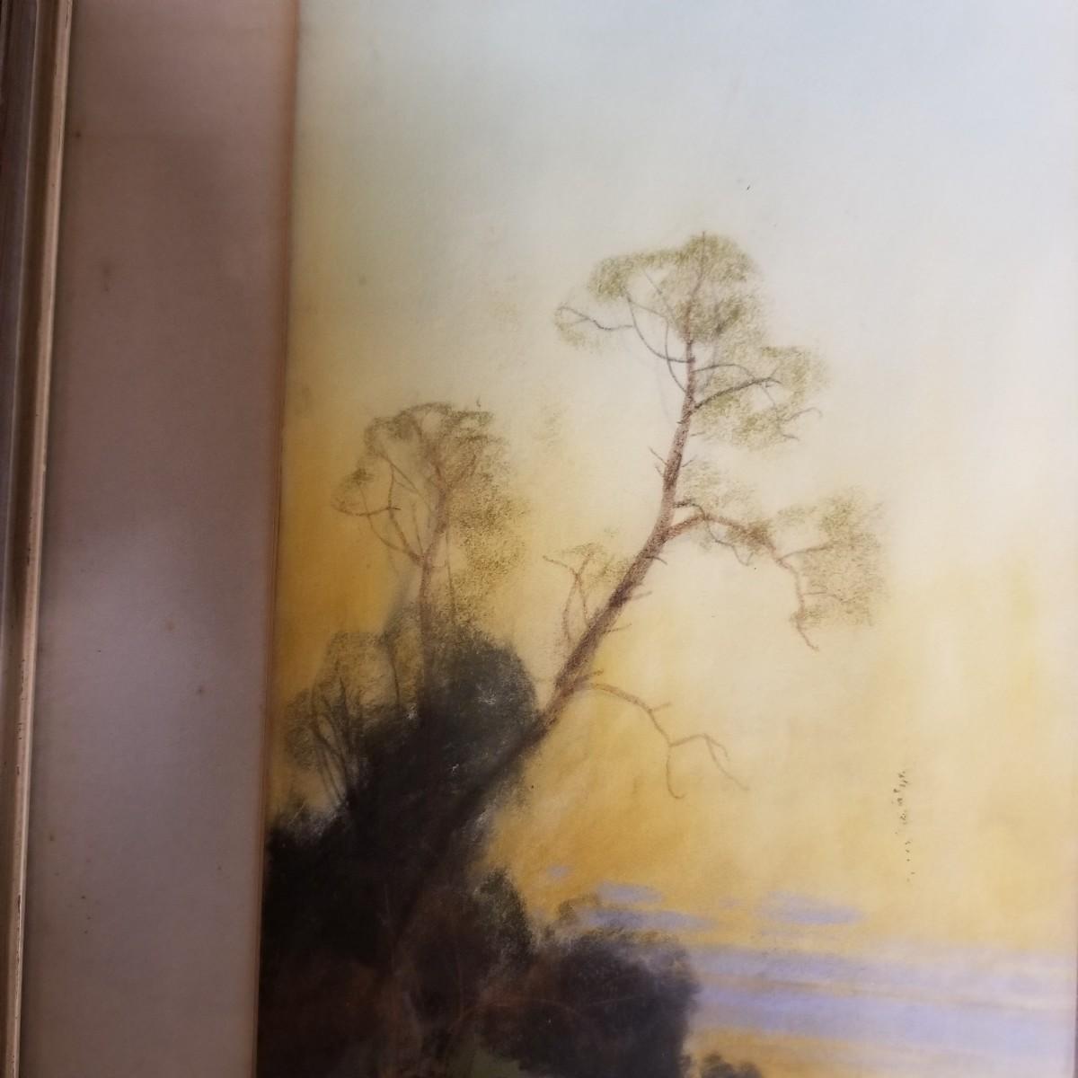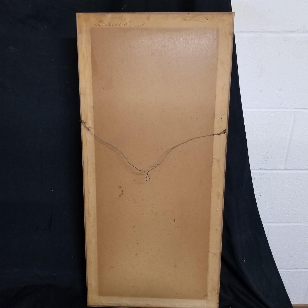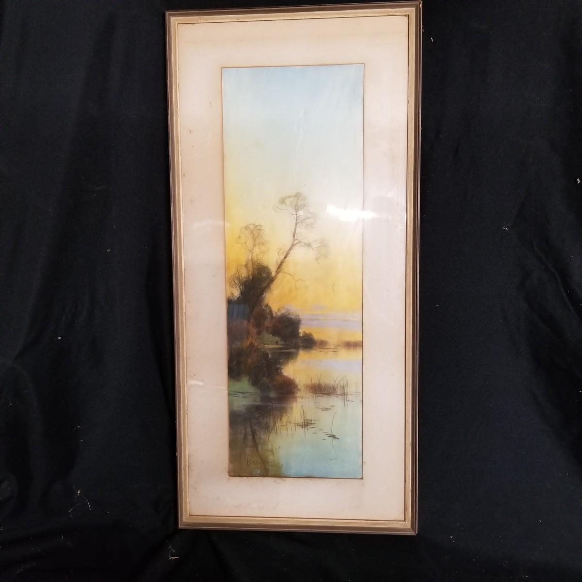 Vertical image of trees and  shrubs over a waterway. Piece is 12 1/2" x26 1/2".  Possibly a lithograph,  piece is signed and maybe numbered, see photos for detail.   Some under glass discoloration visible.  Shipping available.  Shipping Art can be costly please call UPS store at 828-252-6930 for quote.