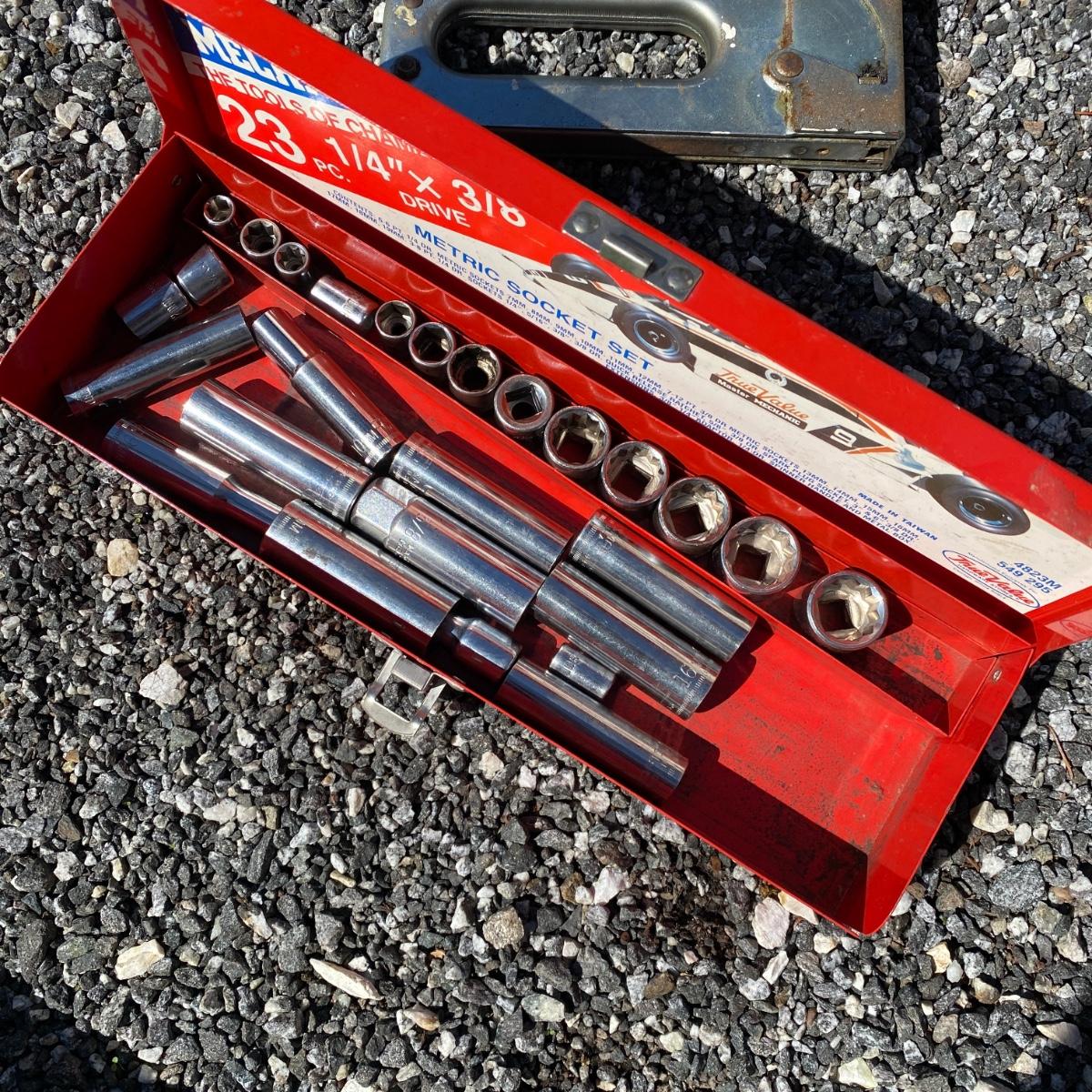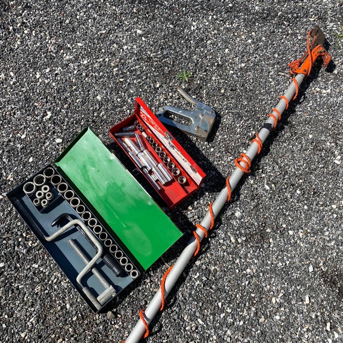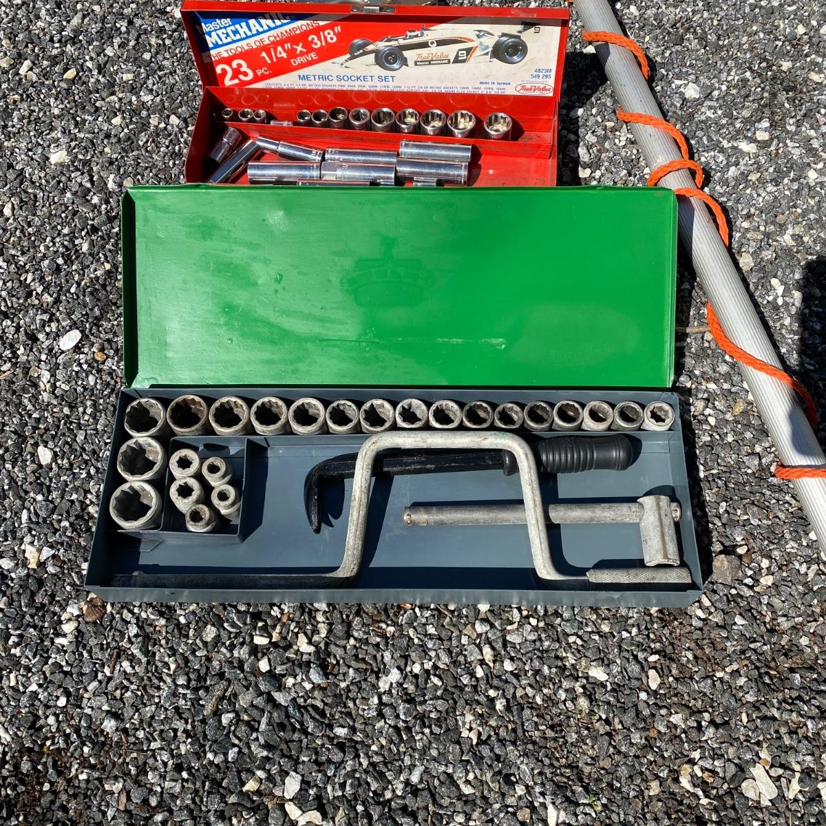 Two socket sets with all sizes you may need. Both come in metal box for storage. Green one measures 16.5” x 6.5”. Lot also includes a 6.5foot tree trimmer and a staple gun. Local pick up