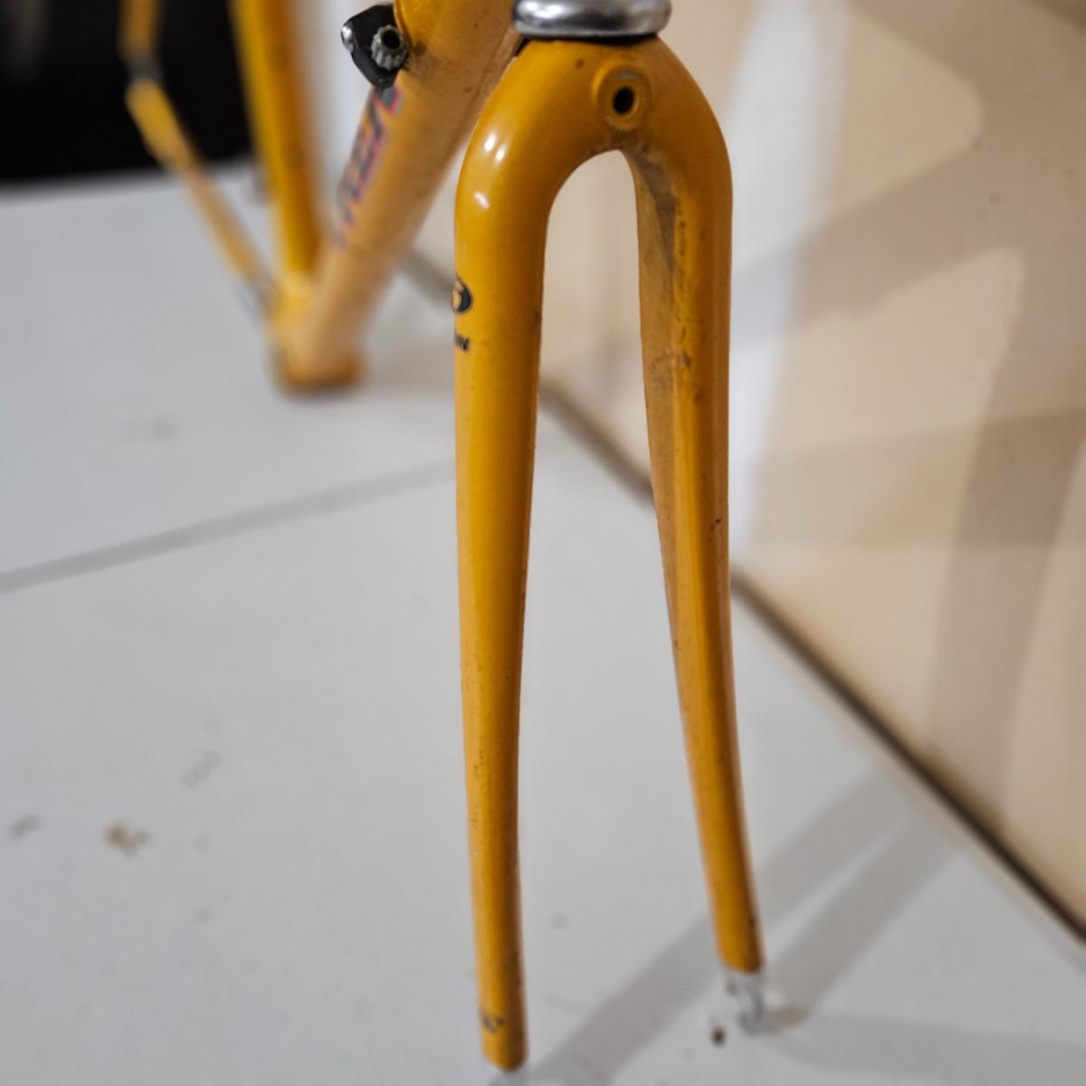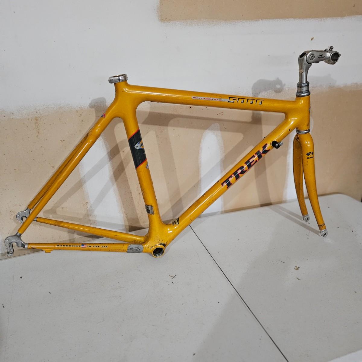 A Yellow Trek 5000 OCLV carbon fiber road bike frame. It has an icon fork and a Kalloy adjustable handlebar clamp. The top tube measures approximately 21.5" and the seat tube is approximately 21". Shipping available. Shipping can be costly. We suggest contacting our preferred local shipping provider, Postage Express, with dimensions and getting an estimate before bidding: (828) 670-5501 or shipping@postageexpressnc.com