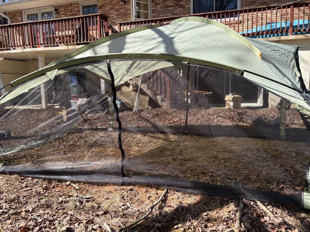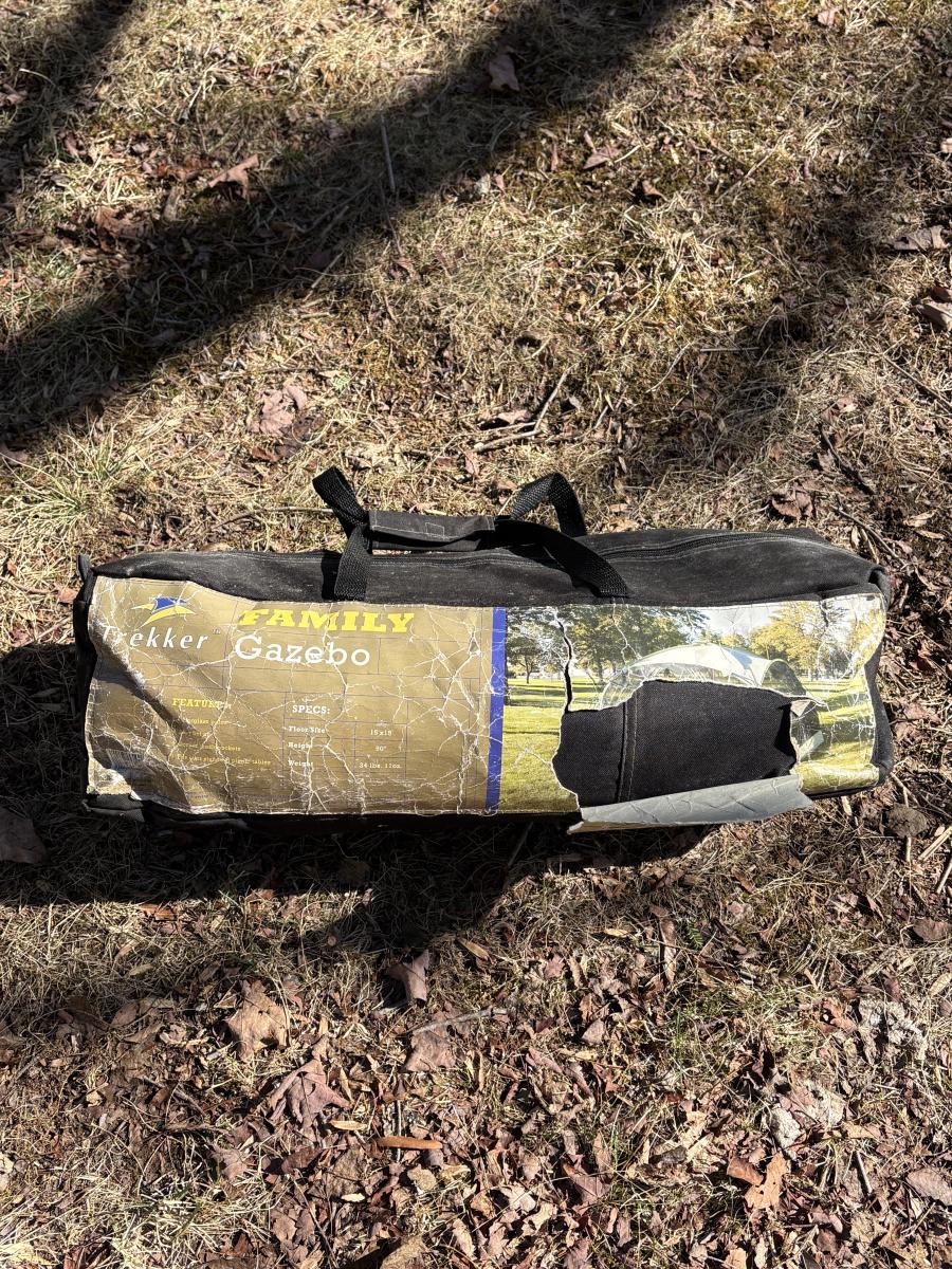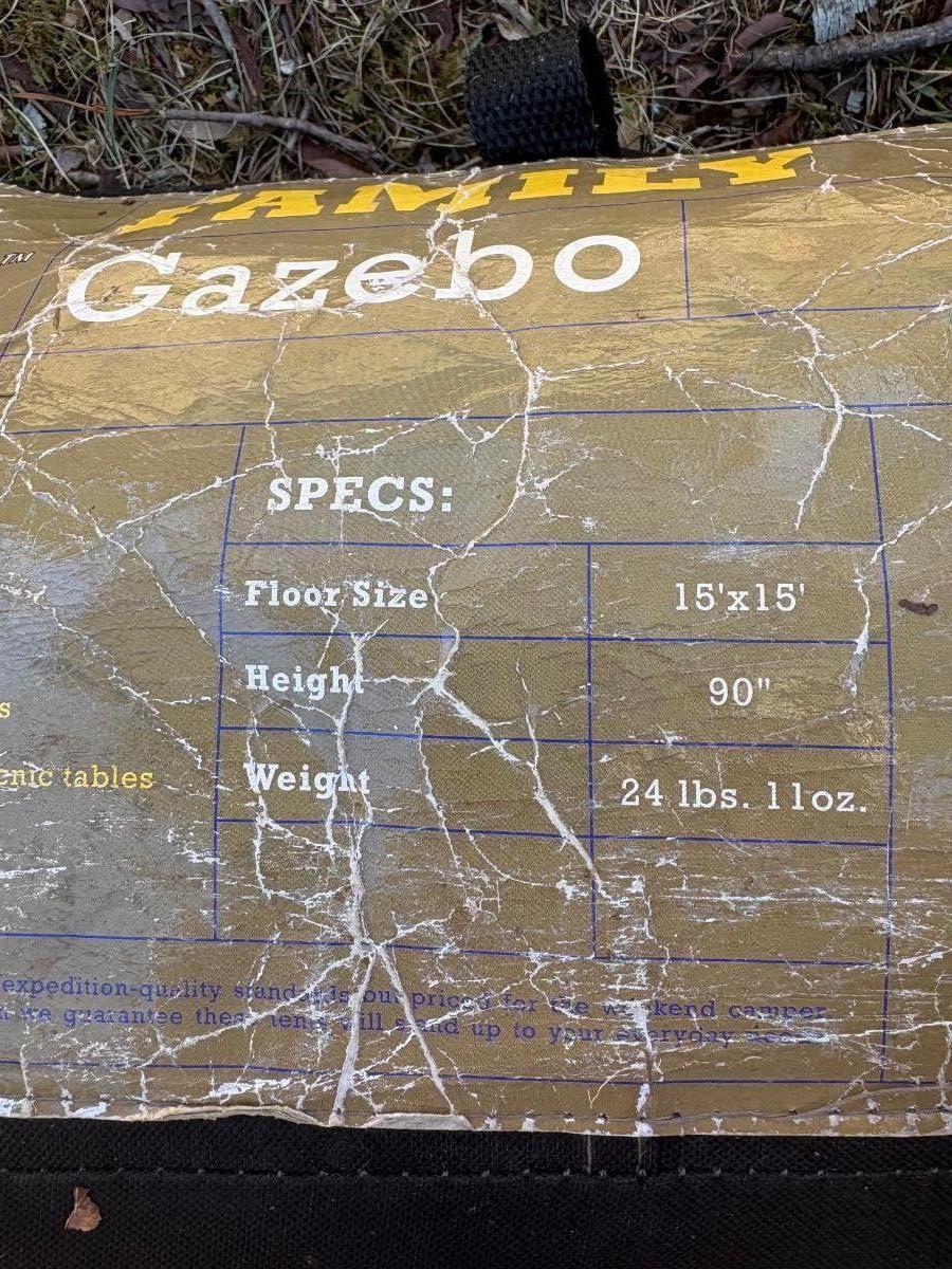 Four sided gazebo has two zip mesh entrances (zipper heads are corroded and did not move). Comes with roof and side poles plus stakes. 15’ x 15’ x 90”H. In good condition other than zipper issue.