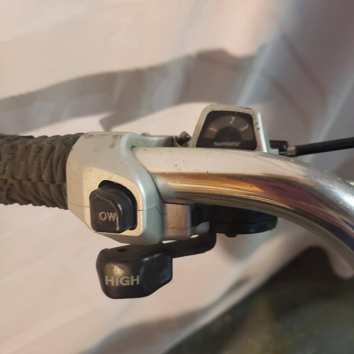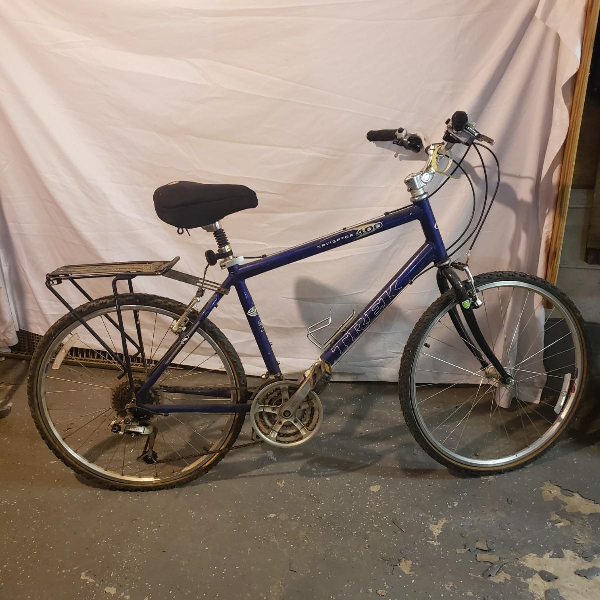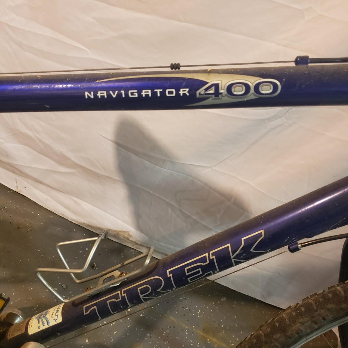 This is a Trek Navigator 400 eight gear bike. It comes with a back rack a gel Bell seat and a jingle bell! With a little love, you could be cruising! The frame is 18.5" according to the sticker on the frame. The tires are flat.