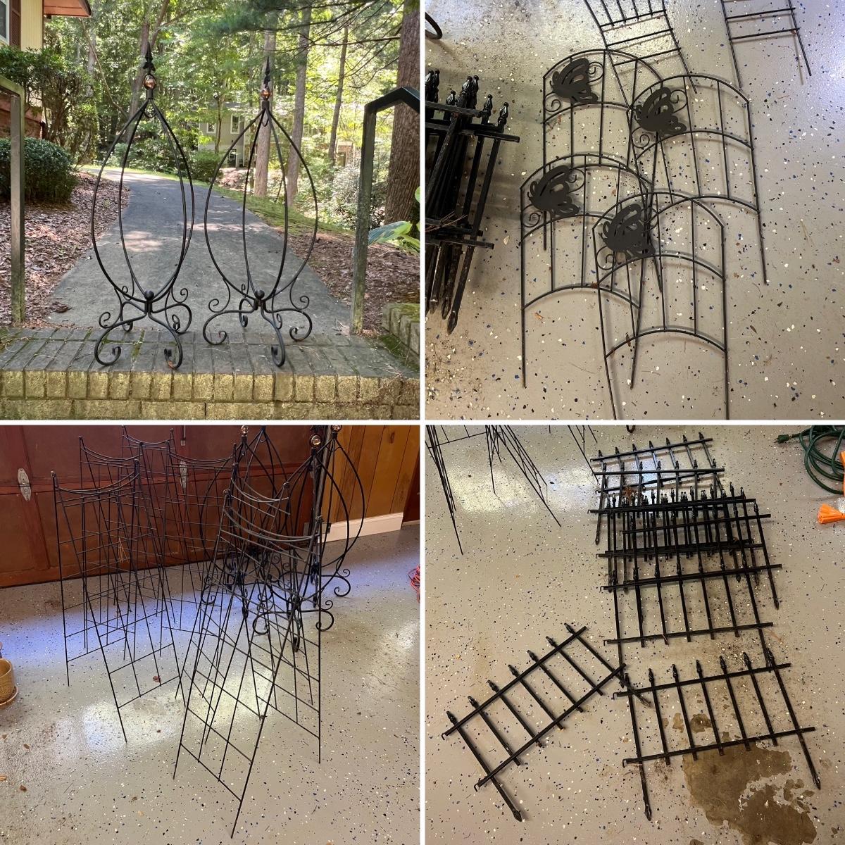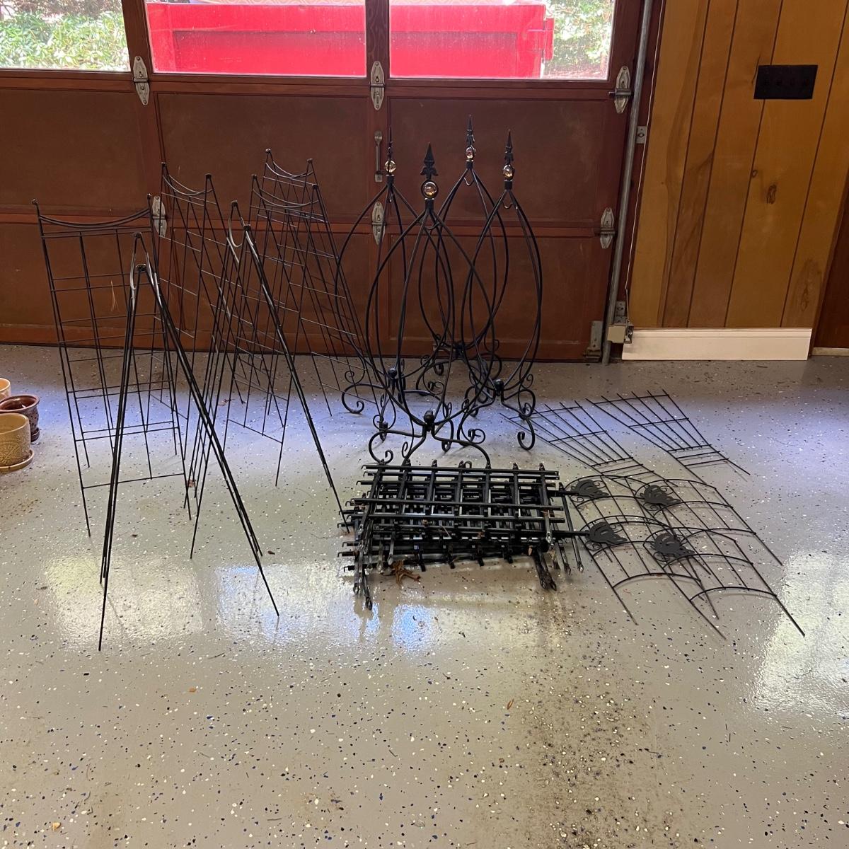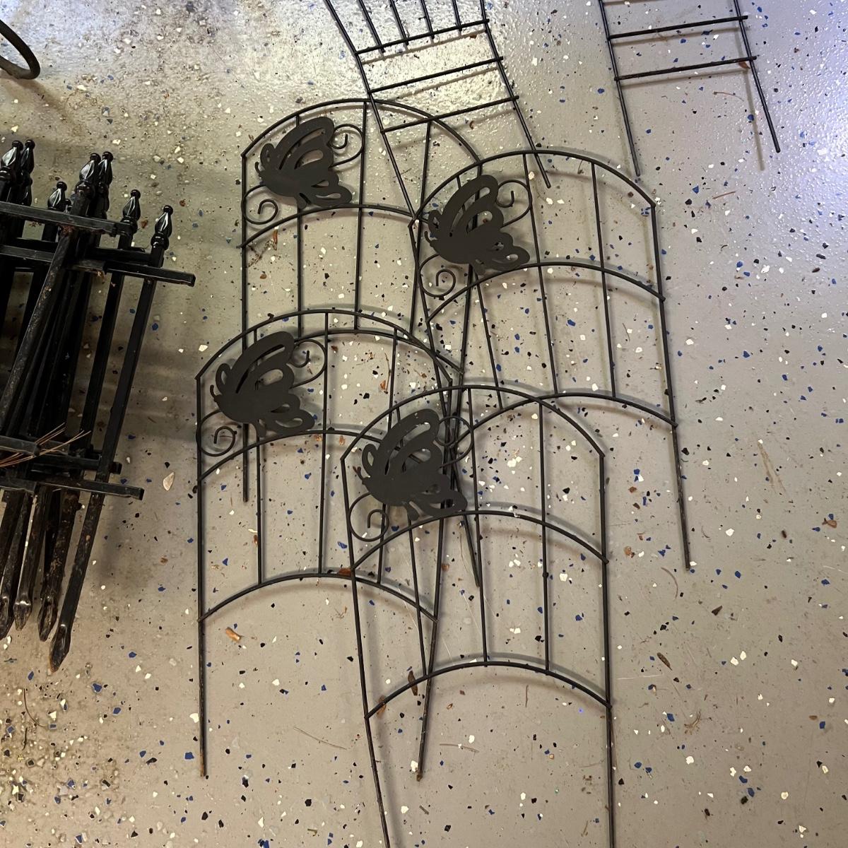 This lot includes four tulip shaped stands to hang plants that have glass ball embellishments and measure 12” x 12” x 40”H. Also included are decorative yard stakes, six folding trellis, nine sections of border fence and more.