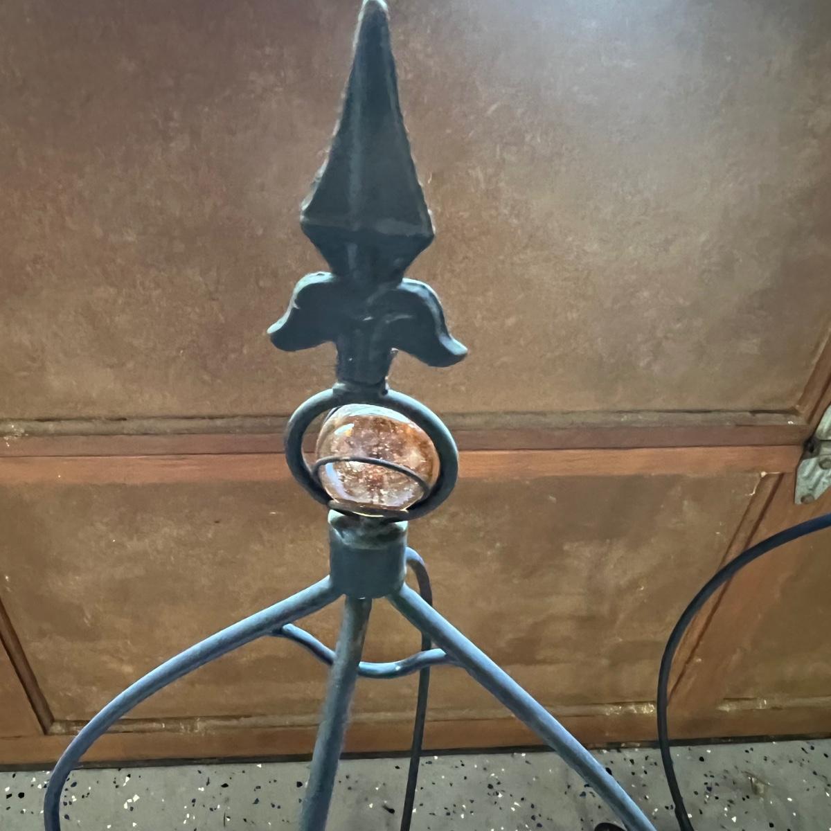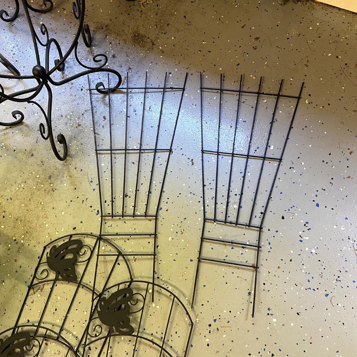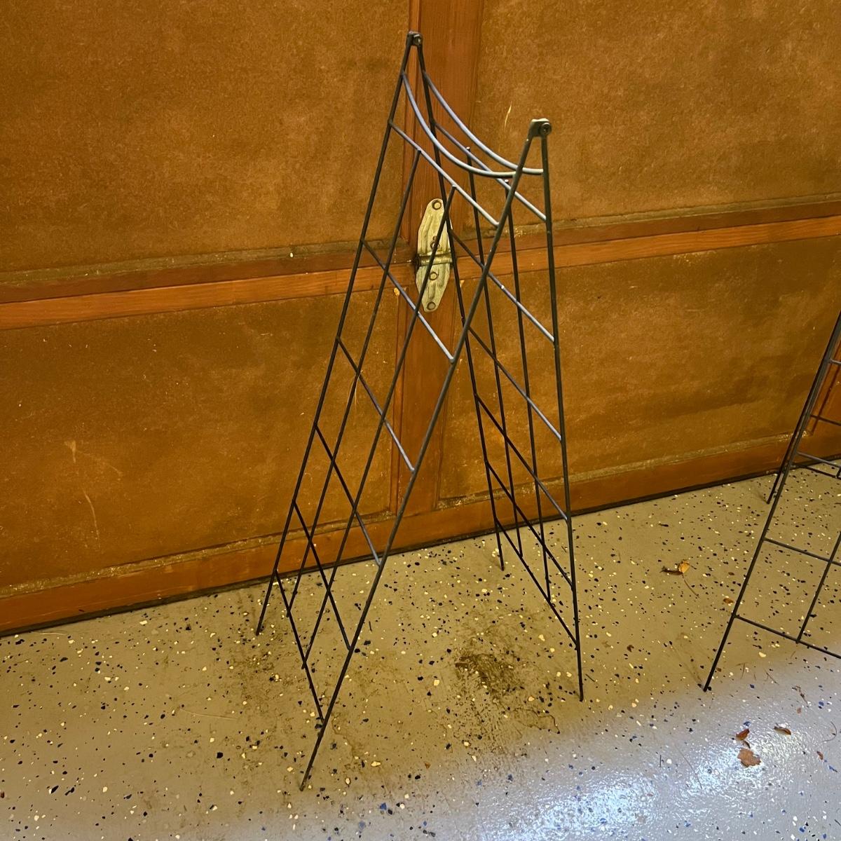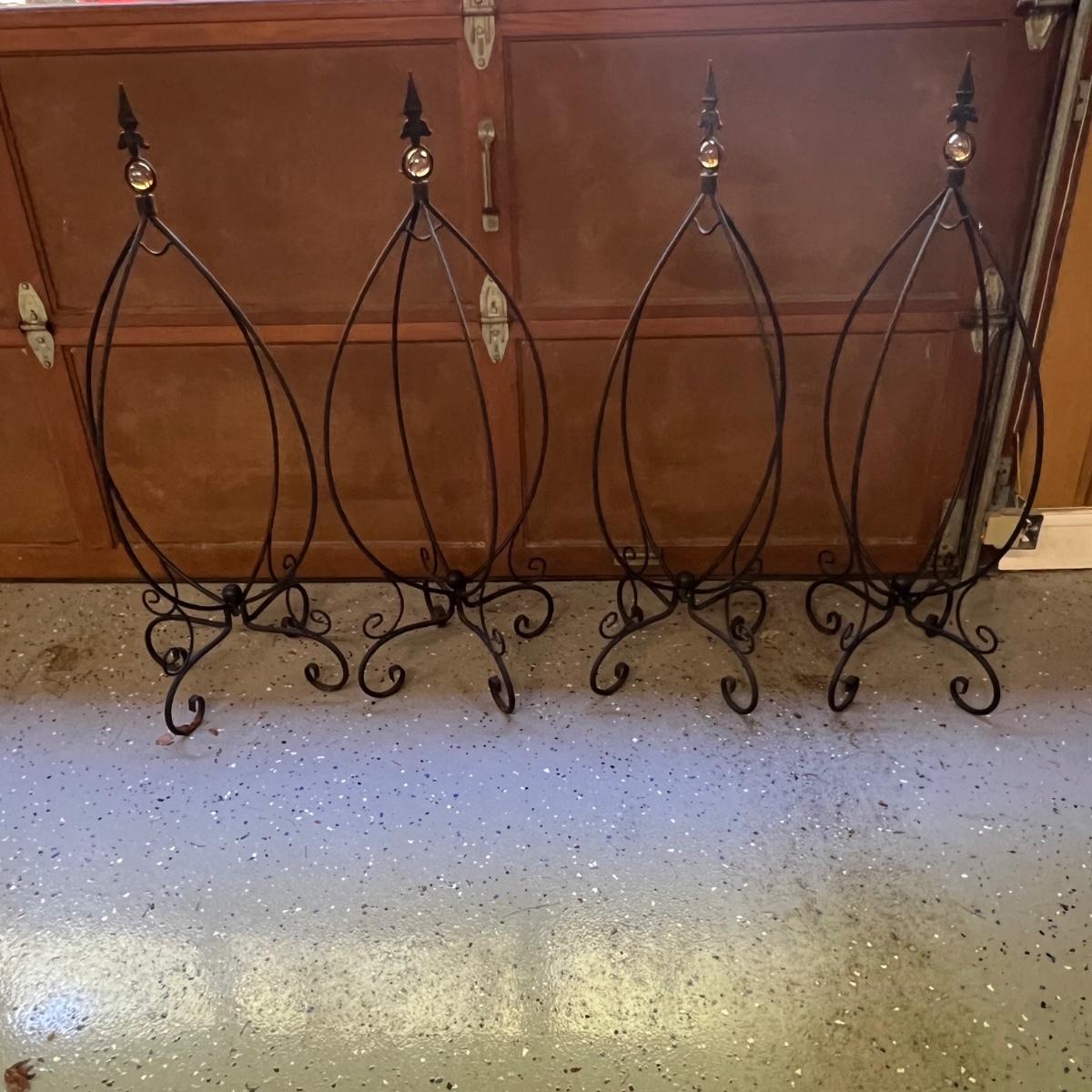 This lot includes four tulip shaped stands to hang plants that have glass ball embellishments and measure 12” x 12” x 40”H. Also included are decorative yard stakes, six folding trellis, nine sections of border fence and more.