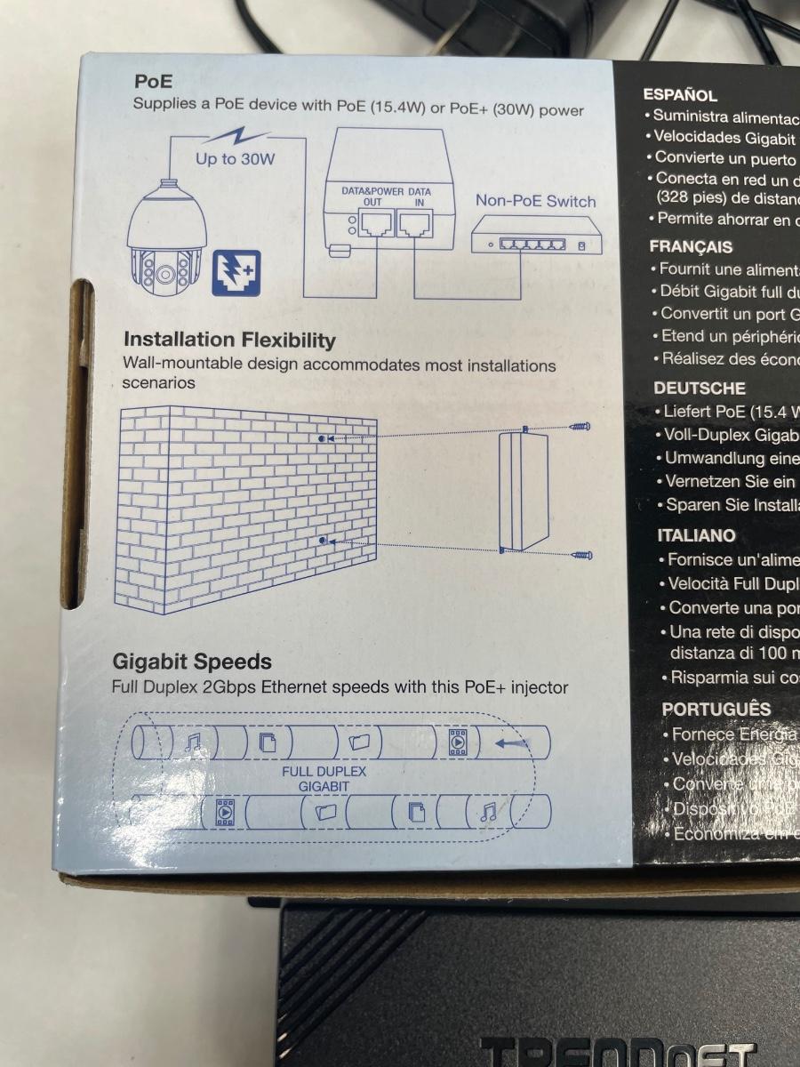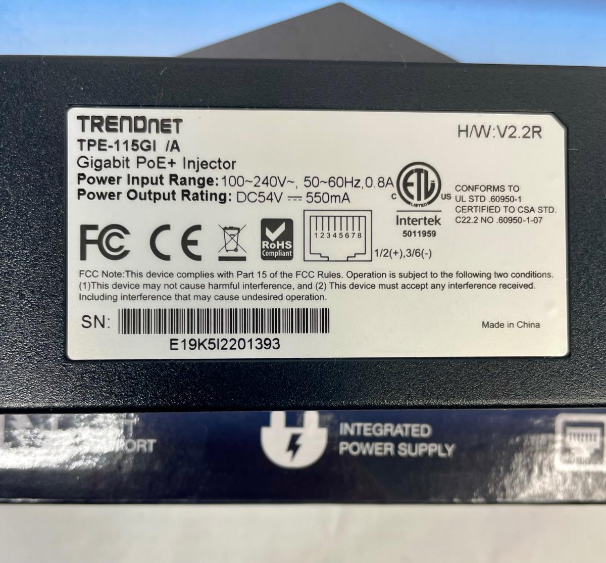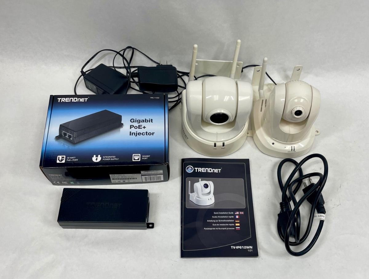 2 cameras (TV-IP612WN and TV-IP651W), both by TRENDNET. Also a Power over Ethernet Gigabit Injector module, all with power cords. Look to be in new condition. Untested, but look fine.