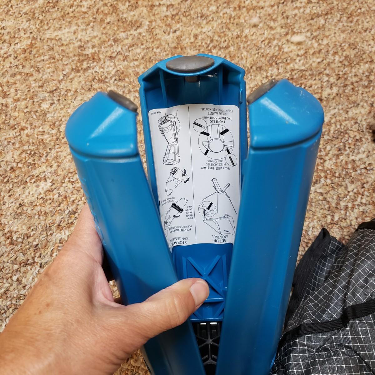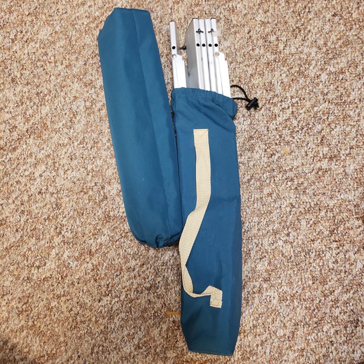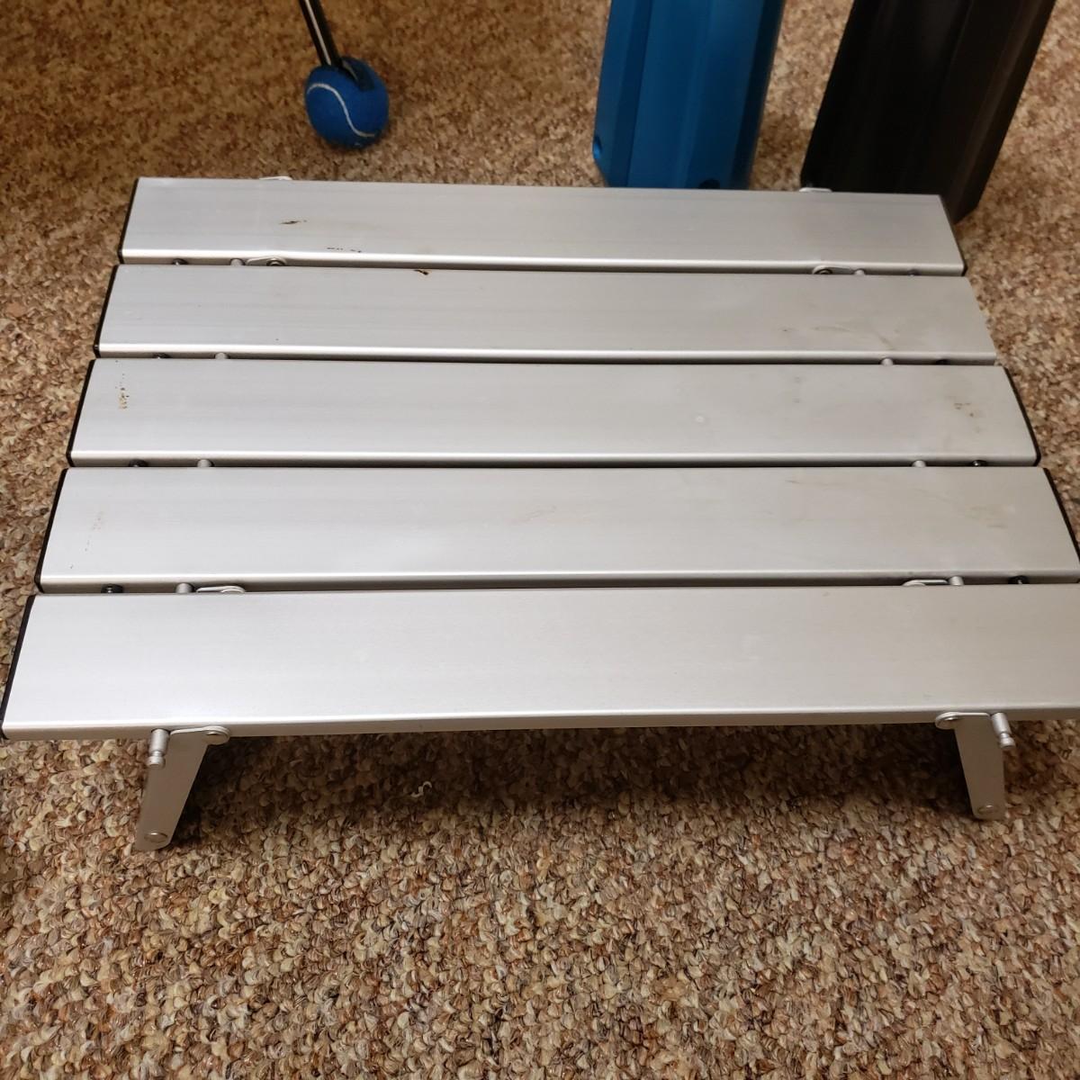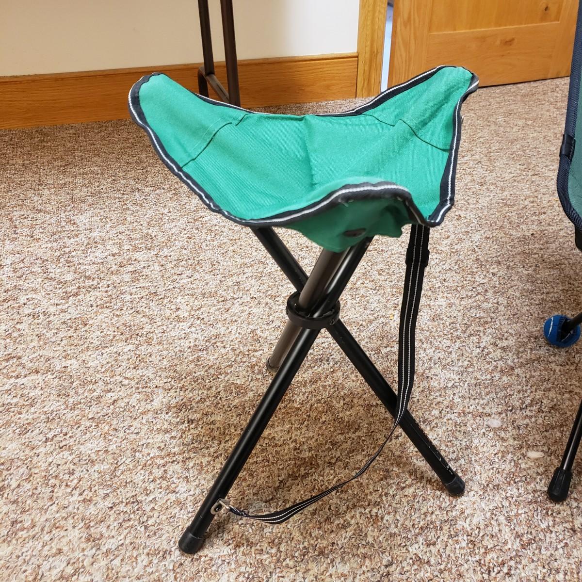 This lot features three chairs, a stool and two micro-tables. There is a Helinox collapsible chair that measures approximately 20" x 17" x 28" H. It folds up into a carrying case. There are two micro aluminum tables that fold down and have a bag for easy storage. Unfolded the table measures 16" x 11" x 4"H. One table has some marks on the top. The Variety stool folds up and has a carrying strap. The two identical TreO chairs also measure approximately 20" x 17" x 28" H. See pictures for details.