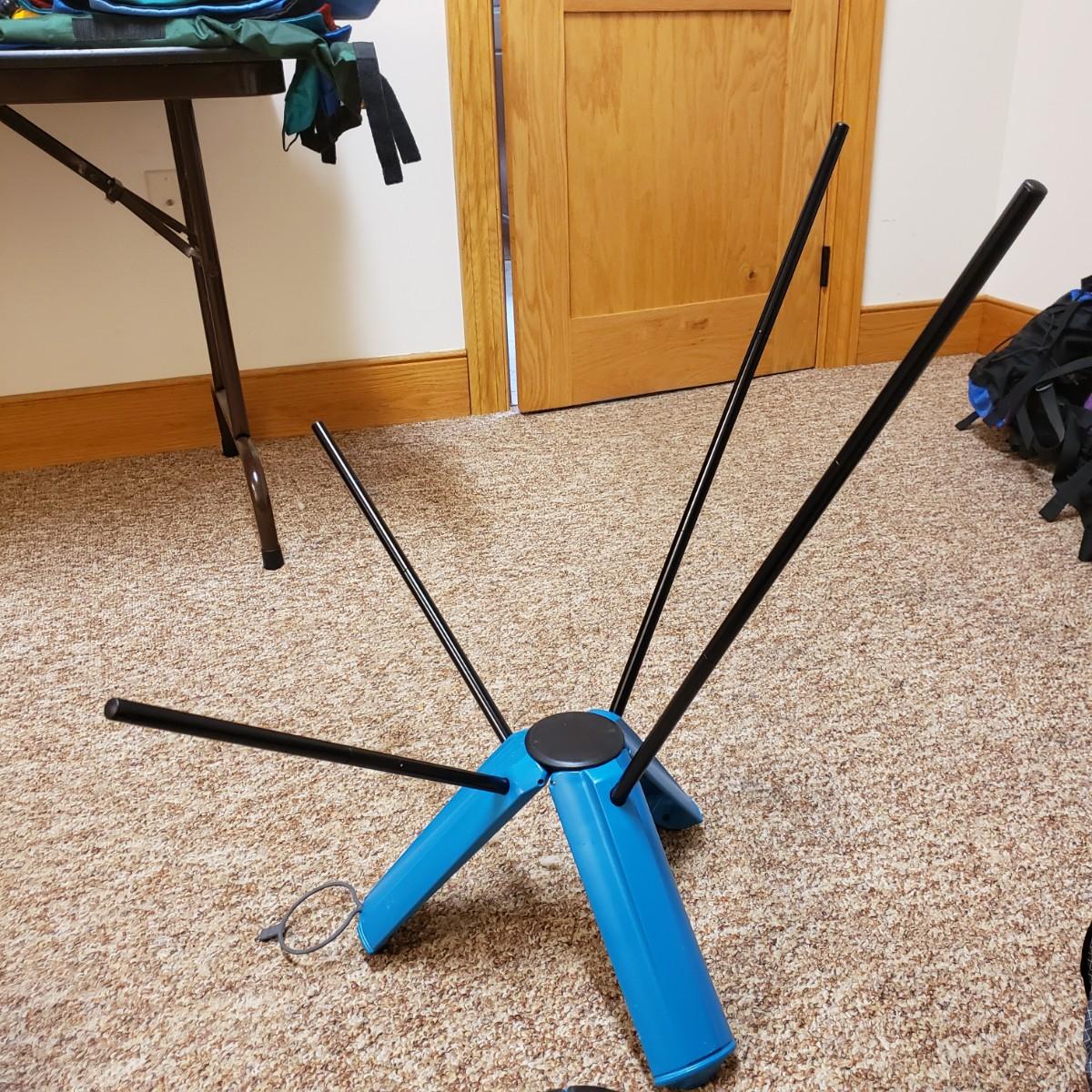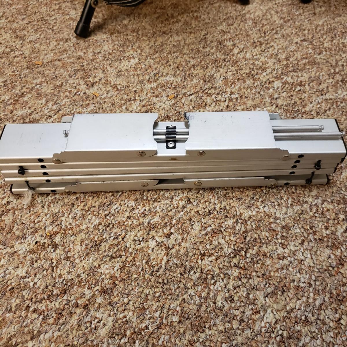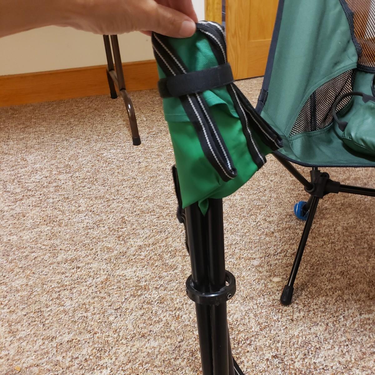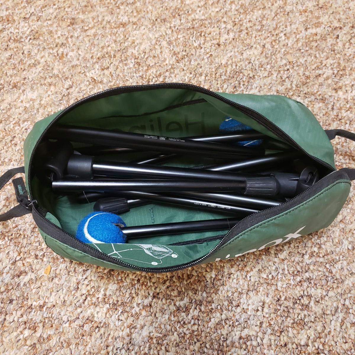 This lot features three chairs, a stool and two micro-tables. There is a Helinox collapsible chair that measures approximately 20" x 17" x 28" H. It folds up into a carrying case. There are two micro aluminum tables that fold down and have a bag for easy storage. Unfolded the table measures 16" x 11" x 4"H. One table has some marks on the top. The Variety stool folds up and has a carrying strap. The two identical TreO chairs also measure approximately 20" x 17" x 28" H. See pictures for details.