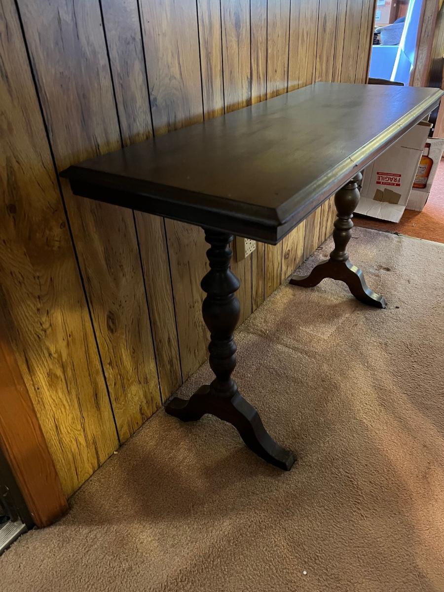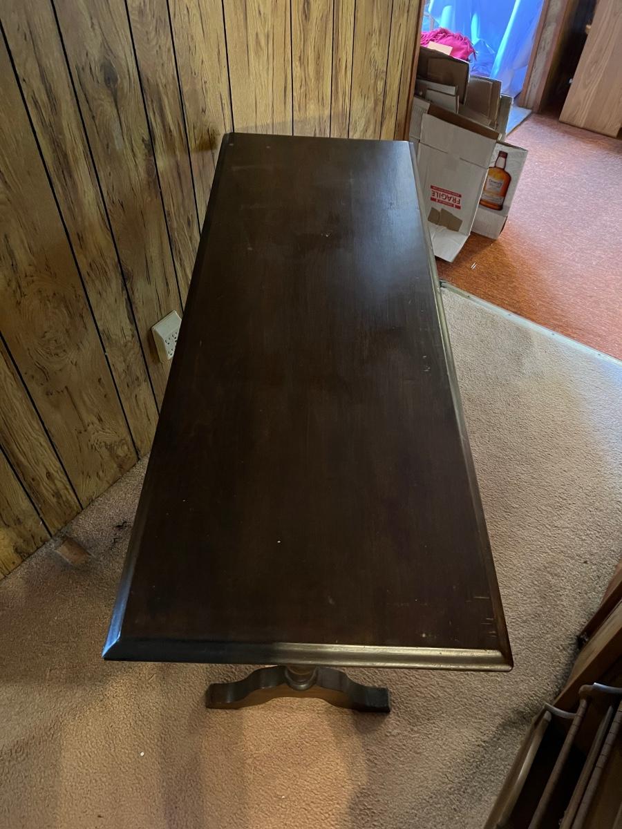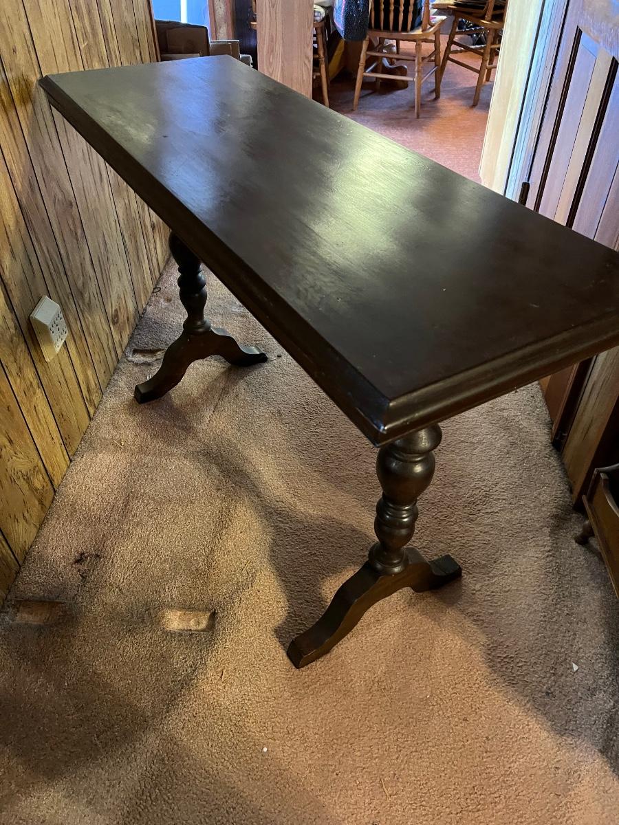 This dark stained solid wood sofa table has trestle style legs and measures 17” x 47.5” x 30”H. There are some scuff marks, see images.
