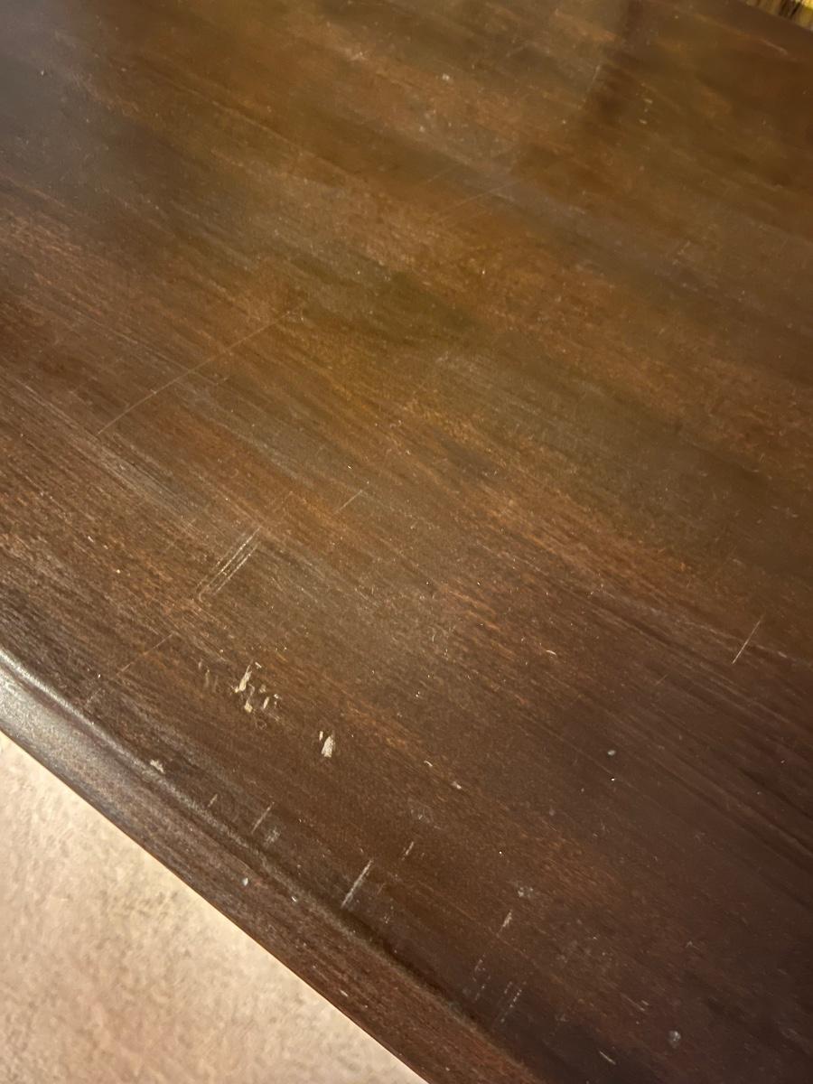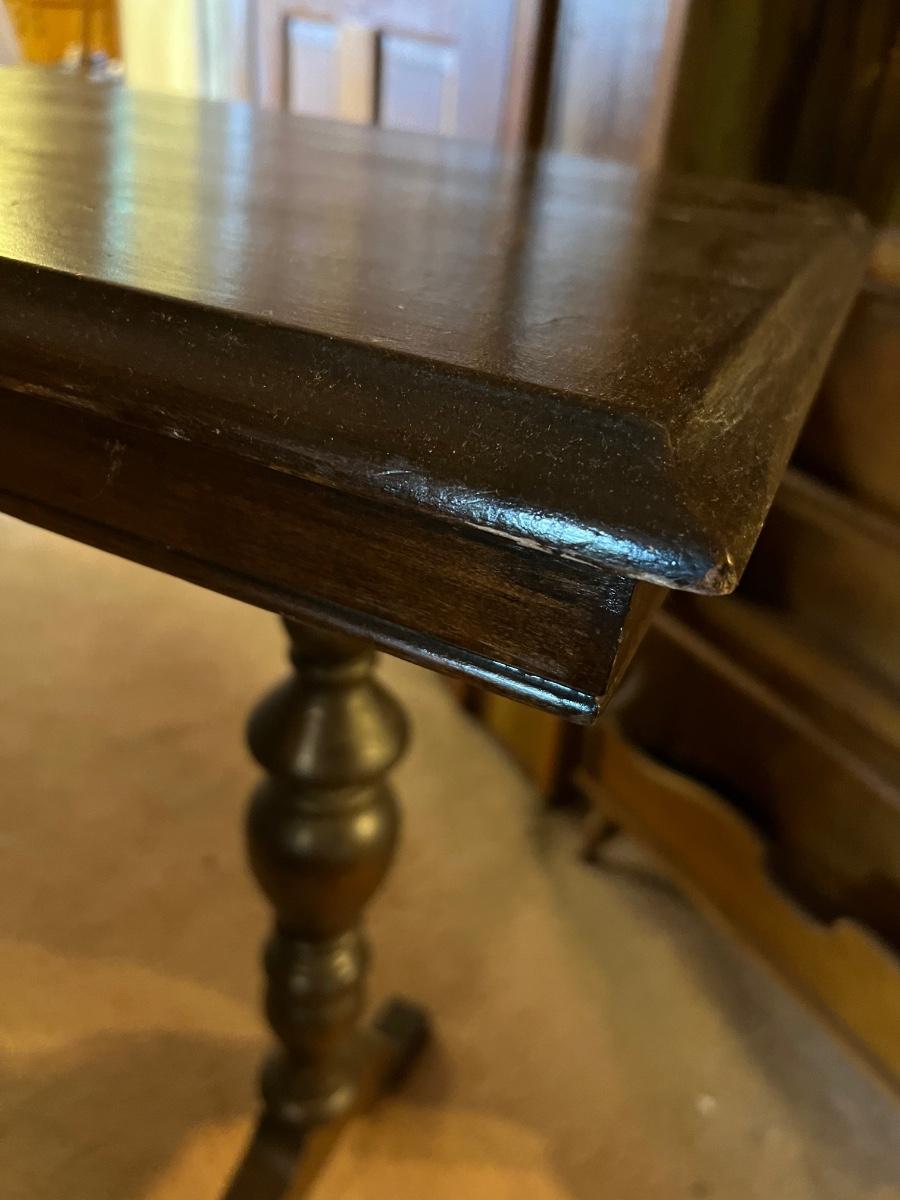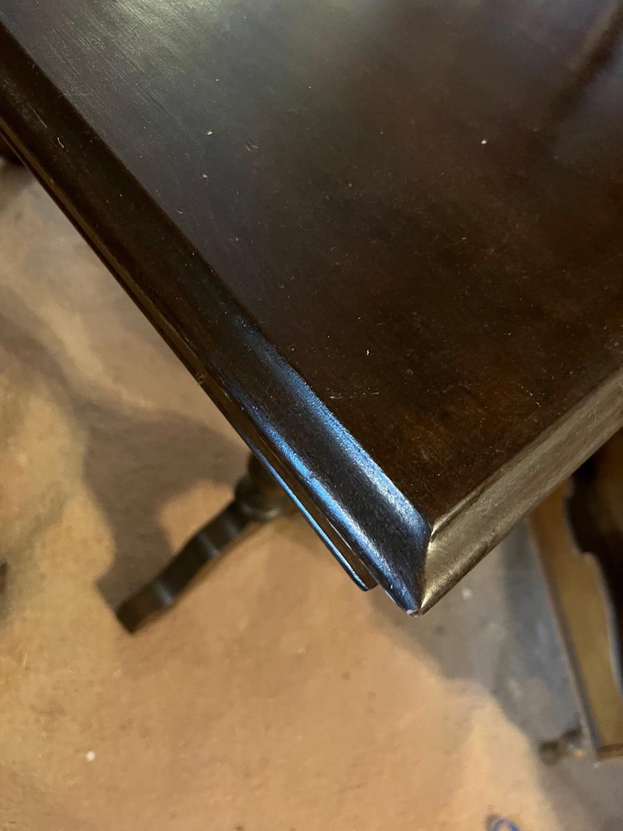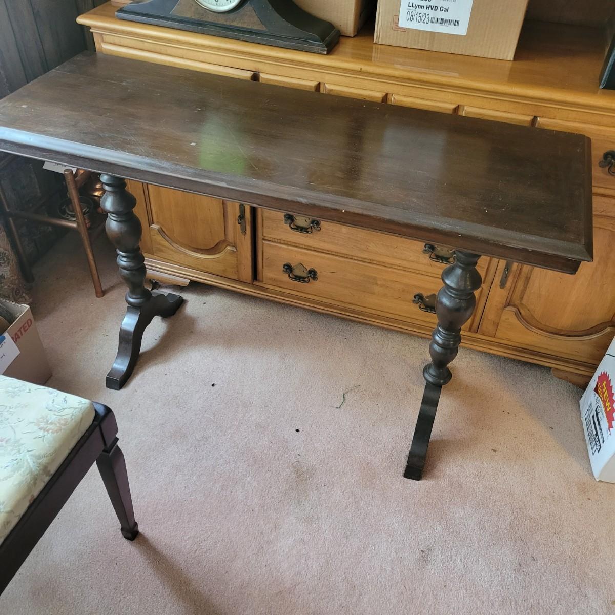 This dark stained solid wood sofa table has trestle style legs and measures 17” x 47.5” x 30”H. There are some scuff marks, see images.