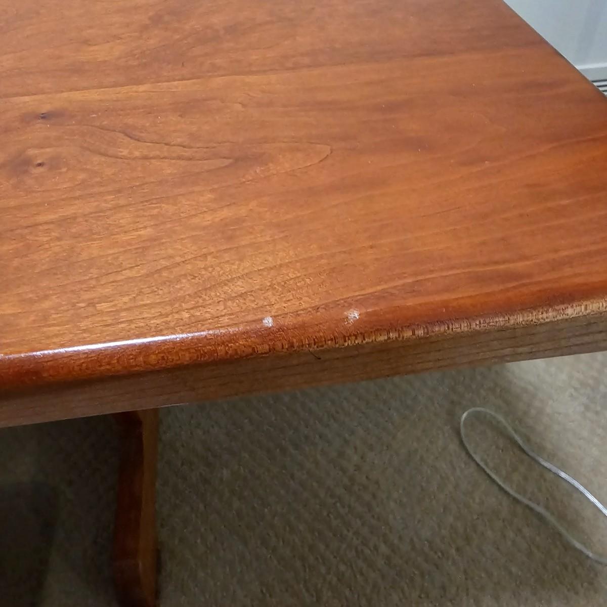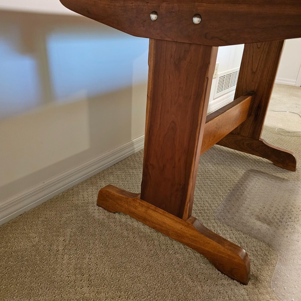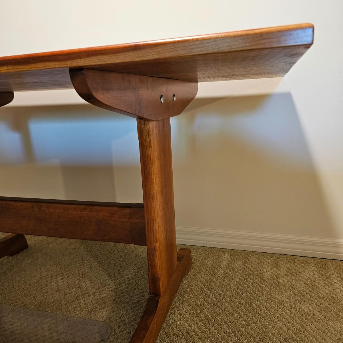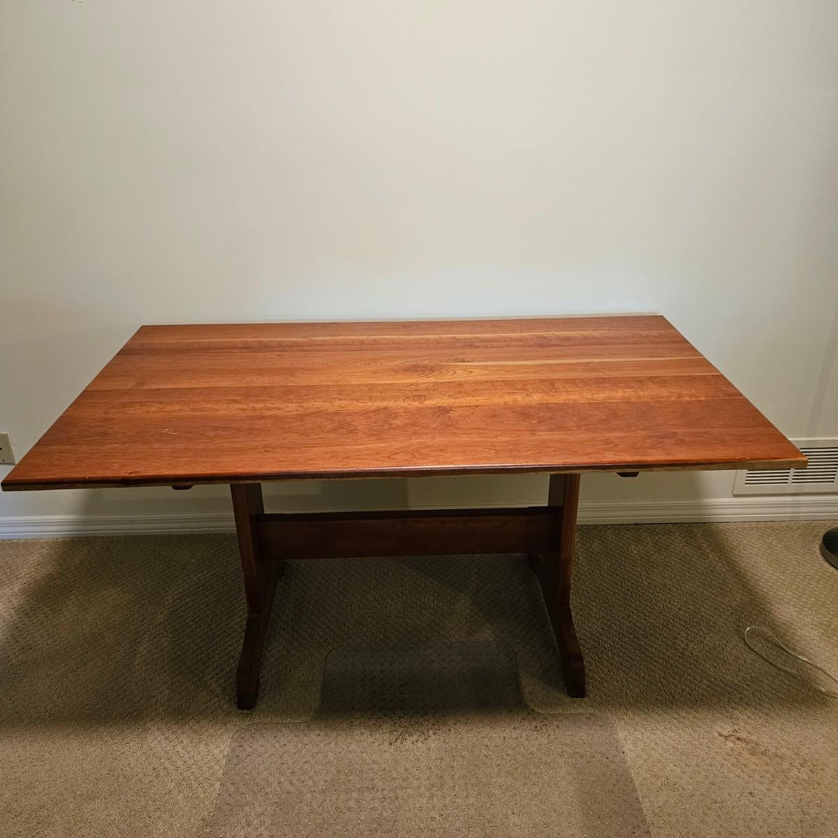 Solid wood trestle style table with two support posts. Table measures 60" x 34" x 29"H. Small scratches on top and edge, see photos for details. Local pickup only. Winning bidder must bring assistance to help move and load this item due to its weight and/or size. Item located in basement.