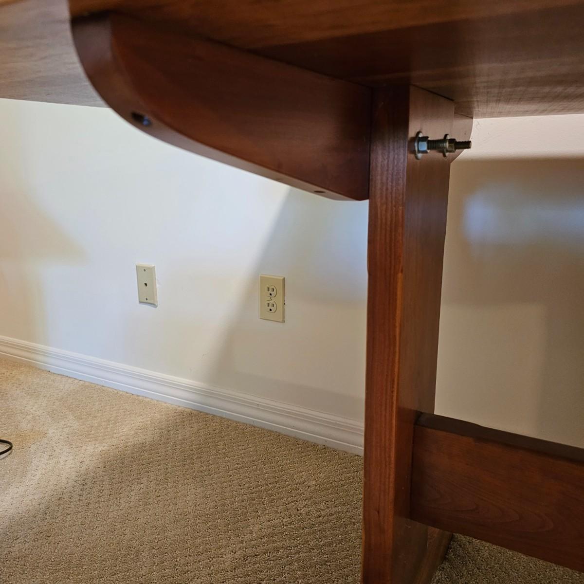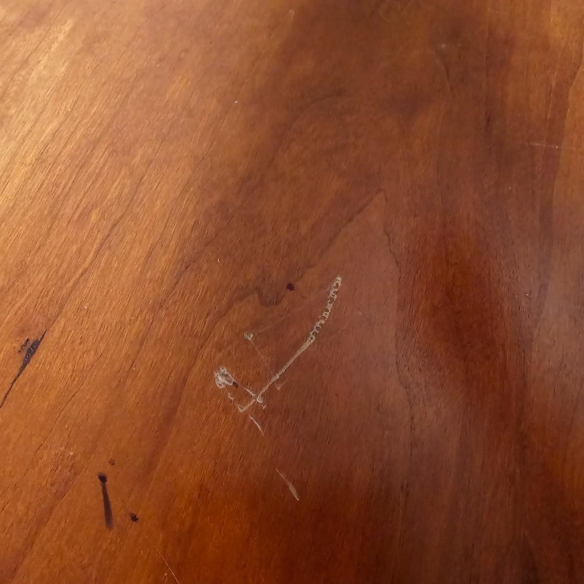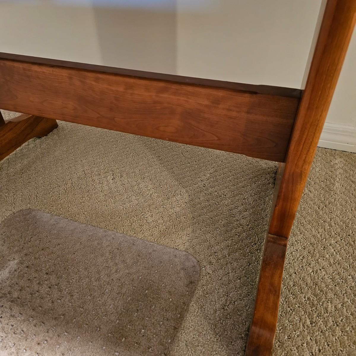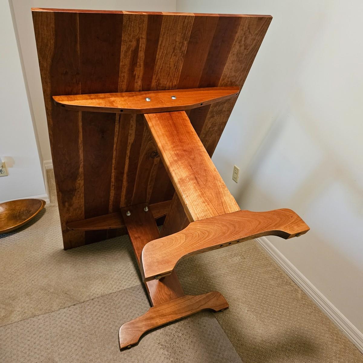 Solid wood trestle style table with two support posts. Table measures 60" x 34" x 29"H. Small scratches on top and edge, see photos for details. Local pickup only. Winning bidder must bring assistance to help move and load this item due to its weight and/or size. Item located in basement.