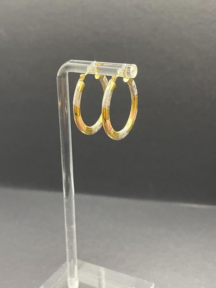 14K gold tri color hoop earrings. Good condition. 1.55 total grams. 1" drop.