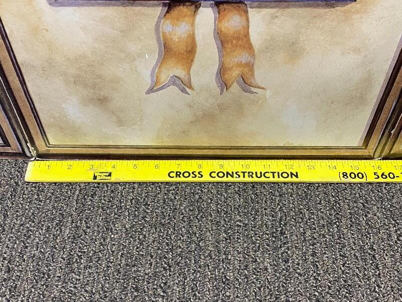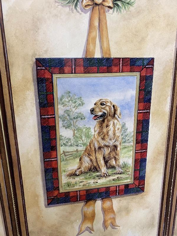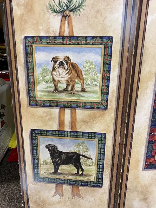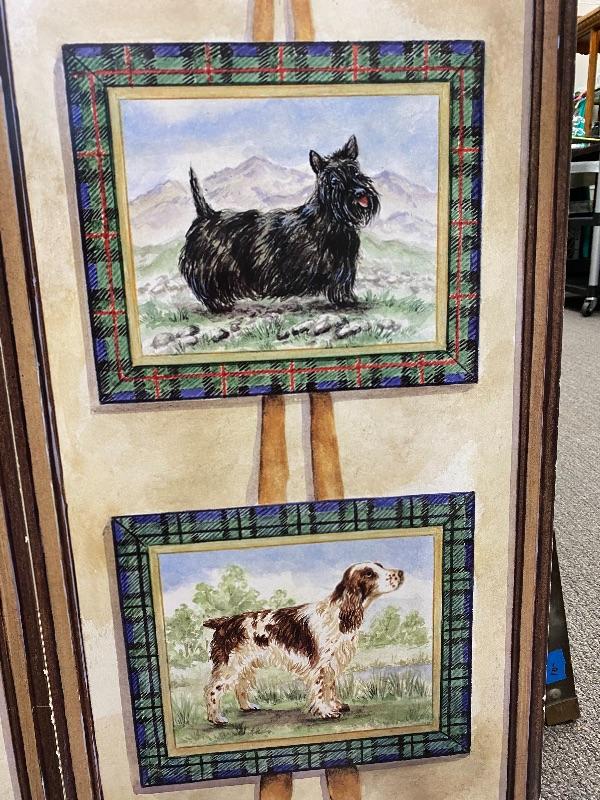 Adorable tri-fold fireplace cover, floor art. Features different images of dogs. Stands about 31" tall. Great for covering the fireplace front when not in use. Folds in three so width is sort of adjustable. The center section measures about 16" and the sides are each about 13". Does have some wear to edges, but in overall good condition.