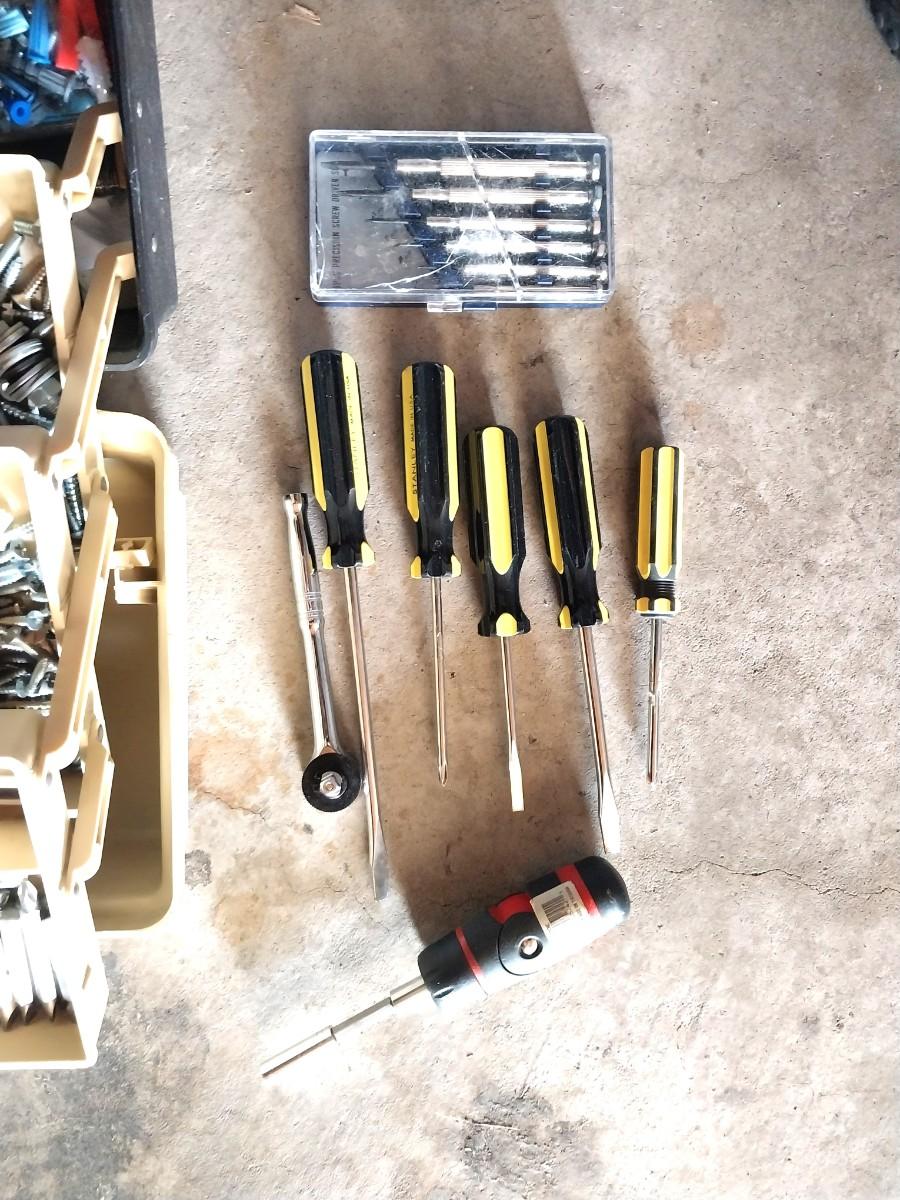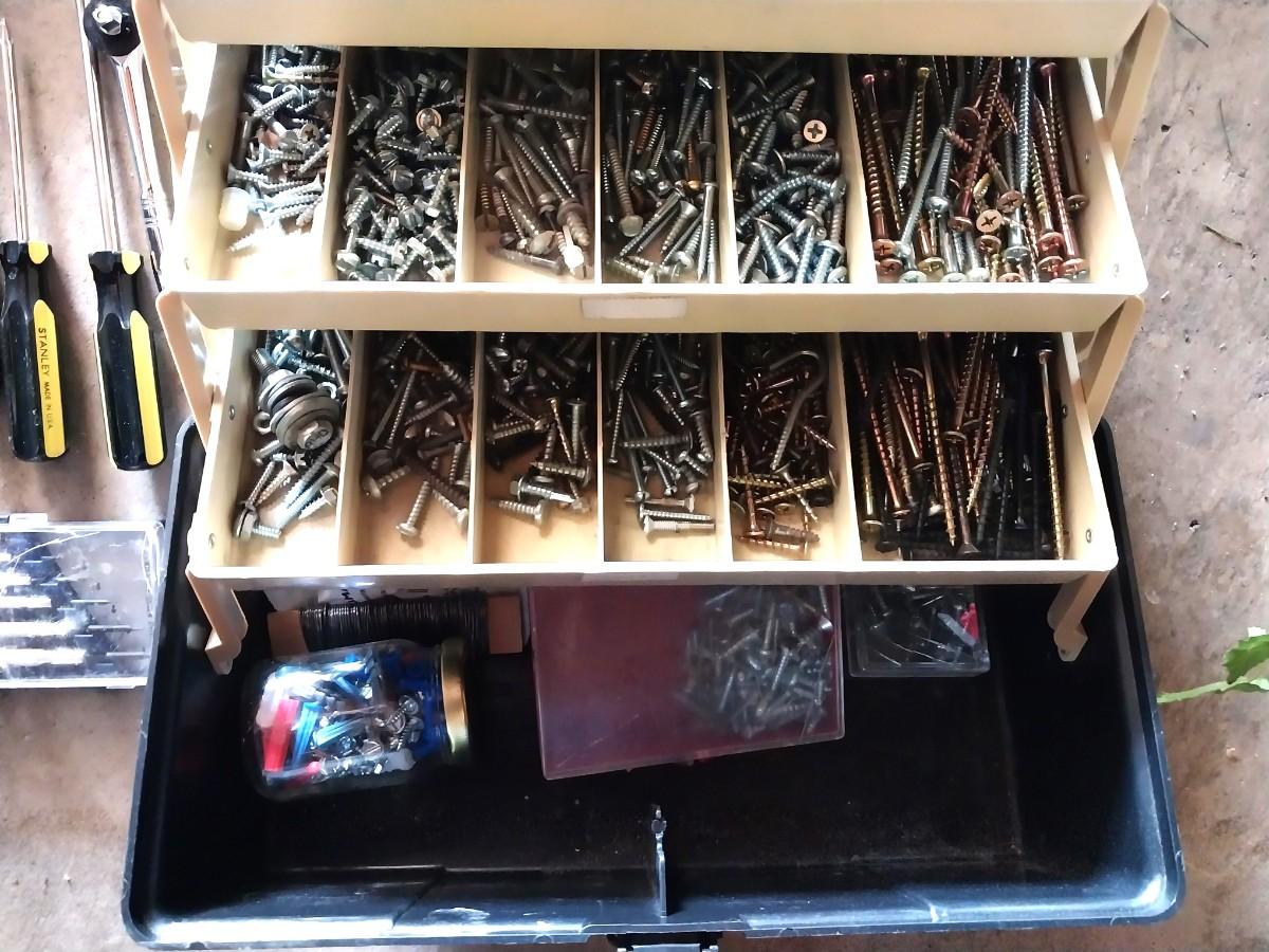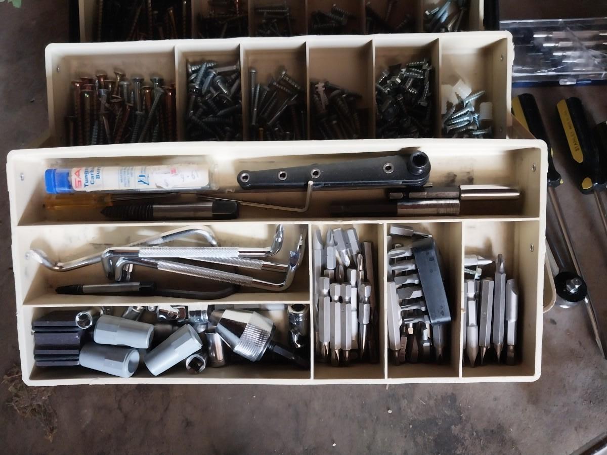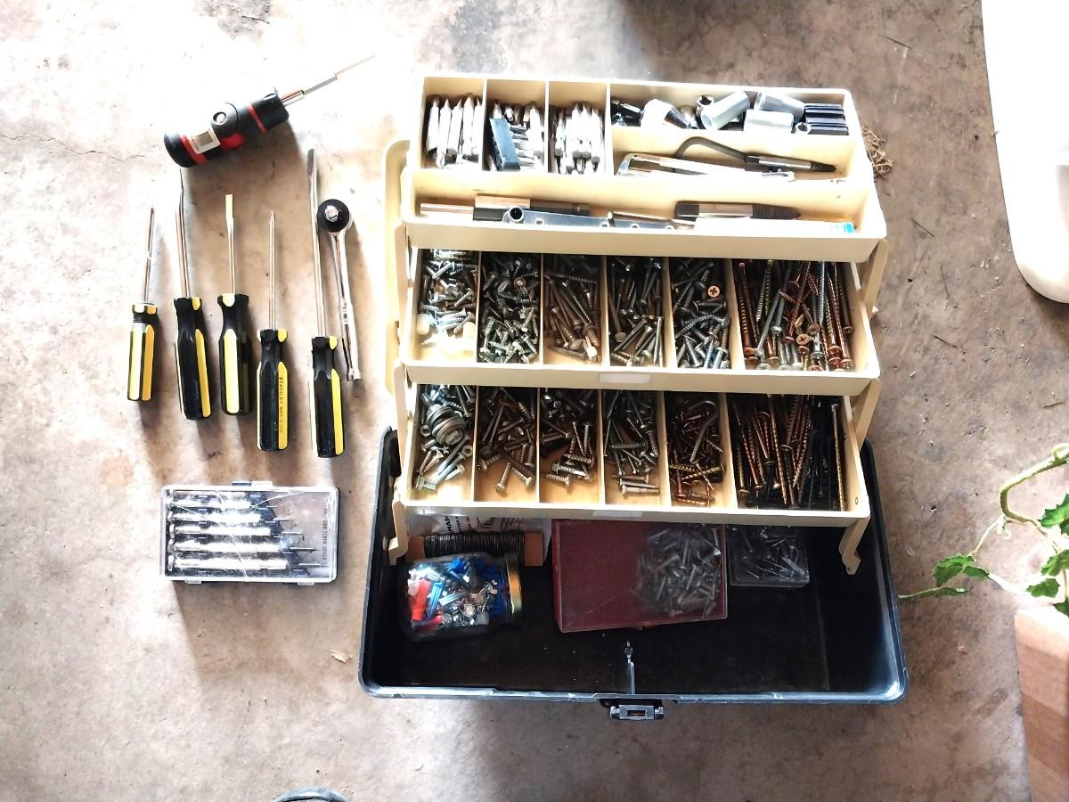 TRI LEVEL CARRY BOX FILLED WITH HARDWARE AND SCREW DRIVERS