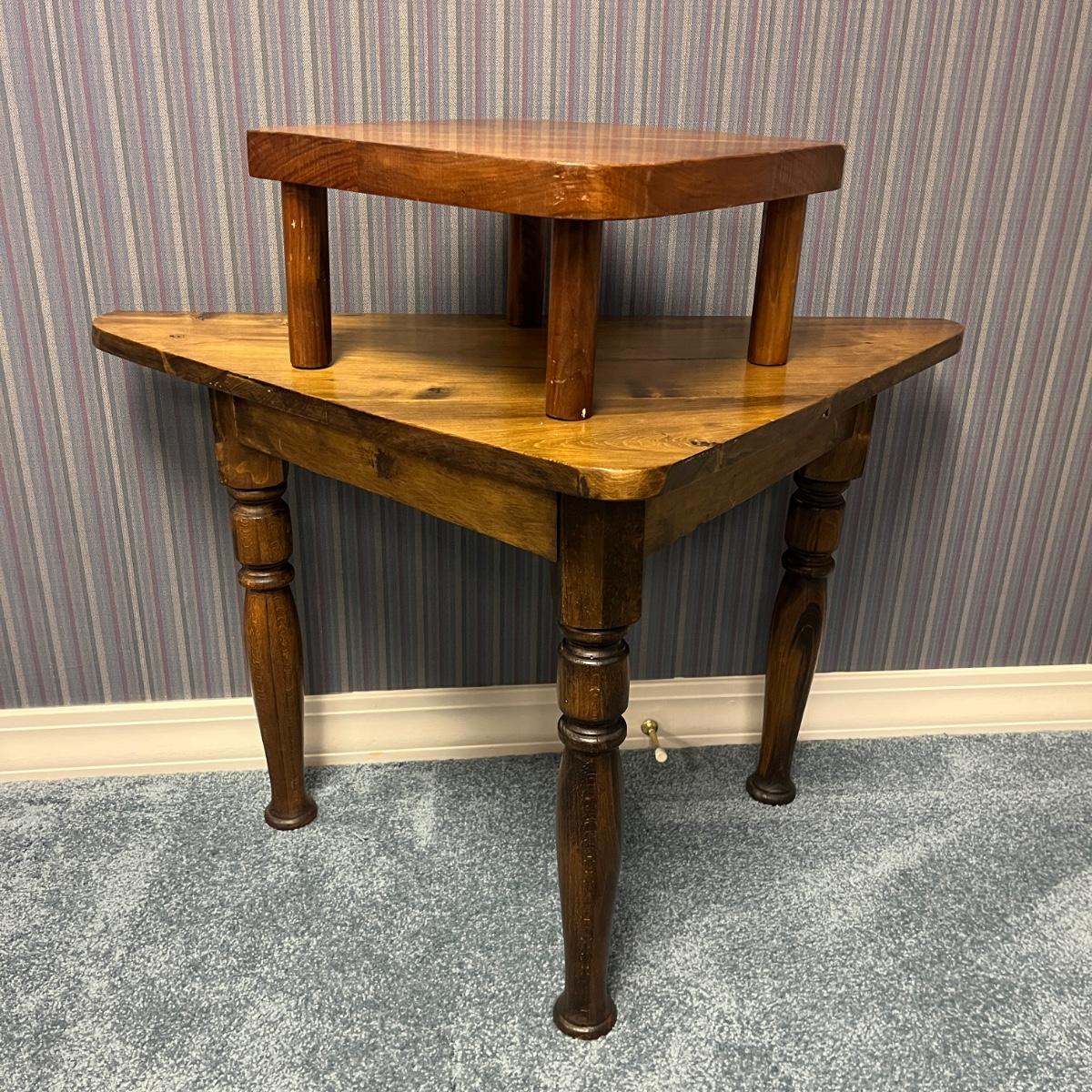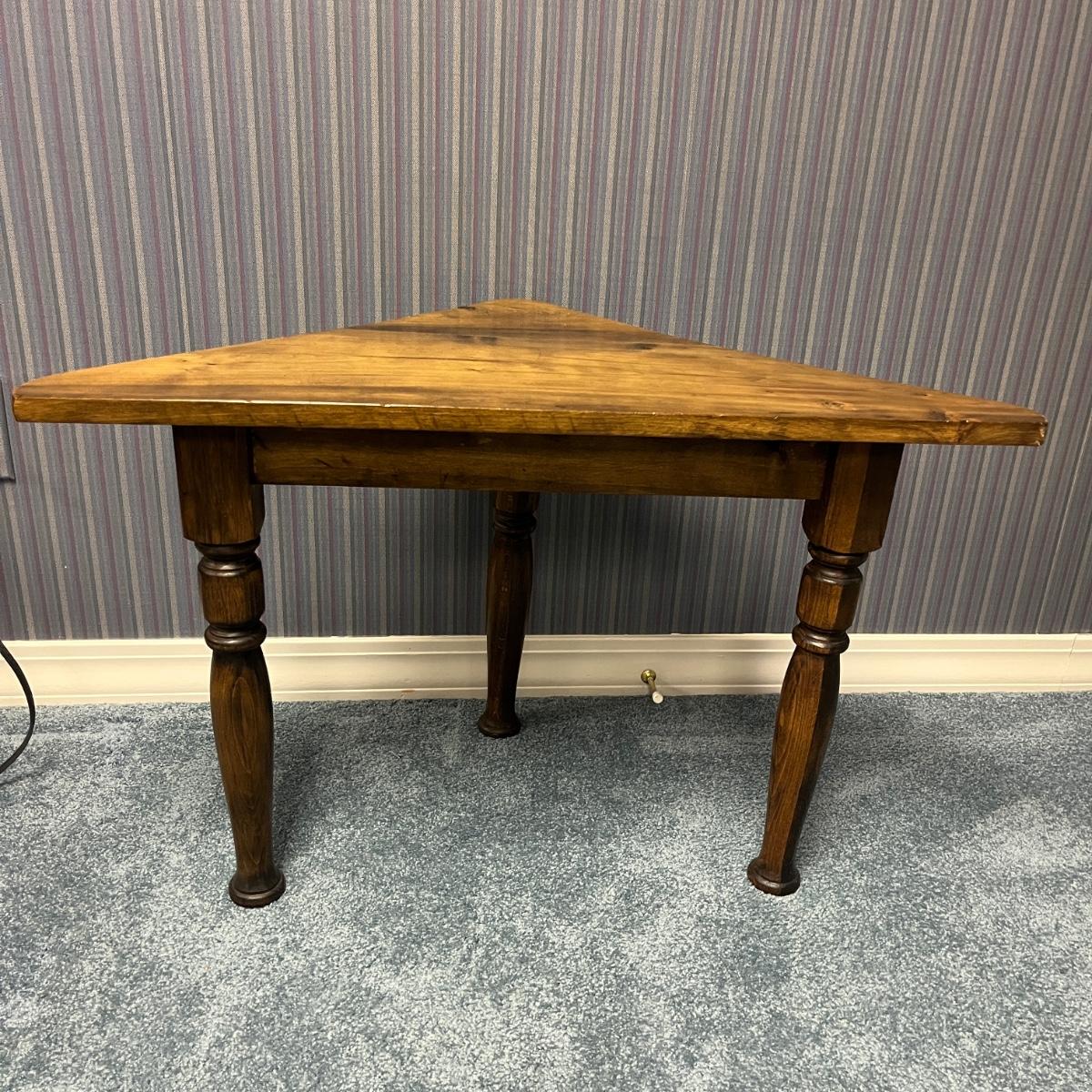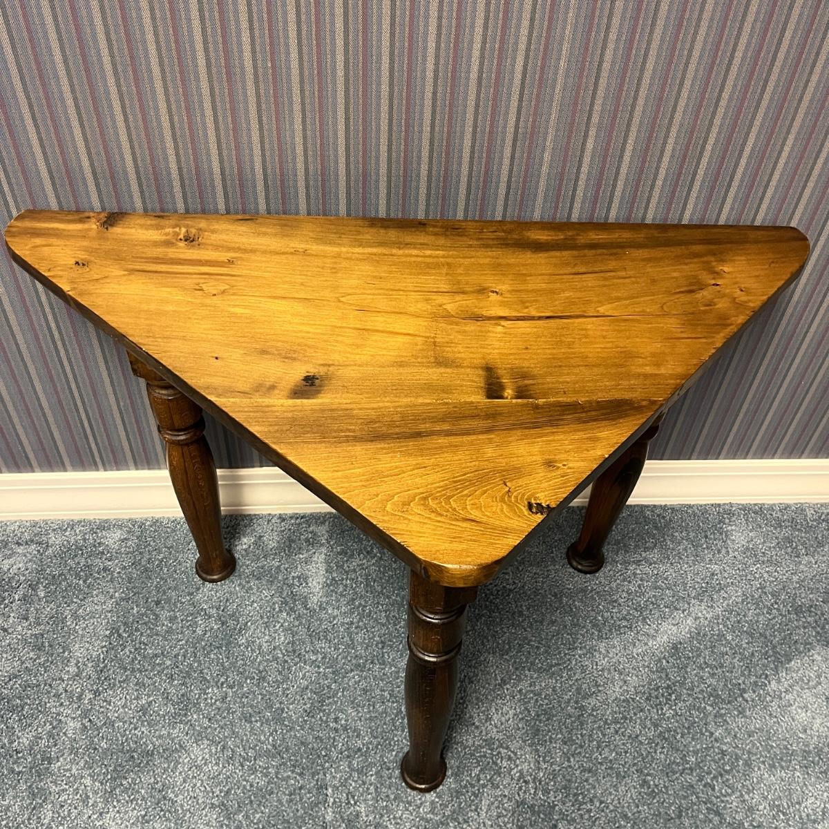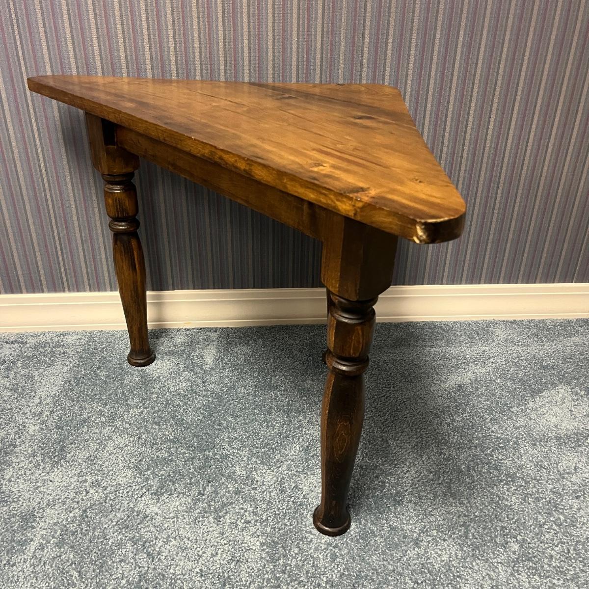 Triangle shaped side table measures 31” x 16.5” x 19.5”H and is solid wood. Also includes a diamond shaped solid wood foot stool.