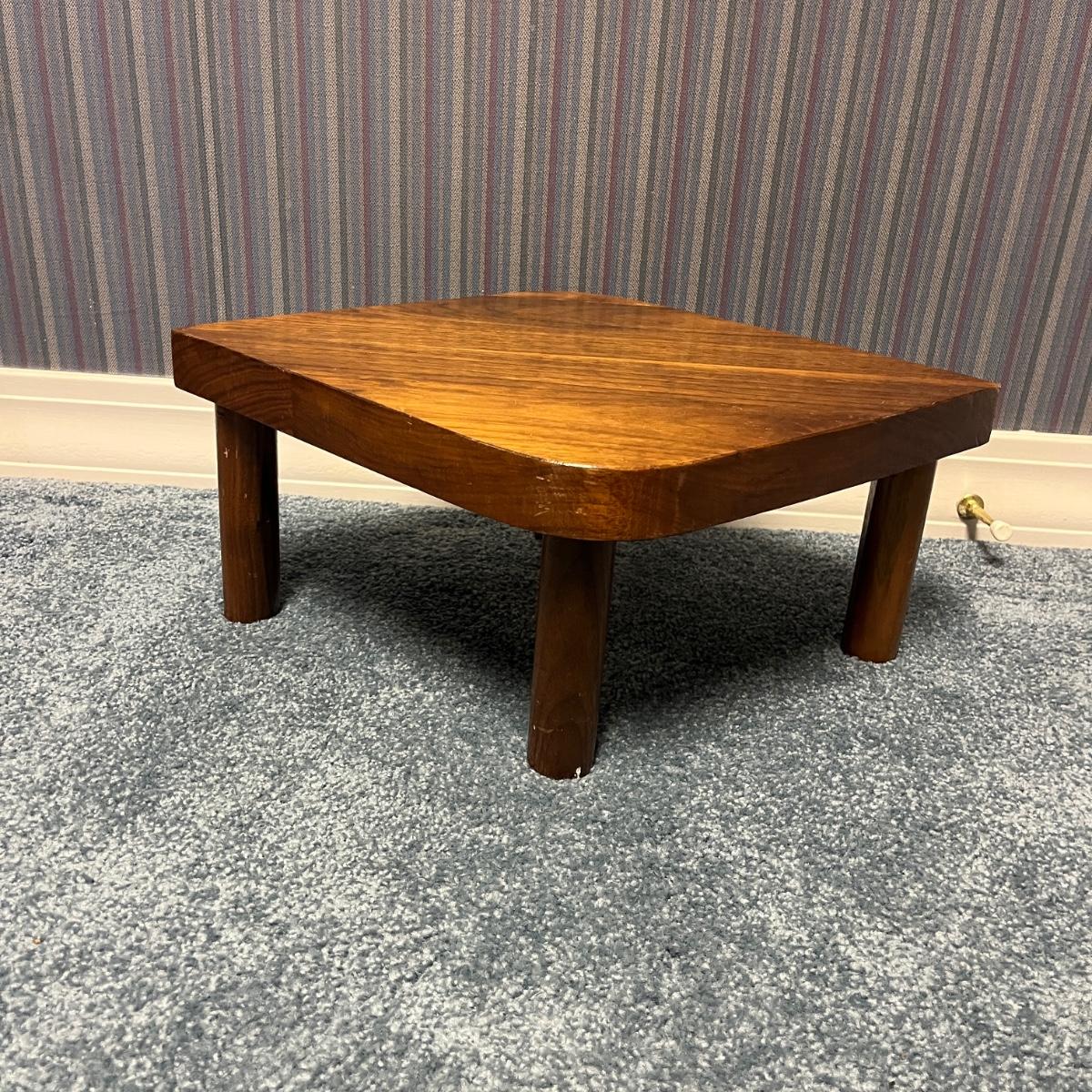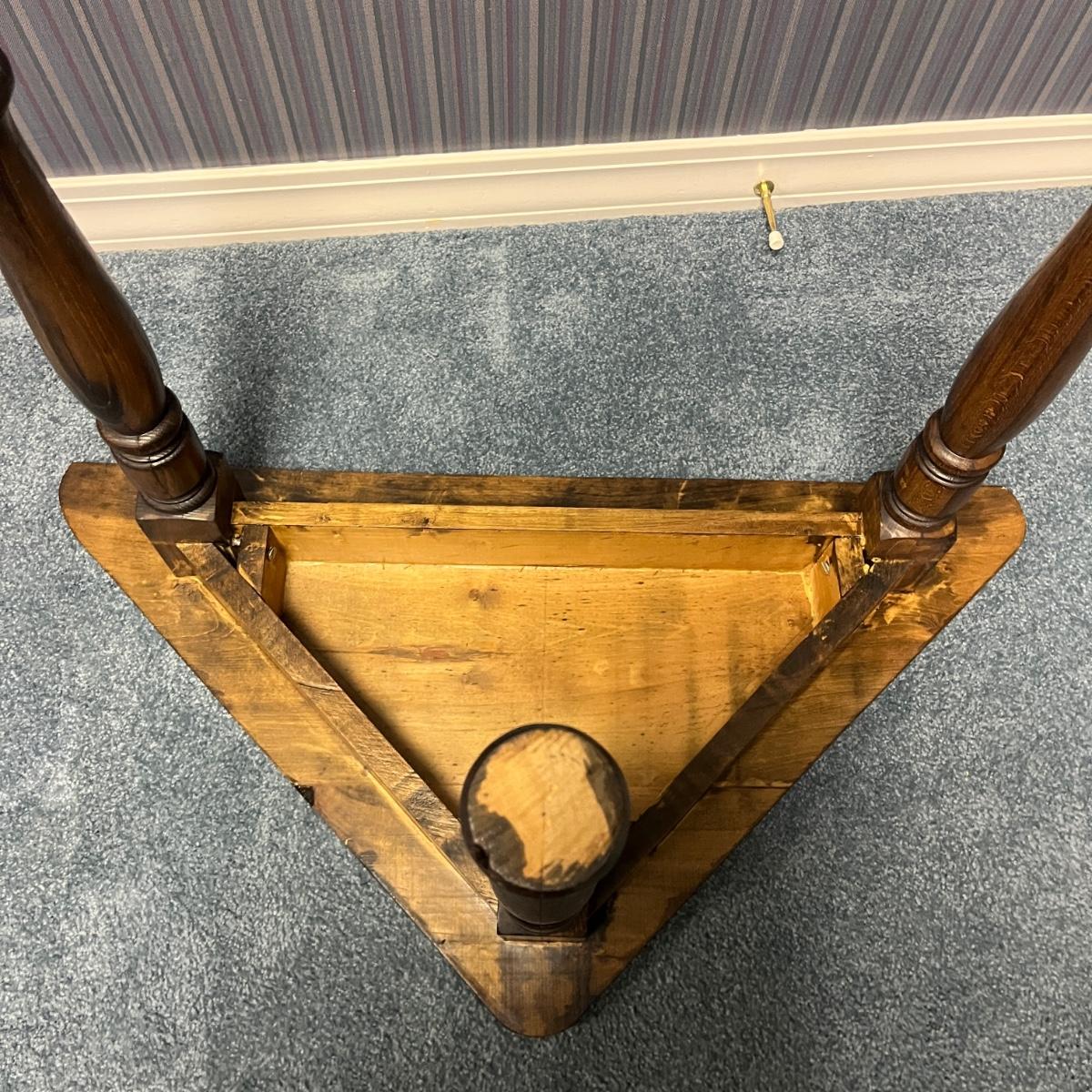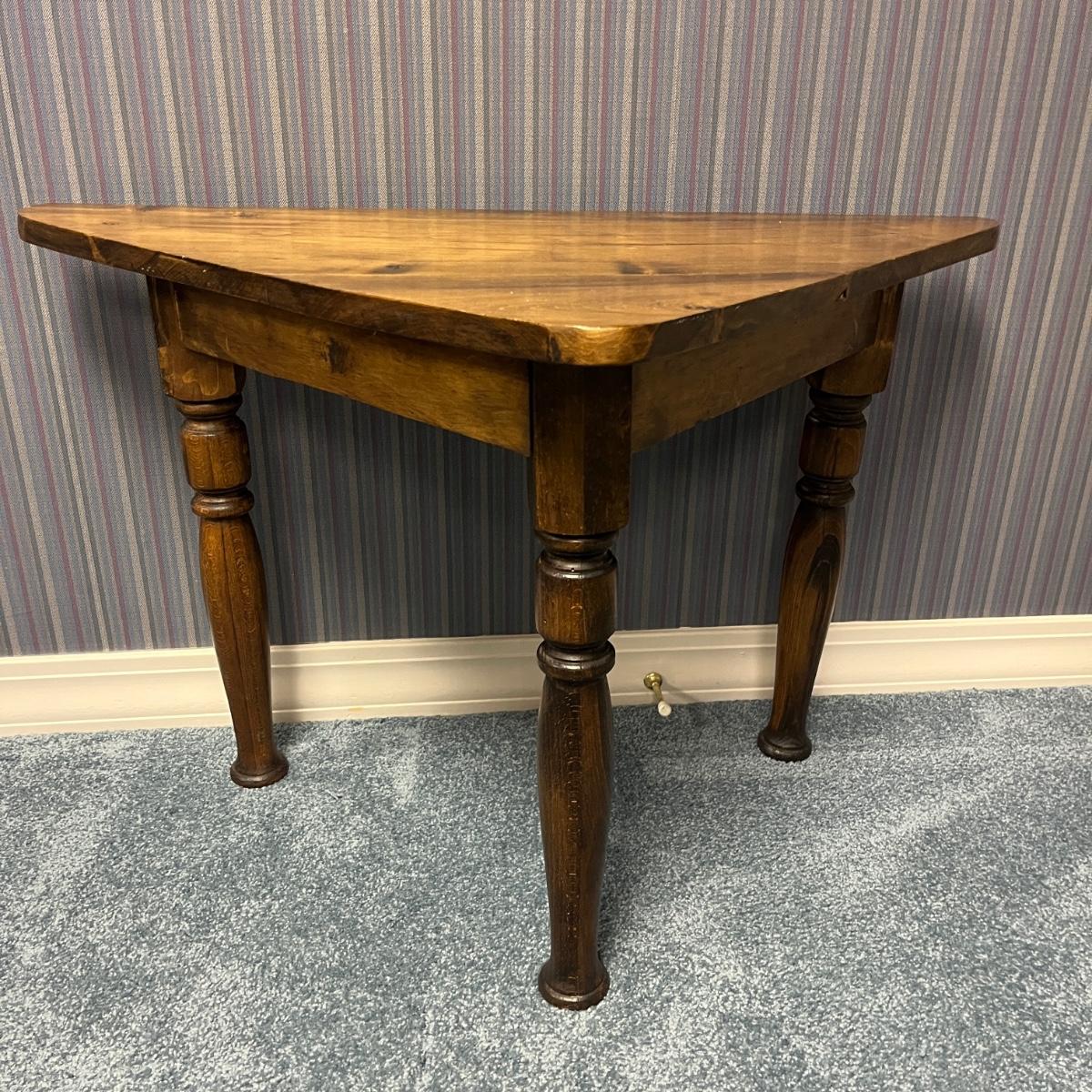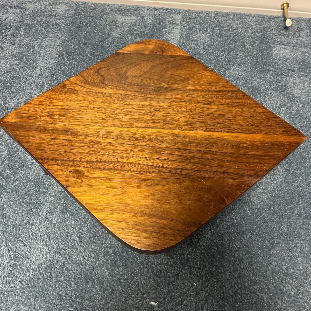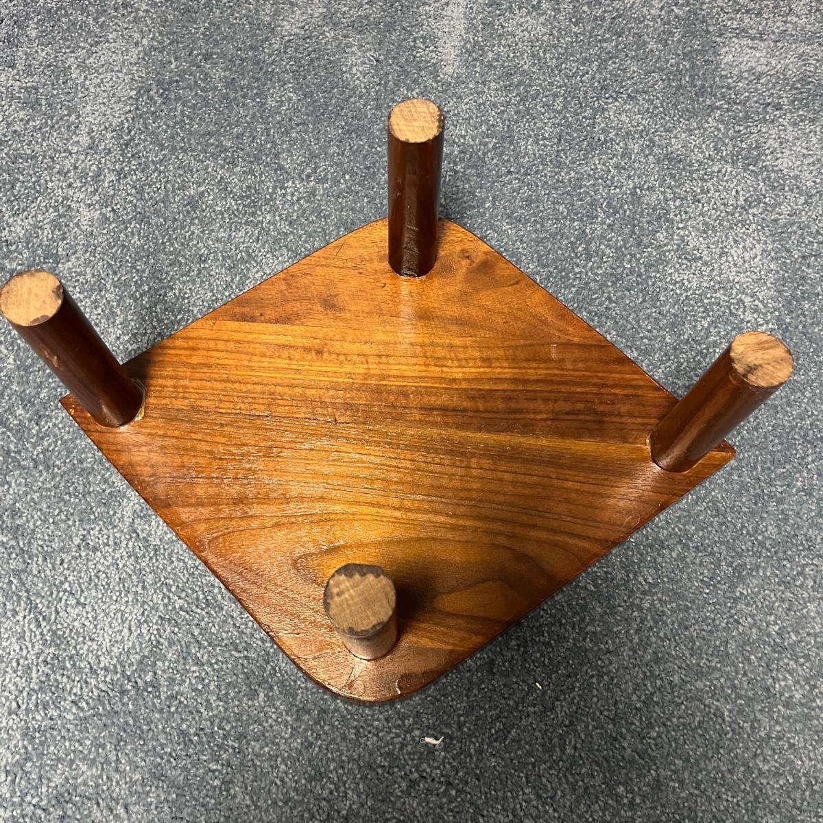Triangle shaped side table measures 31” x 16.5” x 19.5”H and is solid wood. Also includes a diamond shaped solid wood foot stool.