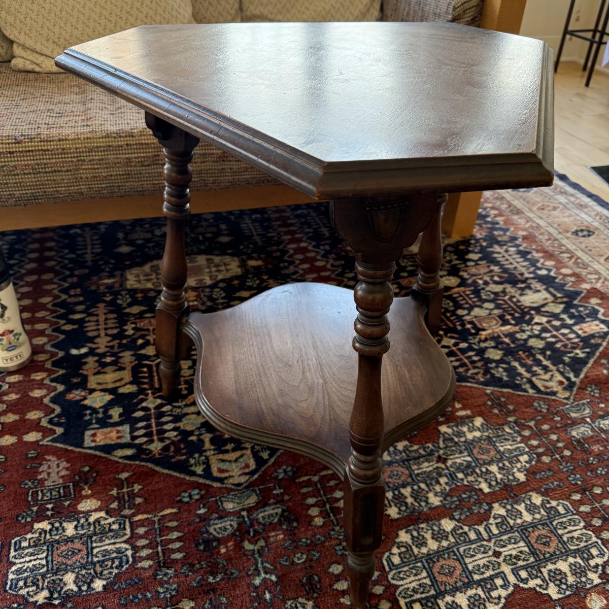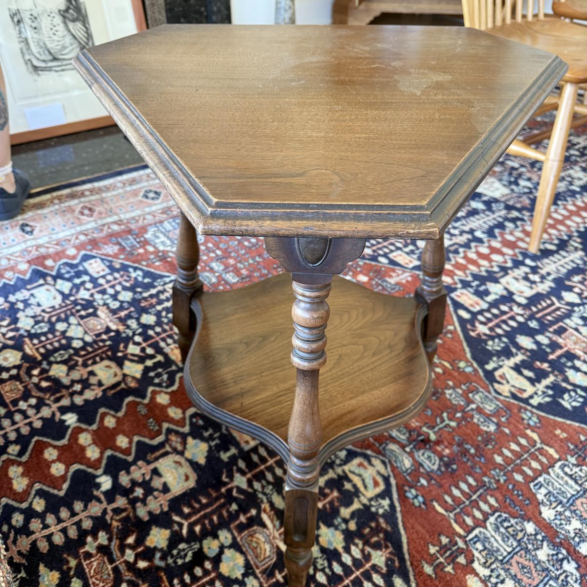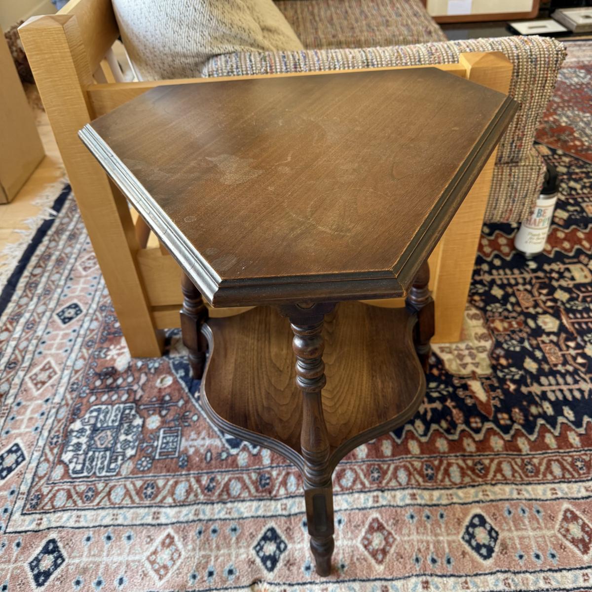 This lot contains a two tiered wooden side table. This item measures 21.5” x 21.5” x 25”H, the second tier stands 8”H. This item has three legs. One leg appears to be a bit popped out and there are some stains on the finish on the surface. See pictures for details. Local pick up only.
