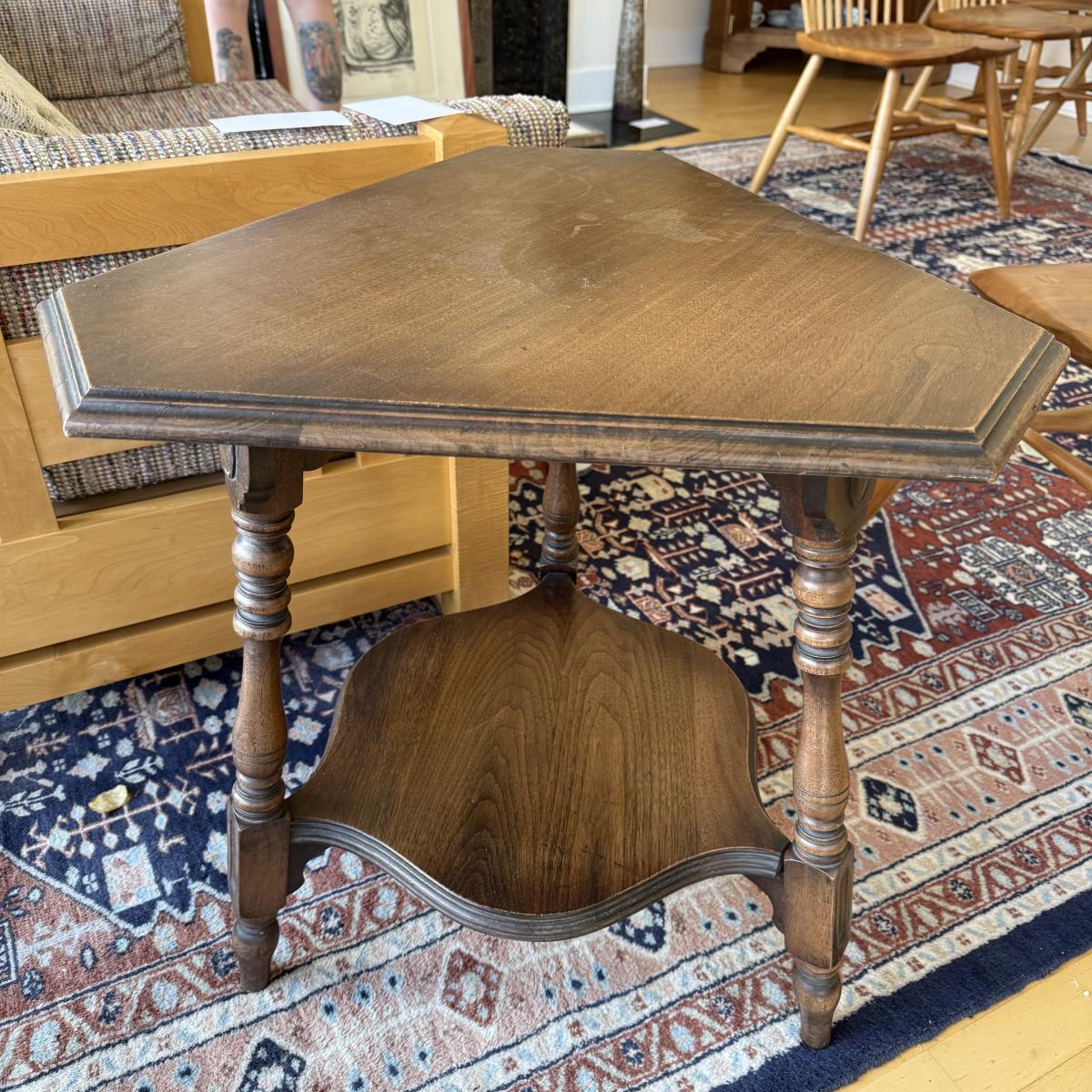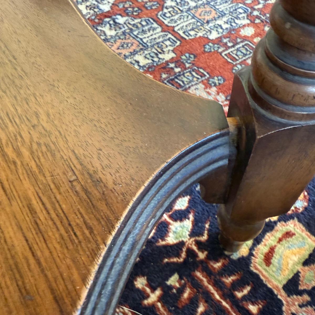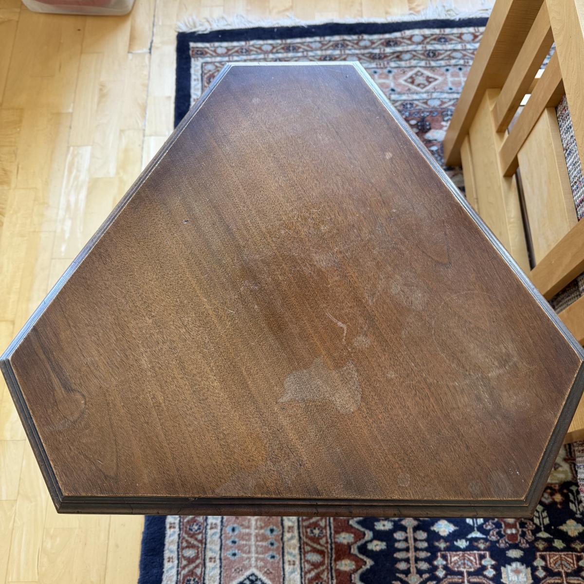 This lot contains a two tiered wooden side table. This item measures 21.5” x 21.5” x 25”H, the second tier stands 8”H. This item has three legs. One leg appears to be a bit popped out and there are some stains on the finish on the surface. See pictures for details. Local pick up only.