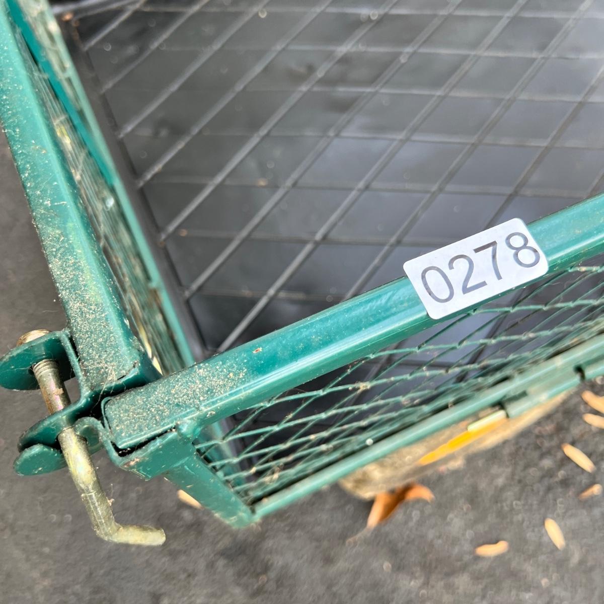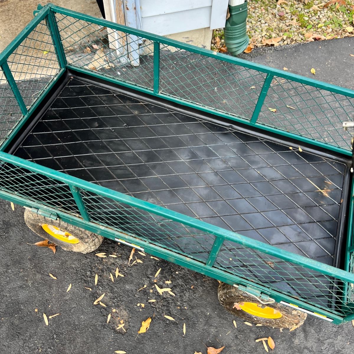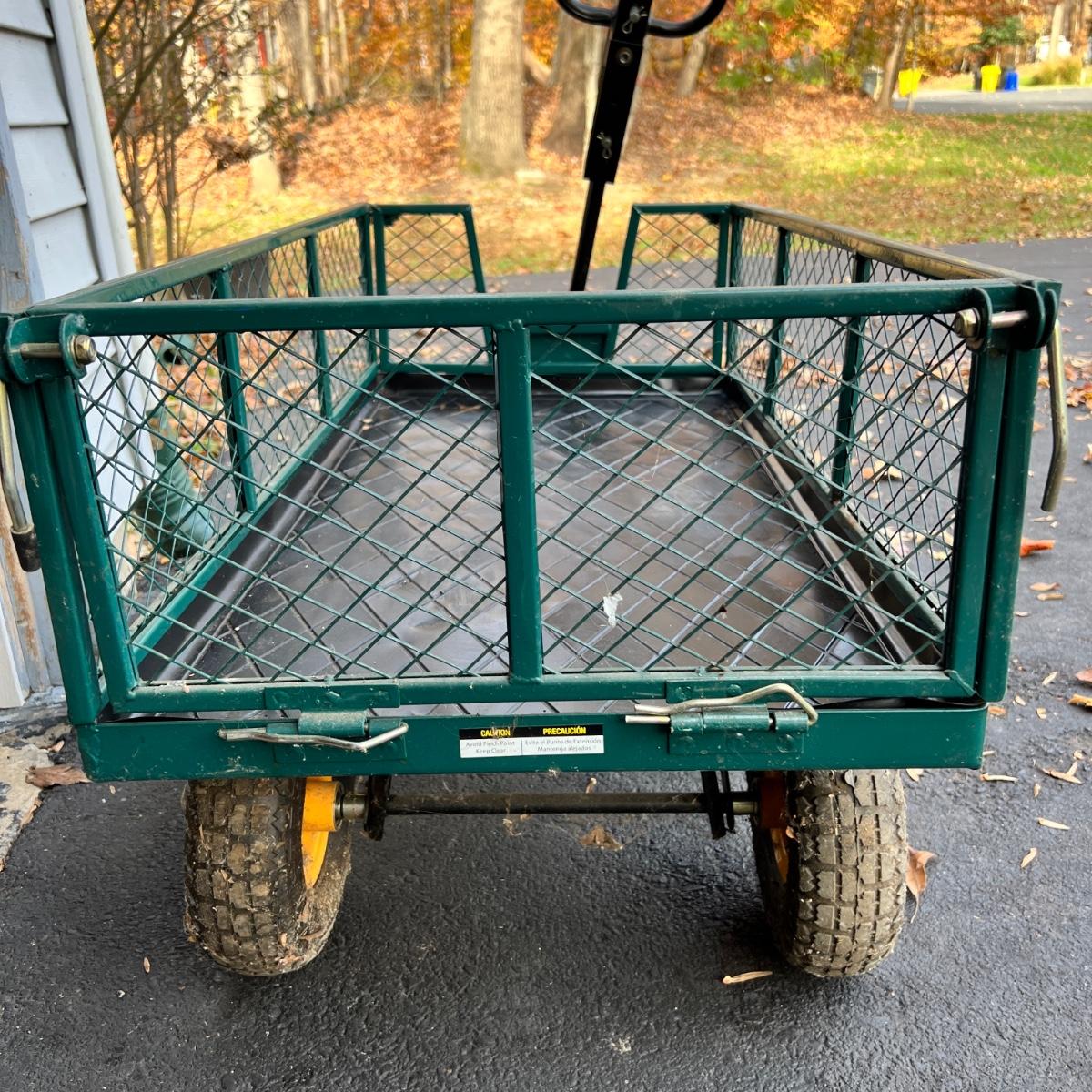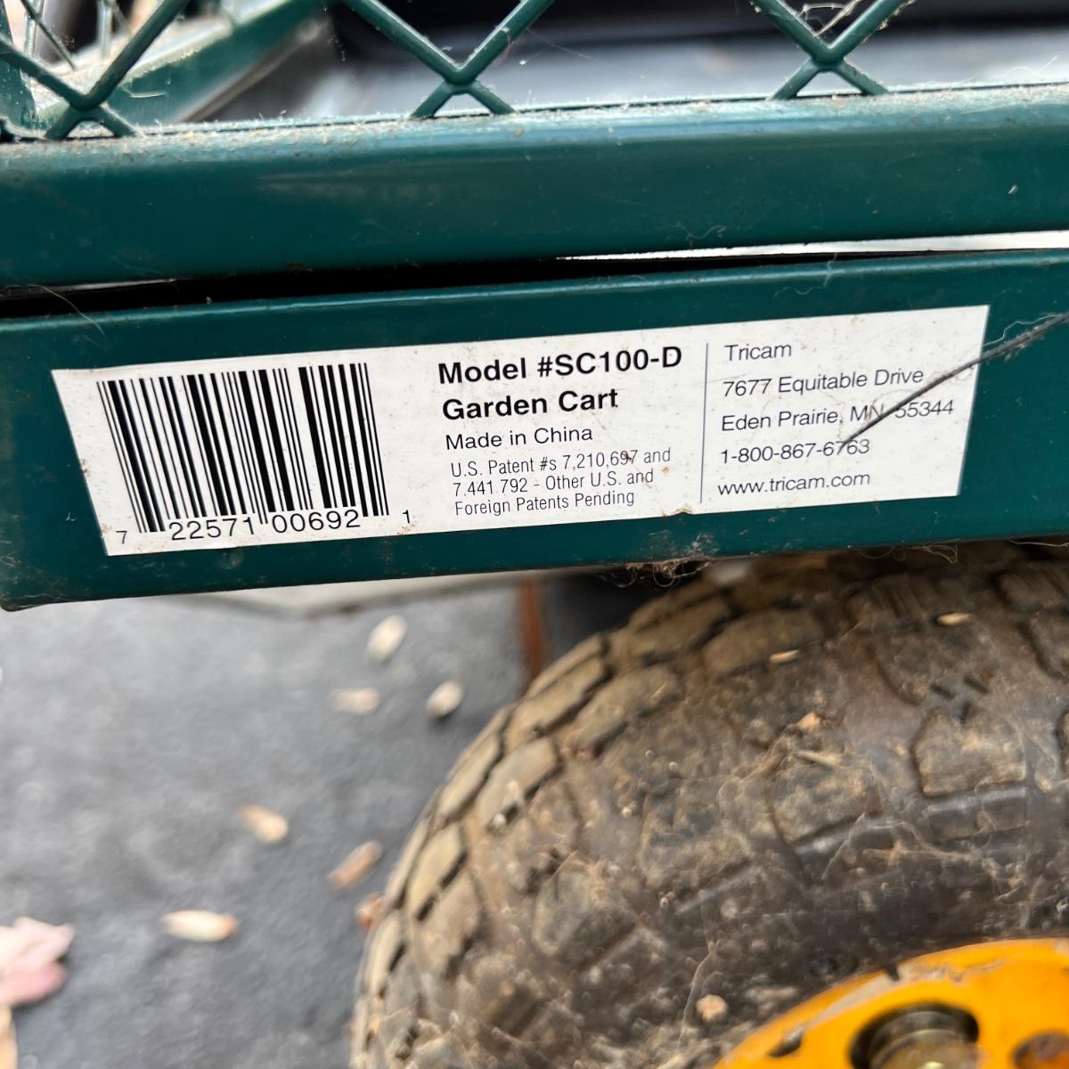 Metal garden cart with collapsible sides and inflatable tires; Painted metal; Marked "Tricam", Model No SC100-D; Measures approximately H 22 x W 21 x D 42 excluding handle. NOTE: PICK UP ONLY IN DUNKIRK MD.